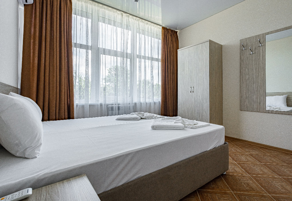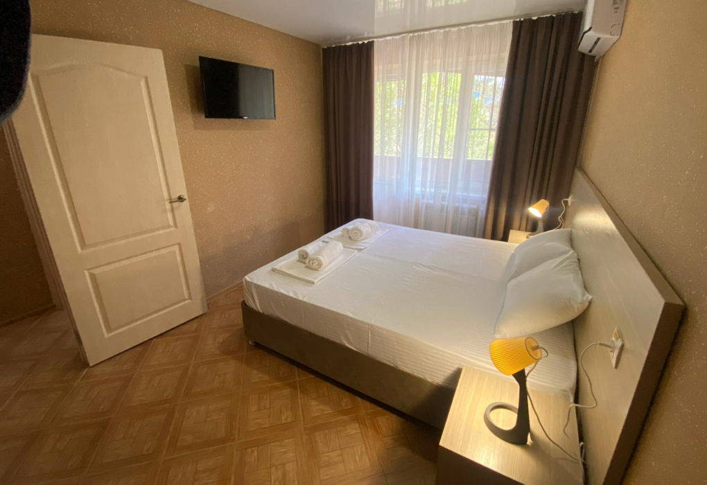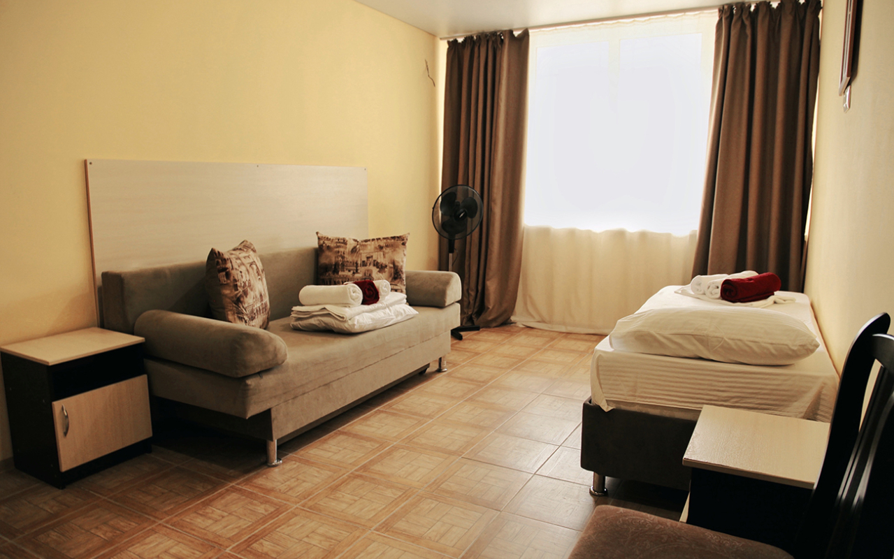 Площадь номера - 20 кв.м. 1 комната. 2 осн. места. В номере: телевизор; холодильник; кондиционер; душ; 1-спальные/ 2-спальная кровать; балкон (в части номеров); санузел. 1 доп. место: