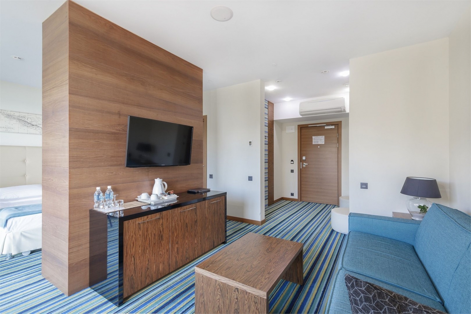 Помимо двуспальной кровати в номере установлен двухместный мягкий диван, благодаря чему, здесь могут разместиться 4 постояльца.
