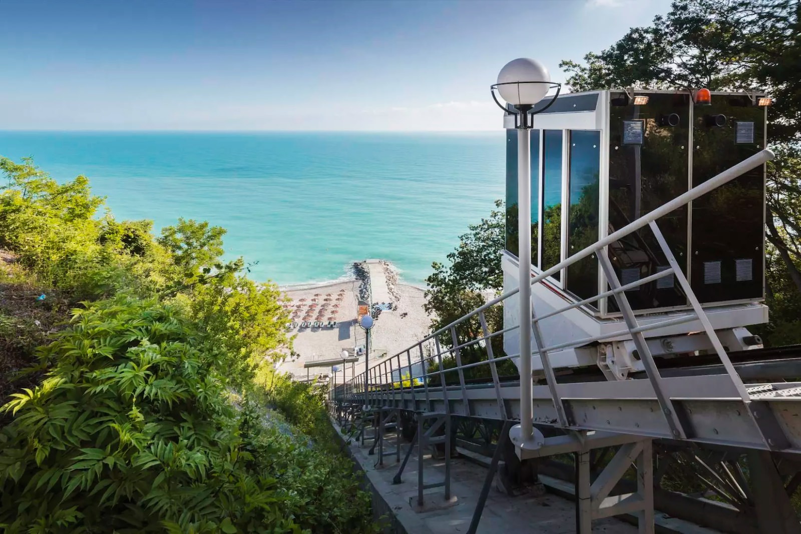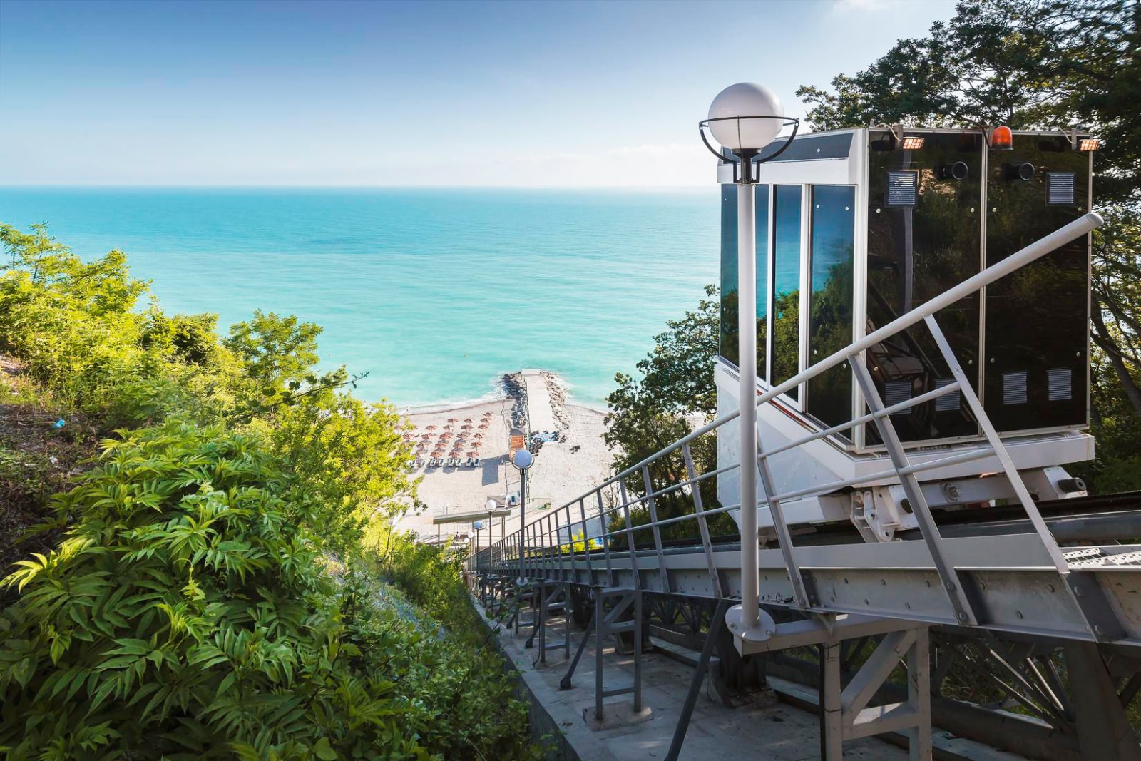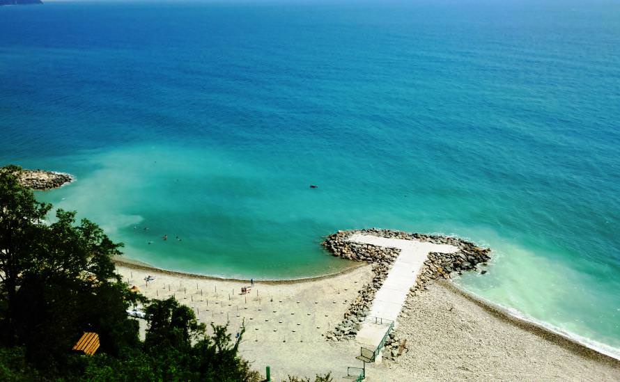 Собственный пляж, покрытый хорошо обкатанной галькой, оборудован удобными шезлонгами, лежа на которых, очень приятно принимать солнечные ванны после купания в Черном море. Спуститься к нему можно либо по лестнице, идущей от ресторана, либо на фуникулере.