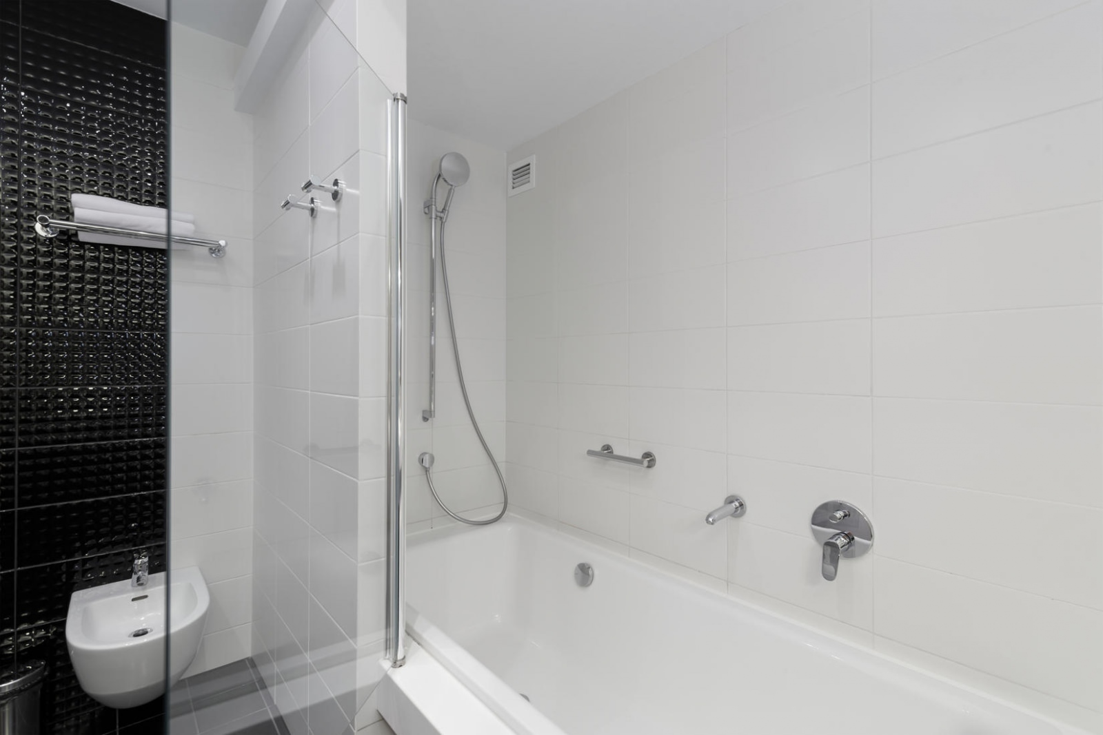Ванная комната оснащена банными принадлежностями, ванной, душем, биде и феном.