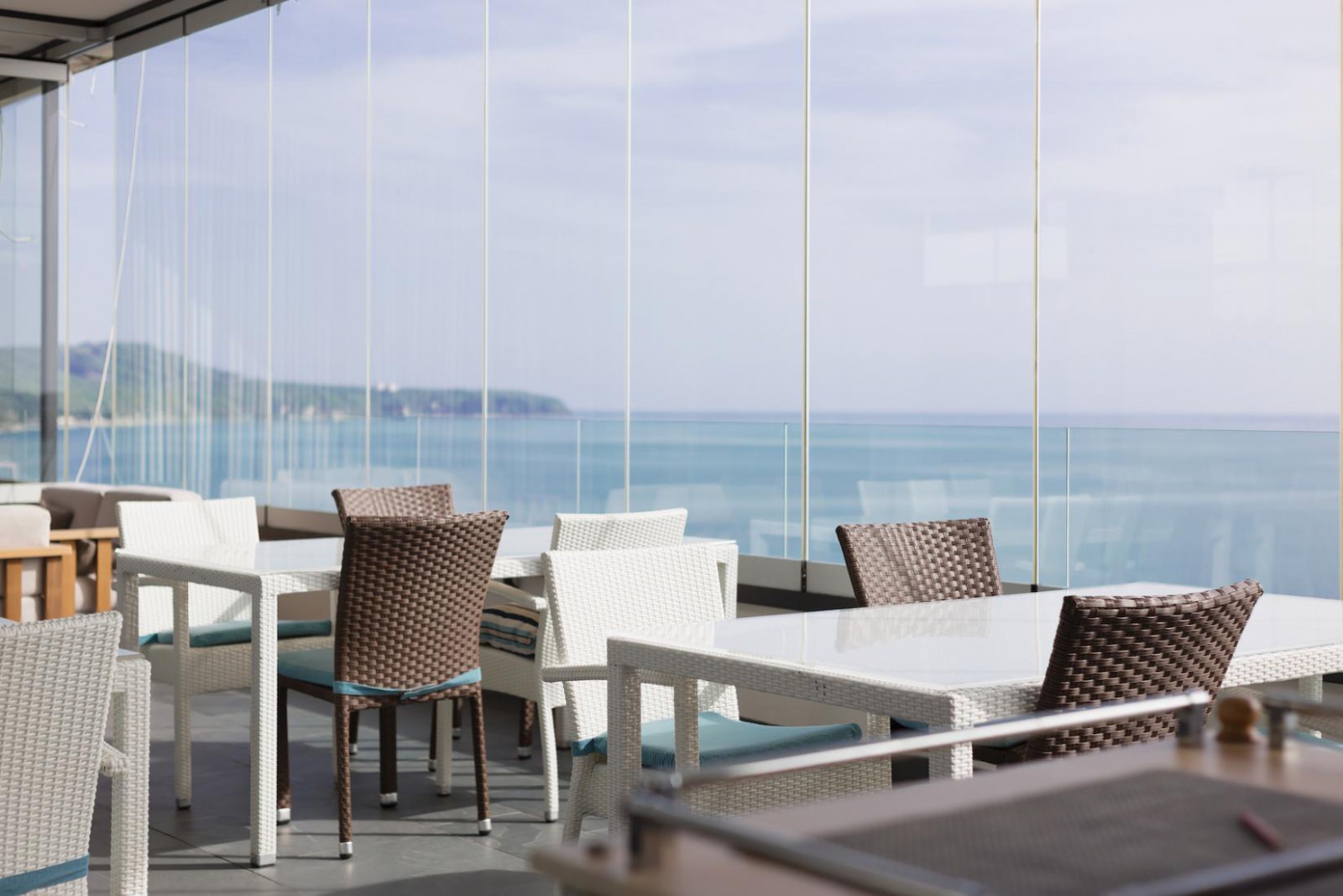 Отдельно стоит выделить стильный интерьер в светлых и морских оттенках, красивый вид на горы из окна.