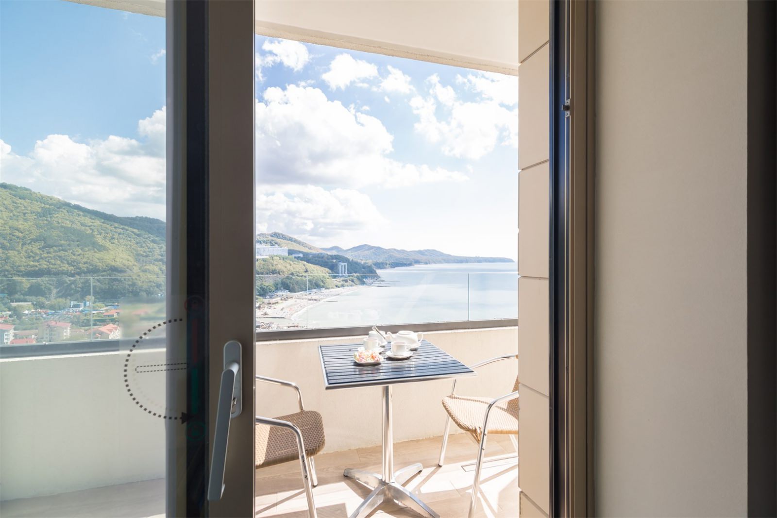 Постояльцы оценят качественное оснащение, красивый интерьер — уютную и романтичную атмосферу. За окном видны горы. Гости оценят приятный интерьер: отделка, мебель и текстиль в светлых и морских оттенках.