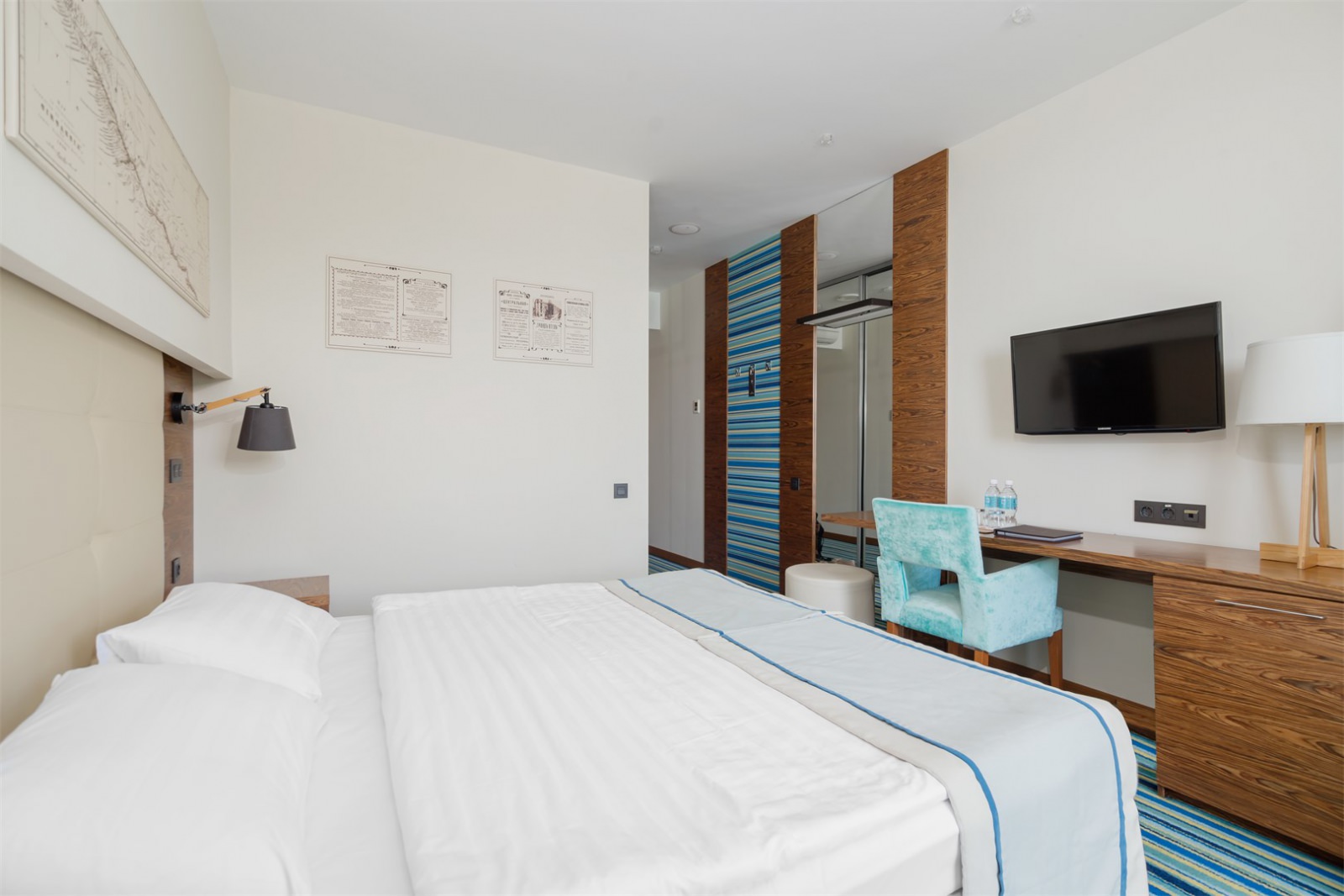 Интерьер номера — это гармоничное сочетание светлых и морских оттенков, элементов дерева. Гости, выбирая данный номер, выбирают комфортабельные условия для отдыха и даже работы. Оснащение номера: мягкие кровати, бытовая техника, сейф, Wi-Fi, письменный стол.