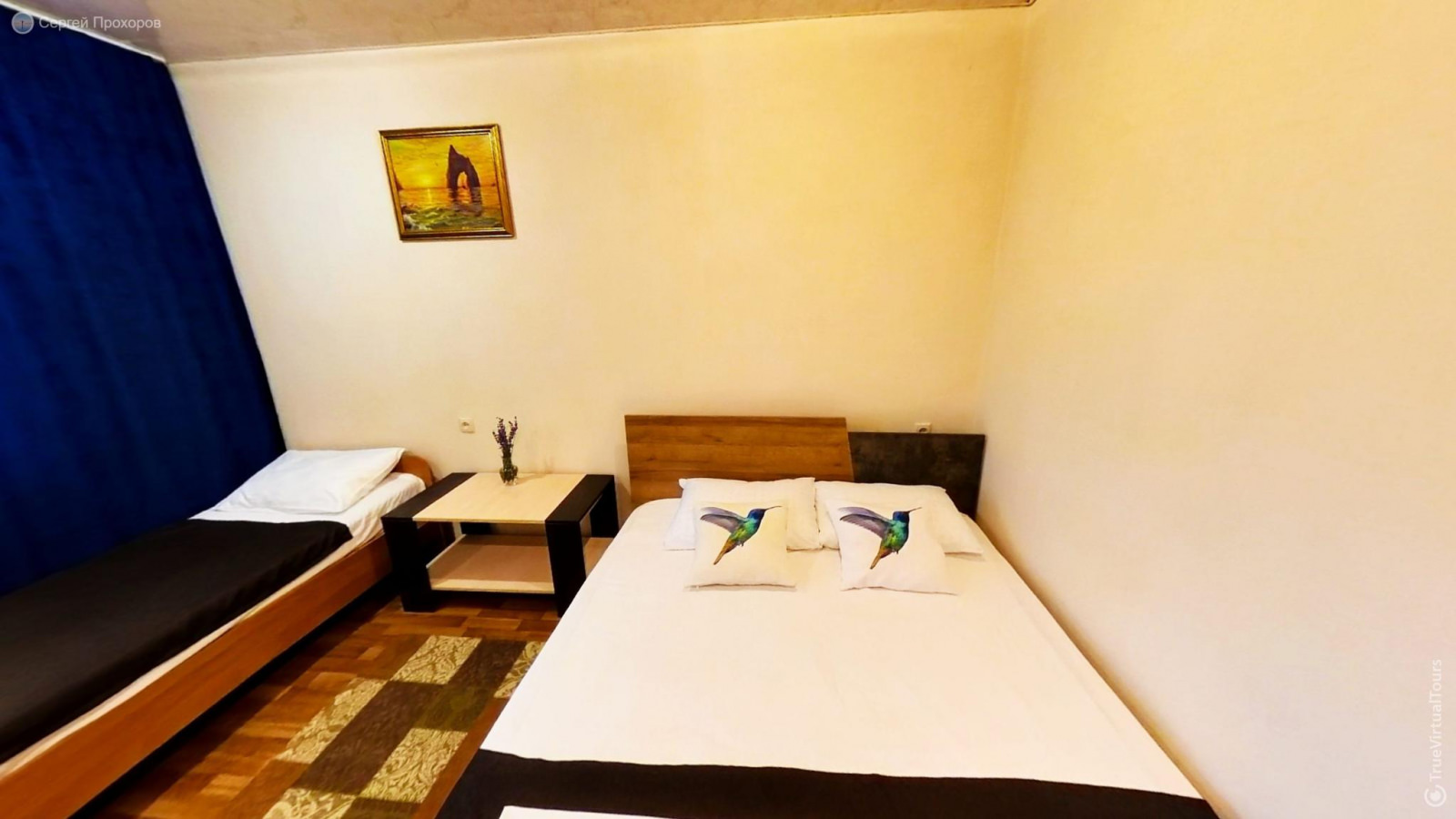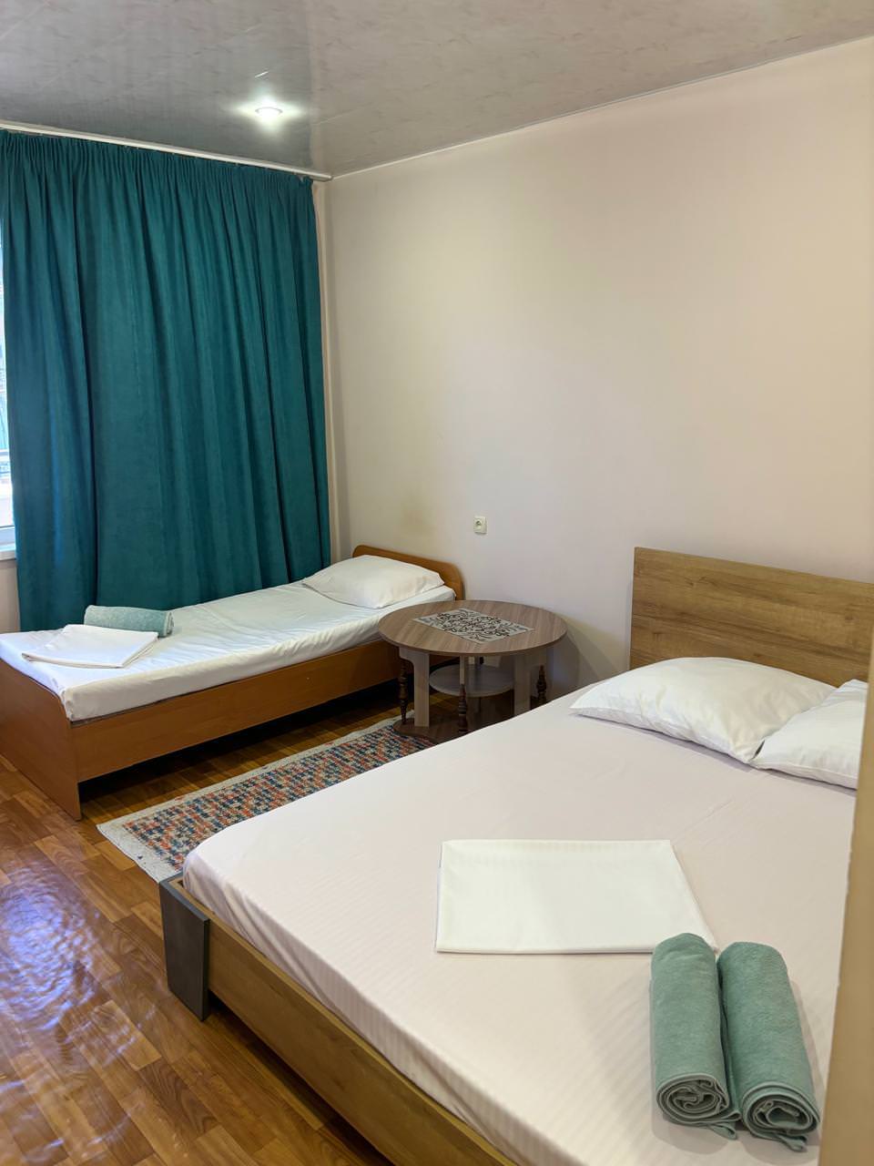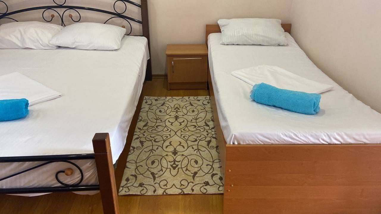 Номер эконом общей площадью 14 кв.м. для размещения до 3-х гостей (включая дополнительное место). Оснащение номера: двухспальная кровать, дополнительное место- односпальная кровать, телевизор, мини-холодильник, постельное белье и полотенца, ванная комната с душем.