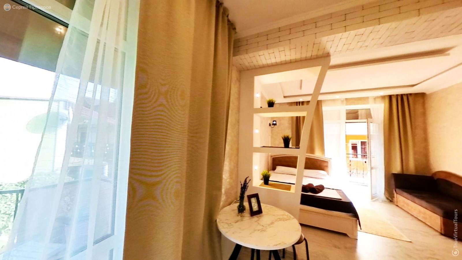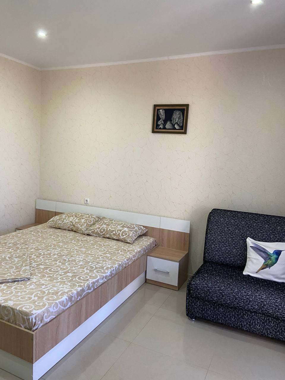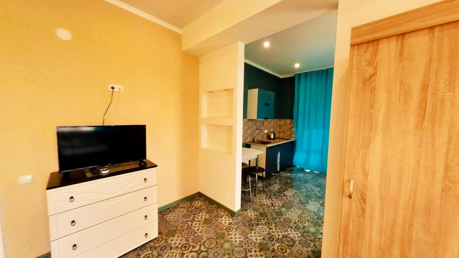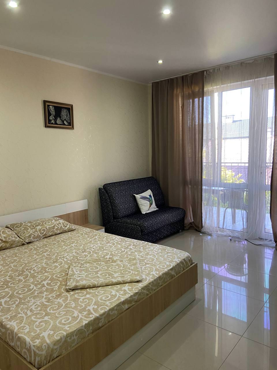 Номер студия с балконом общей площадью 29 кв.м. для размещения до 3-х гостей (включая дополнительное место). Оснащение номера: двухспальная кровать, дополнительное место- односпальная кровать, телевизор, оснащенная кухня, чайник, кондиционер, холодильник, электрическая плита, необходимая посуда, постельное белье и полотенца, ванная комната с душем.
