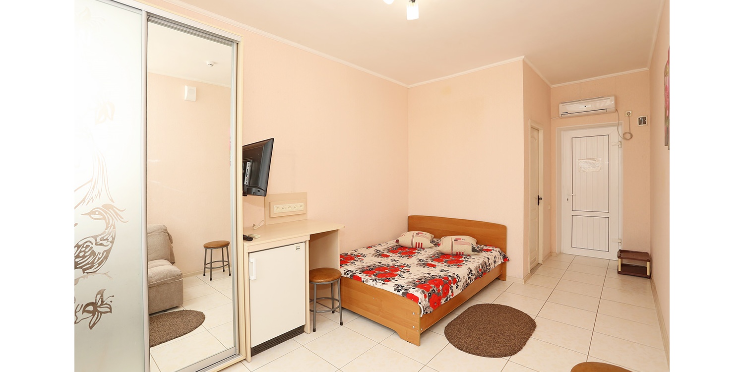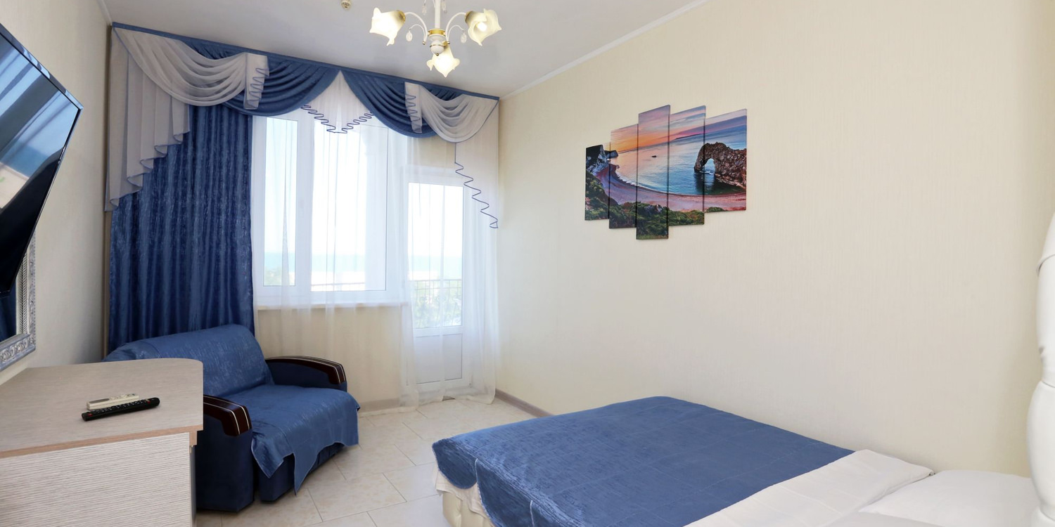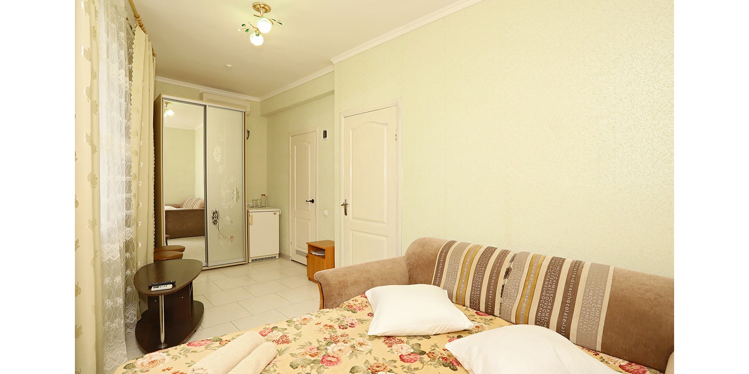 3 осн. места. 1 доп. место. Мебель: вешалка, зеркало, кровать двуспальная, кровать односпальная (или кресло-кровать), прикроватные тумбочки, стол, стулья, шкаф. Оборудование: мини-холодильник, сплит-система, телевизор. Санузел: с душем, туалетные принадлежности. Сервис: Wi-Fi бесплатно, смена полотенец, смена постельного белья, уборка номера.