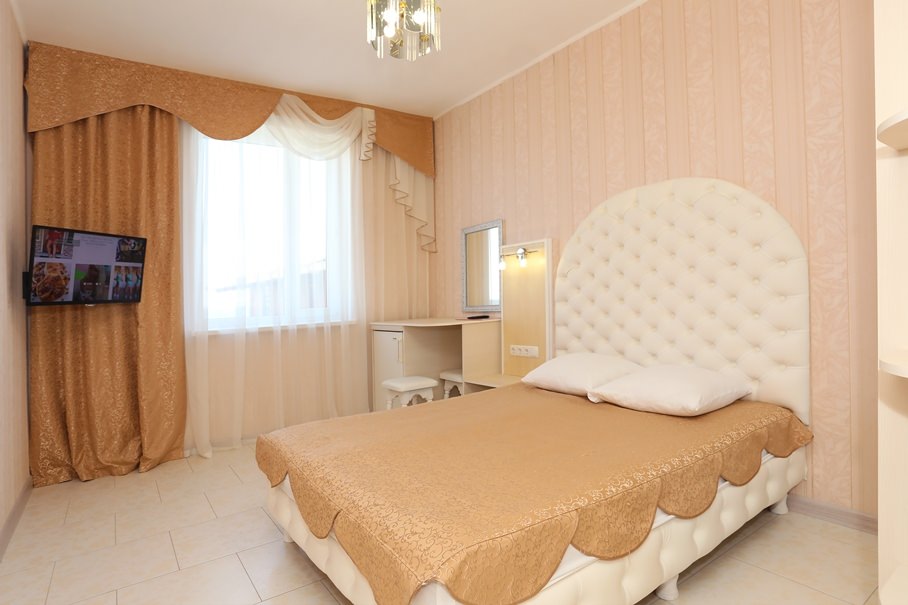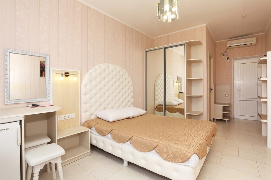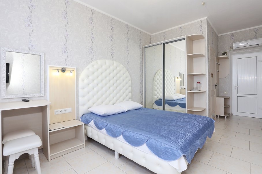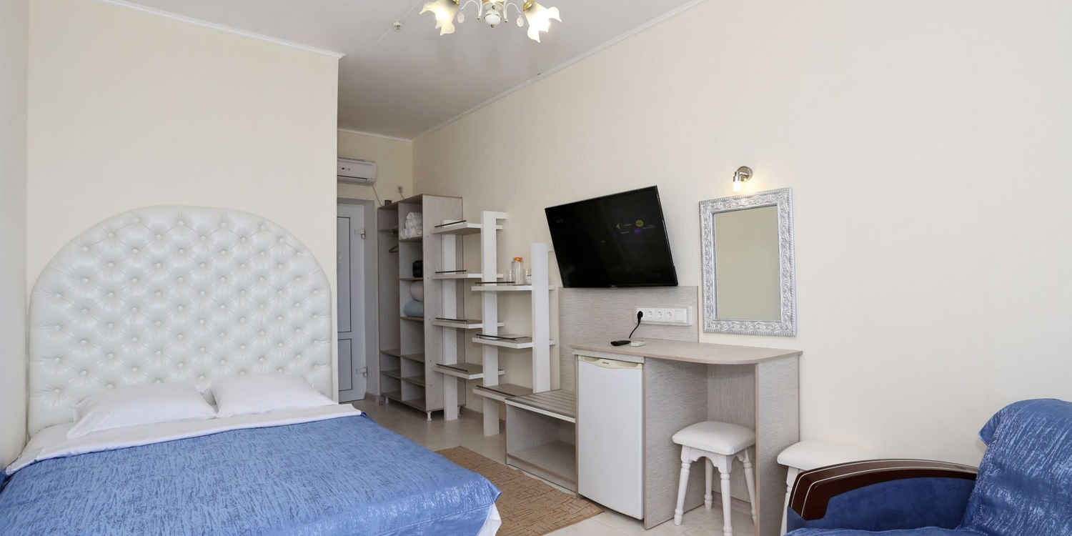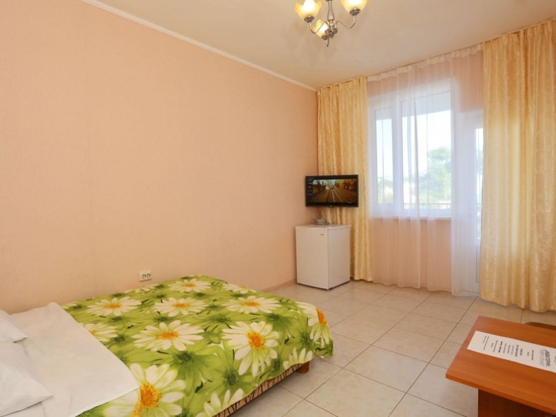 3 осн. места. 1 доп. место. Мебель: вешалка, зеркало, кровать двуспальная, кровать односпальная (или кресло-кровать), прикроватные тумбочки, стол, стулья, шкаф. Оборудование: мини-холодильник, сплит-система, телевизор. Санузел: с душем, туалетные принадлежности. Сервис: Wi-Fi бесплатно, смена полотенец, смена постельного белья, уборка номера.