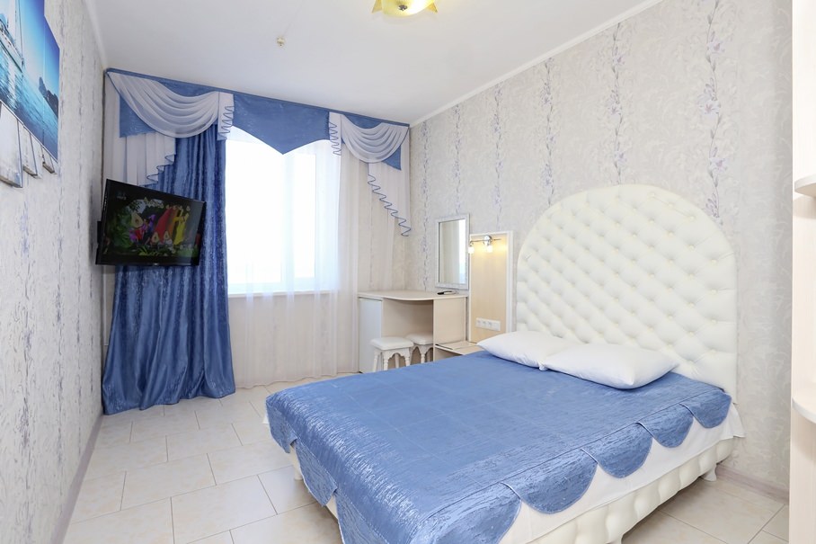 2 осн. места. Мебель: вешалка, зеркало, кровать двуспальная, прикроватные тумбочки, стол, стулья, шкаф. Оборудование: мини-холодильник, сейф, сплит-система, телевизор. Санузел: с душем, туалетные принадлежности, фен. Сервис: Wi-Fi бесплатно, смена полотенец, смена постельного белья, уборка номера.