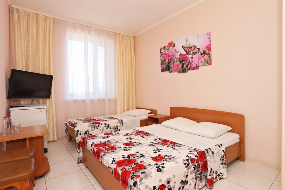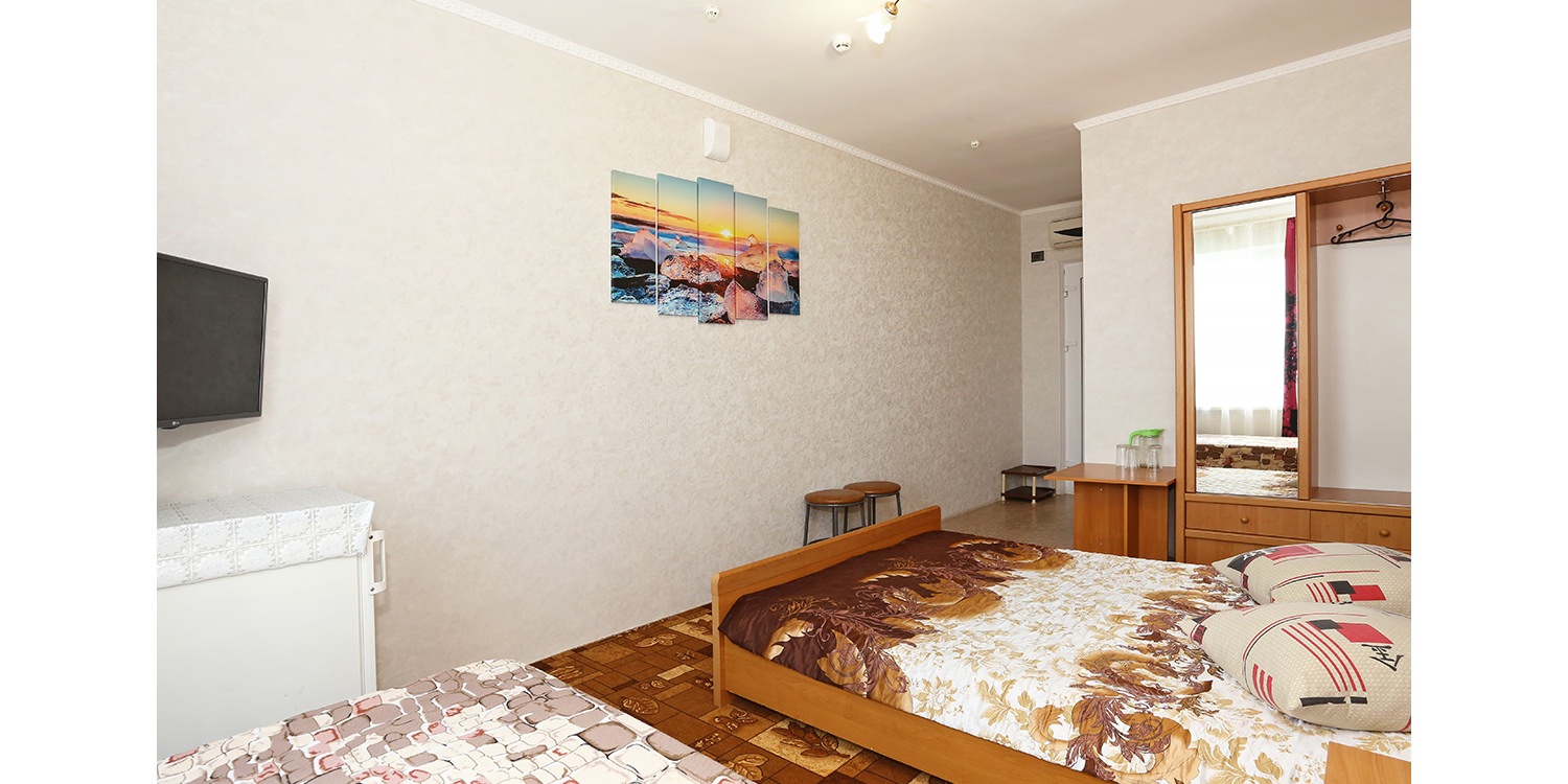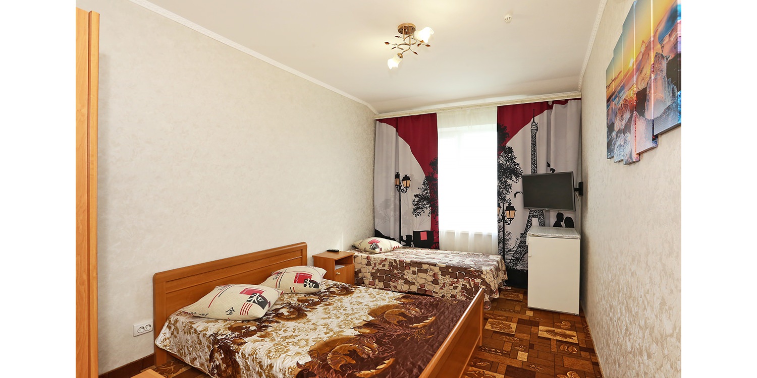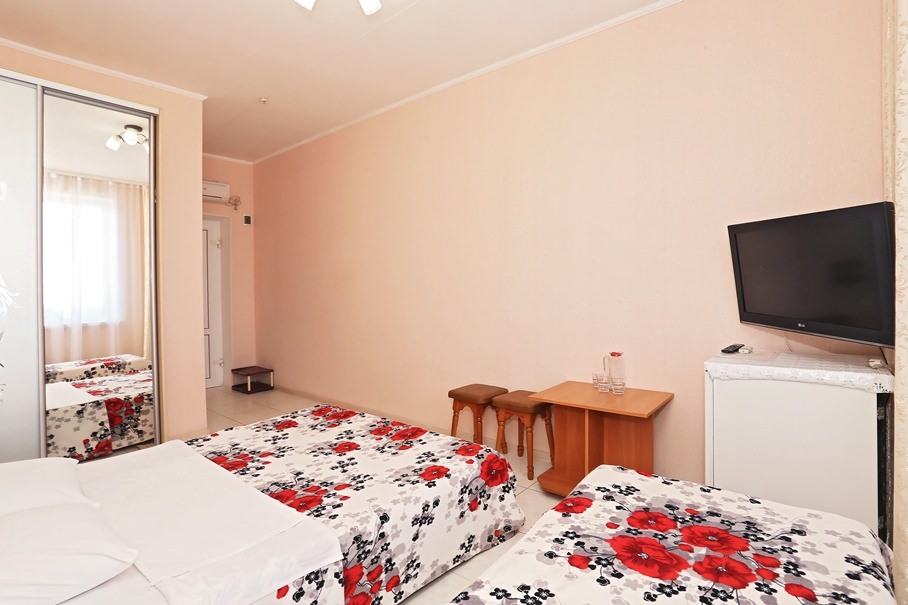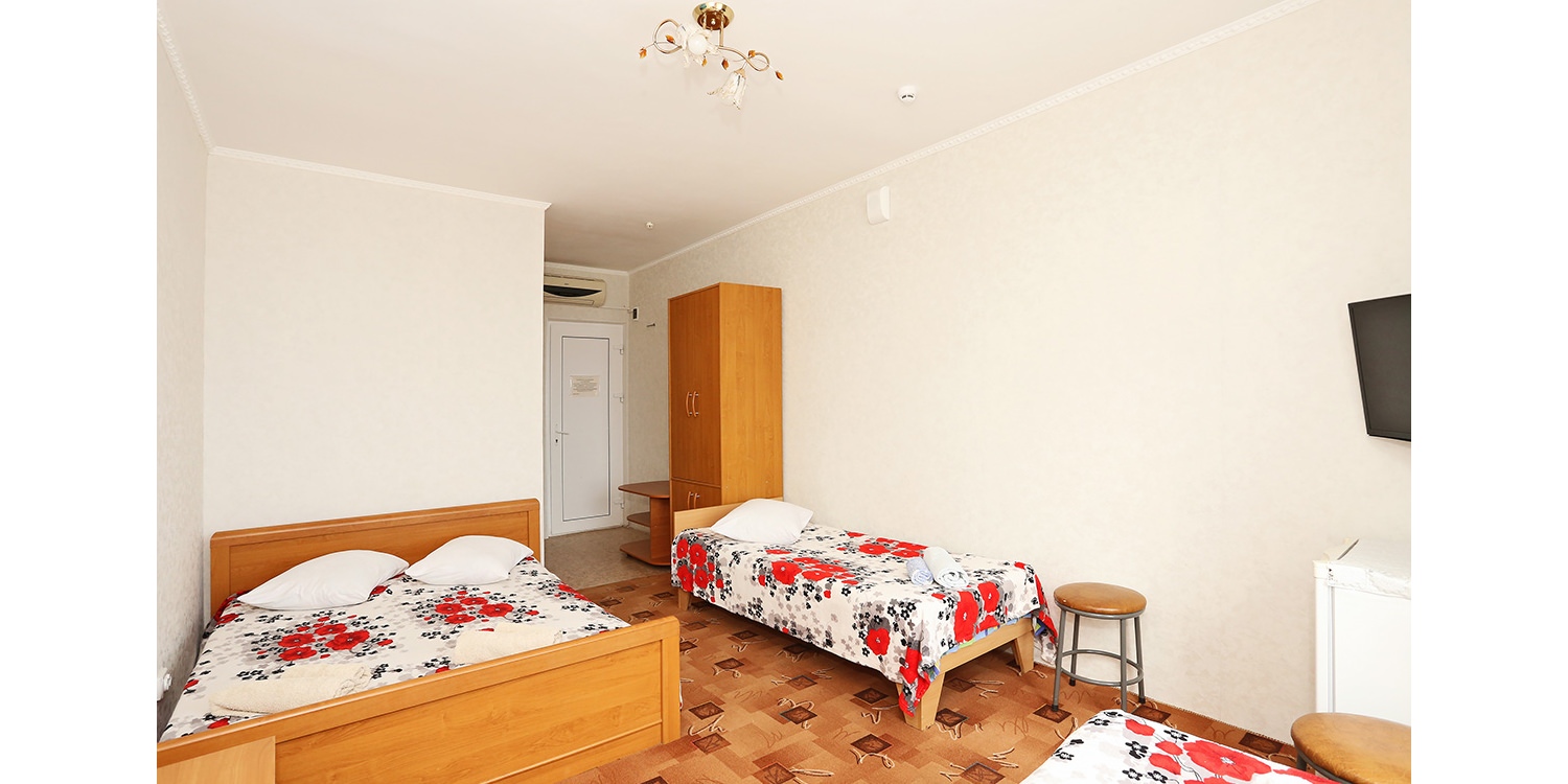 2 осн. места. 1 доп. место. Мебель: вешалка, зеркало, кровати односпальные /одна двуспальная кровать (или диван-кровать), прикроватные тумбочки, стол, стулья, шкаф. Оборудование: мини-холодильник, сплит-система, телевизор. Санузел: с душем, туалетные принадлежности. Сервис: Wi-Fi бесплатно, смена полотенец, смена постельного белья, уборка номера.