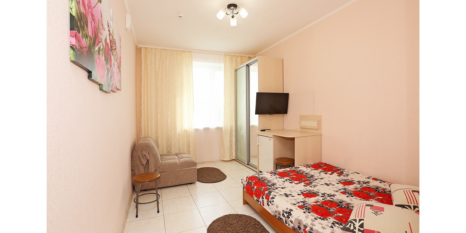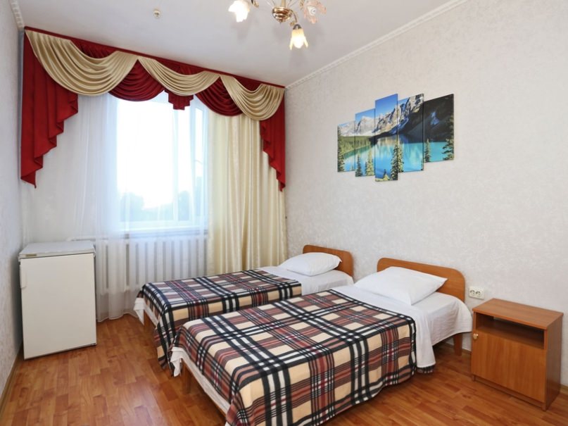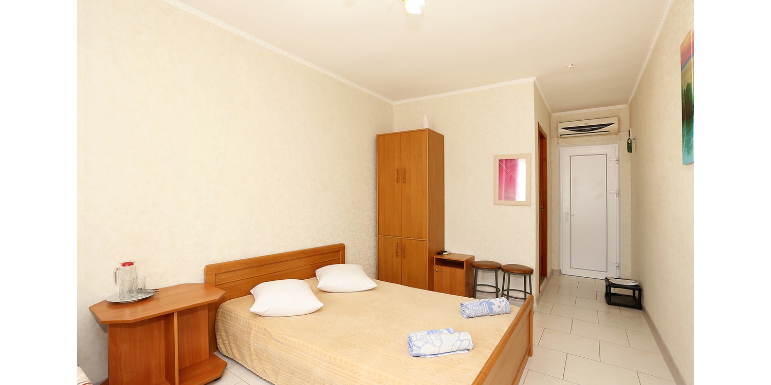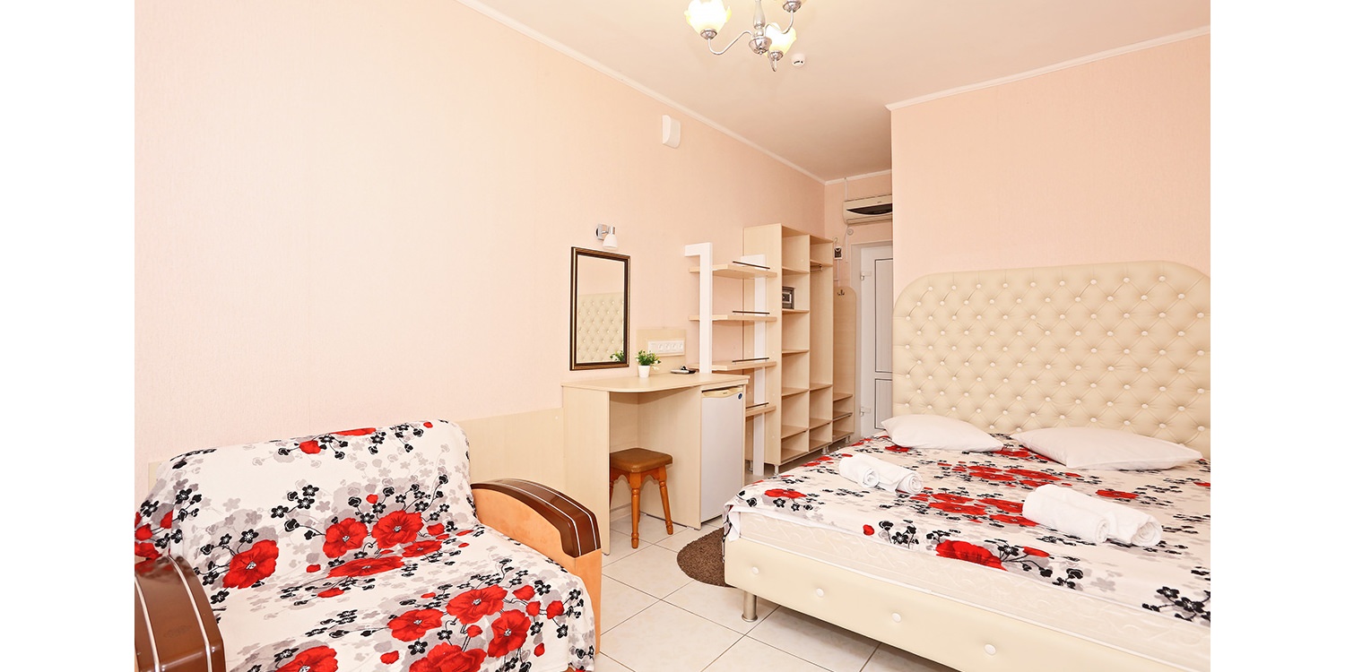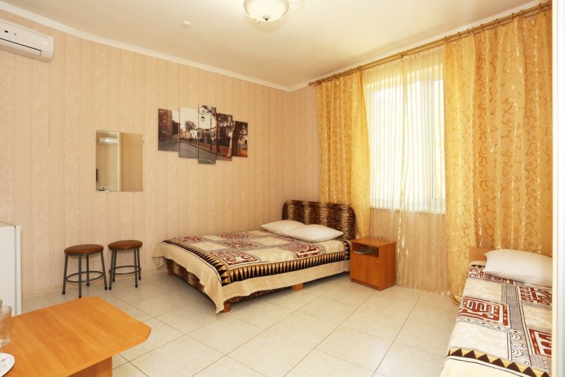 2 осн. места. 1 доп. место. Мебель: вешалка, зеркало, кровати односпальные /одна двуспальная кровать (или диван-кровать), прикроватные тумбочки, стол, стулья, шкаф. Оборудование: мини-холодильник, сплит-система, телевизор. Санузел: с душем, туалетные принадлежности. Сервис: Wi-Fi бесплатно, смена полотенец, смена постельного белья, уборка номера.