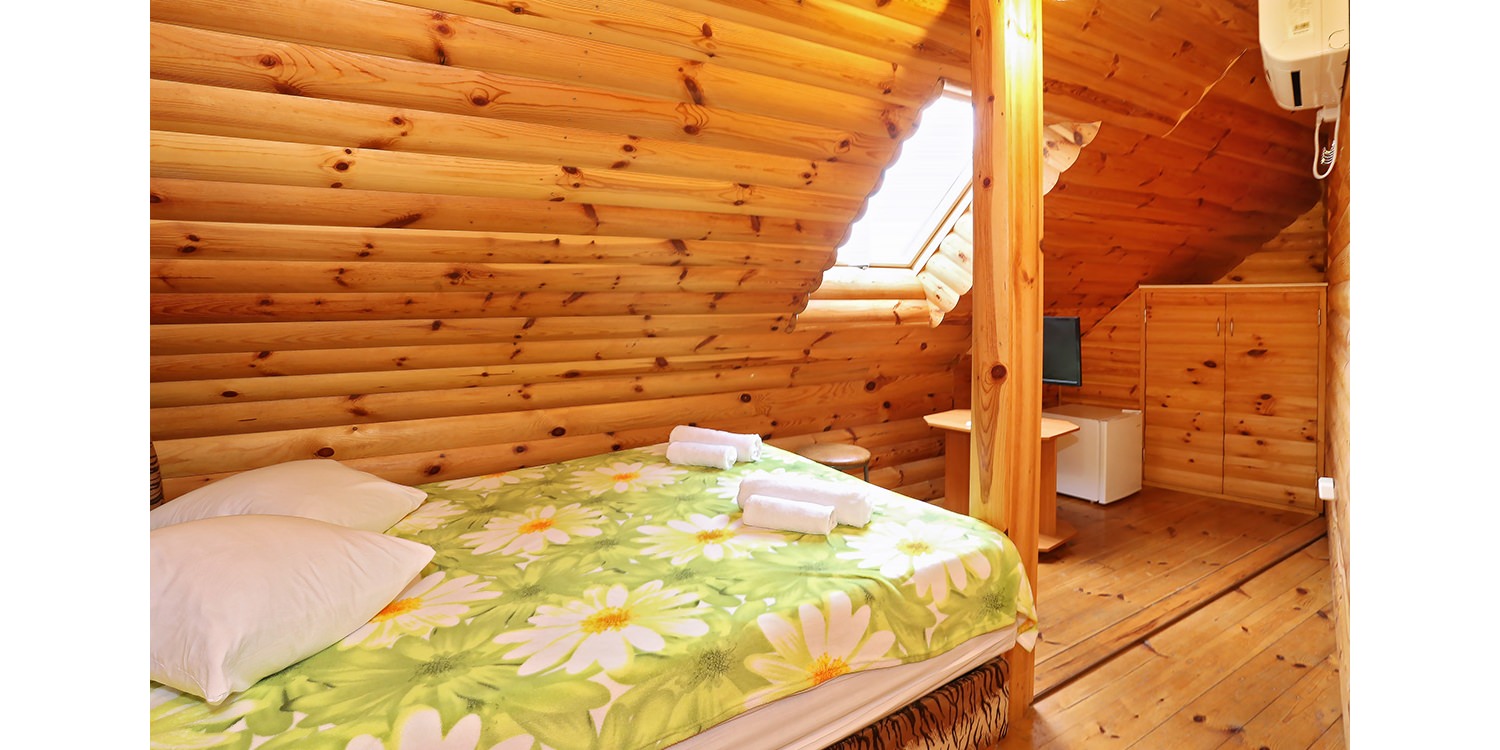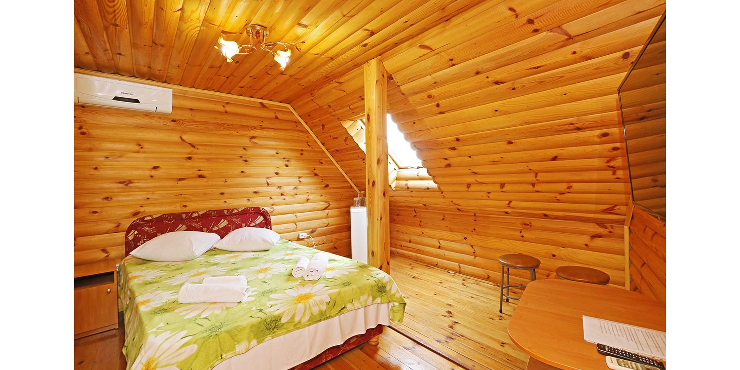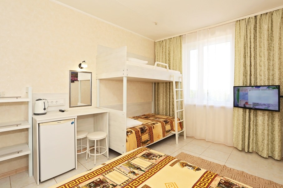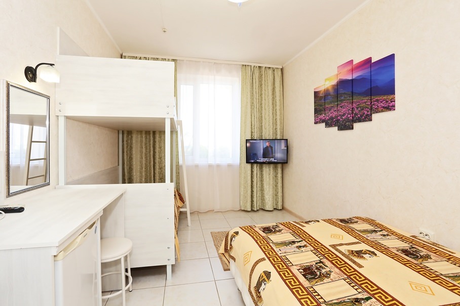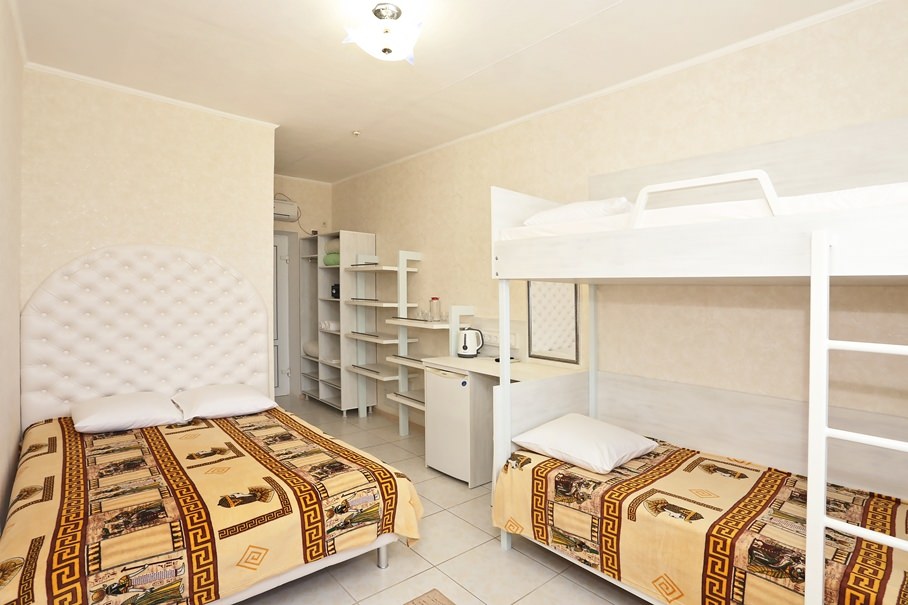 4 осн. места. Мебель: вешалка, зеркало, кровать двуспальная, кровать двухъярусная, прикроватные тумбочки, стол, стулья, шкаф. Оборудование: мини-холодильник, сплит-система, телевизор. Санузел: с душем, туалетные принадлежности. Сервис: Wi-Fi бесплатно, смена полотенец, смена постельного белья, уборка номера.