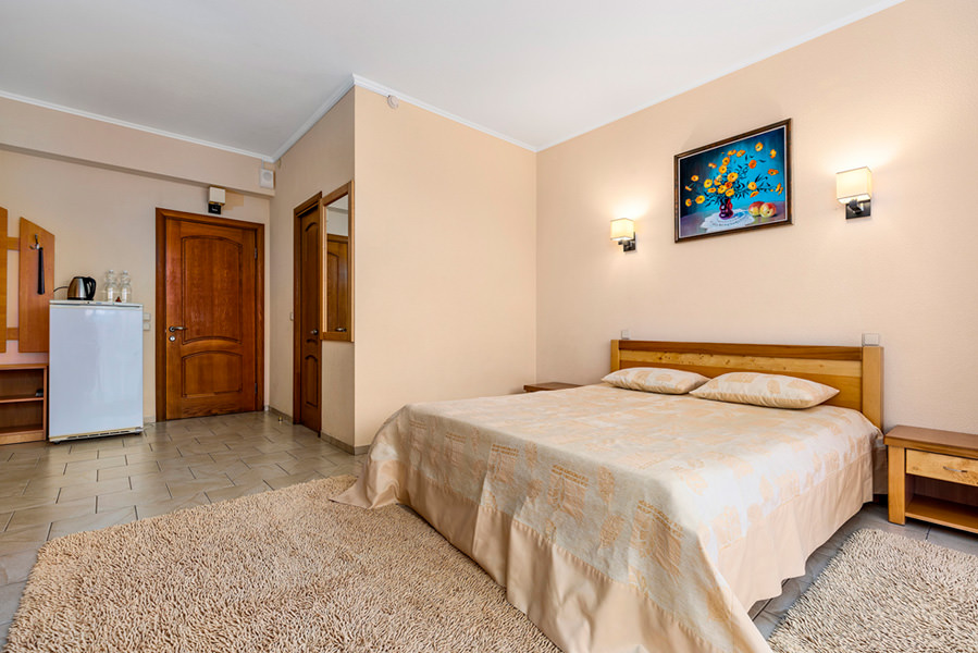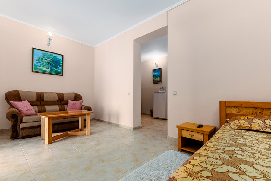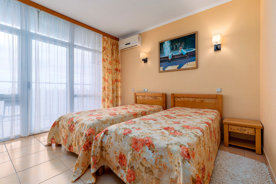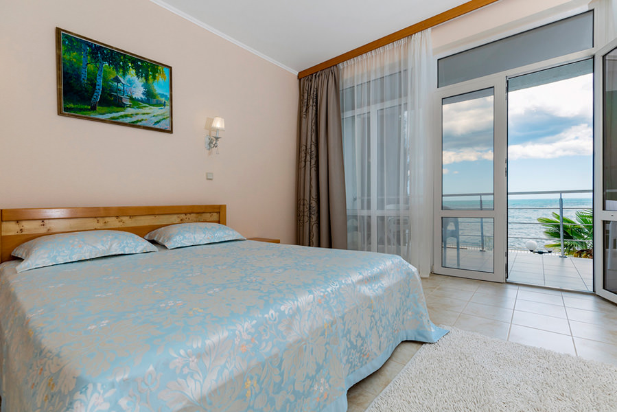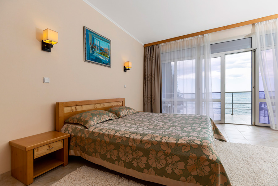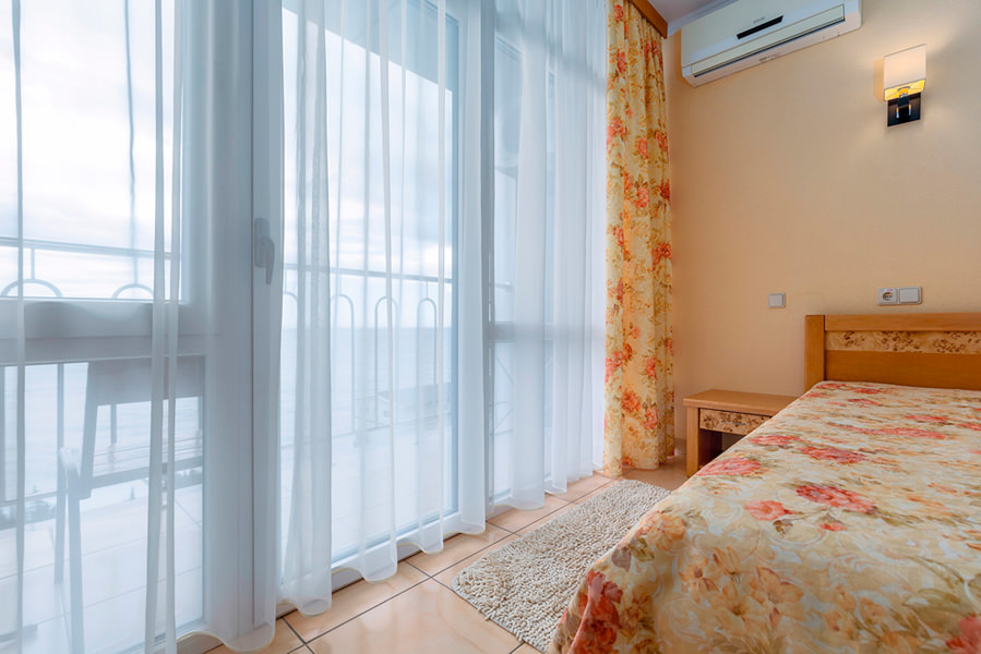 Номер имеет выход на балкон с видом на морскую гладь. Из бытовых удобств в номере есть телевизор, холодильник, чайник. Мебель в номере очень удобная, застелена качественным постельным бельем. Оснащен кондиционером.