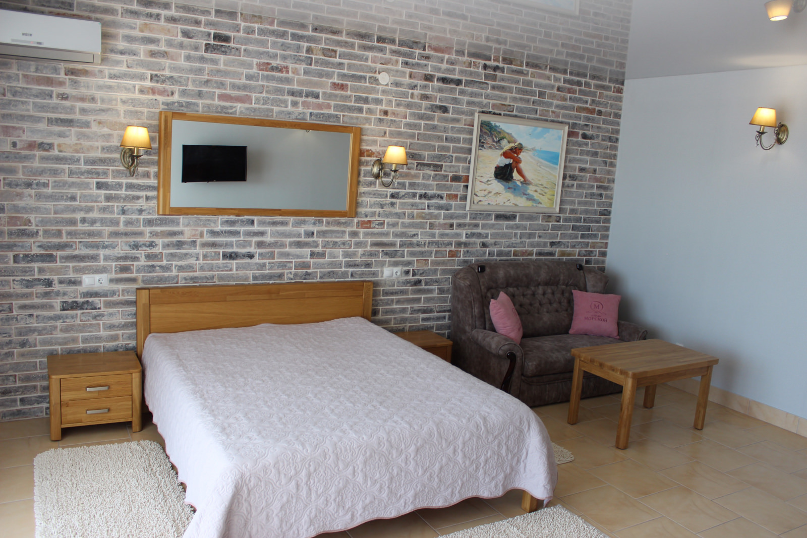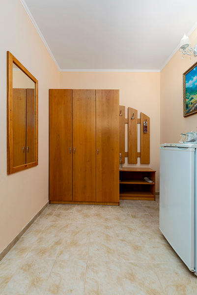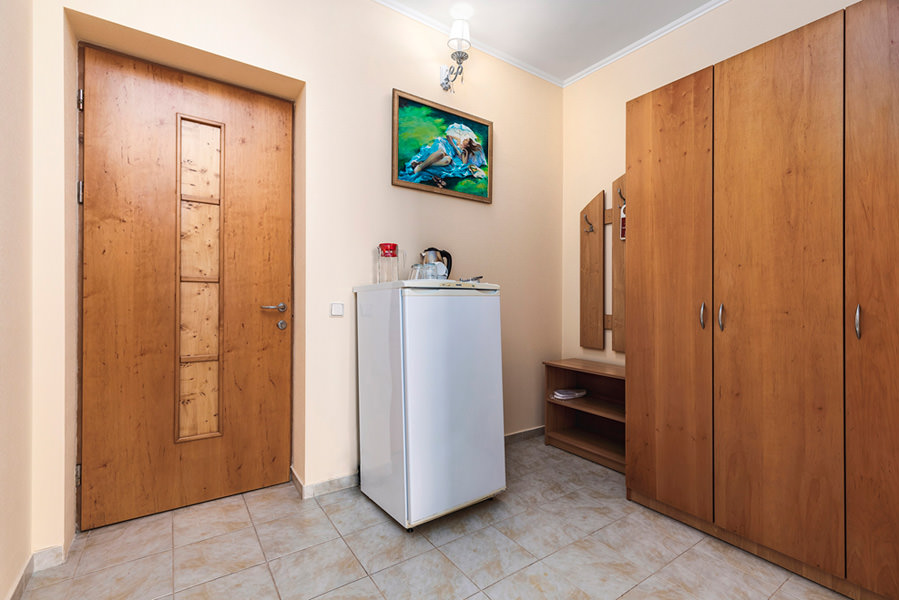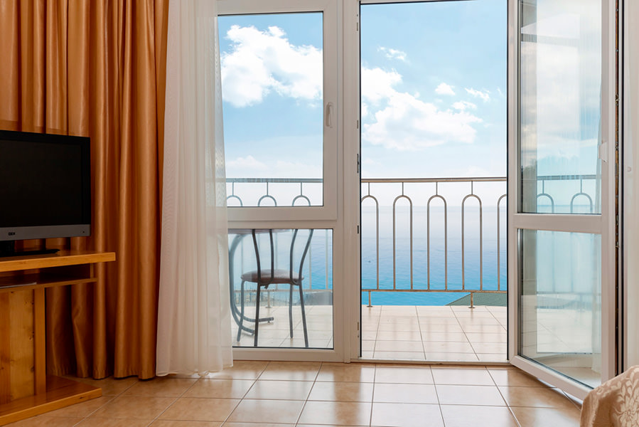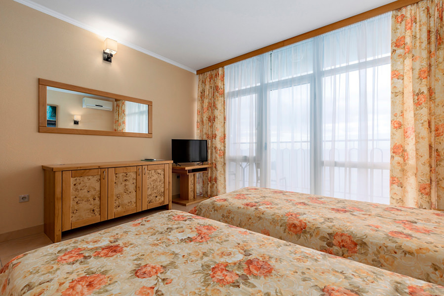 Номер имеет выход на балкон с видом на морскую гладь. Из бытовых удобств в номере есть телевизор, холодильник, чайник. Мебель в номере очень удобная, застелена качественным постельным бельем. Оснащен кондиционером.