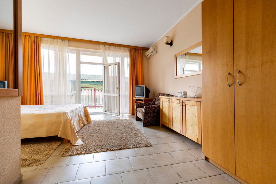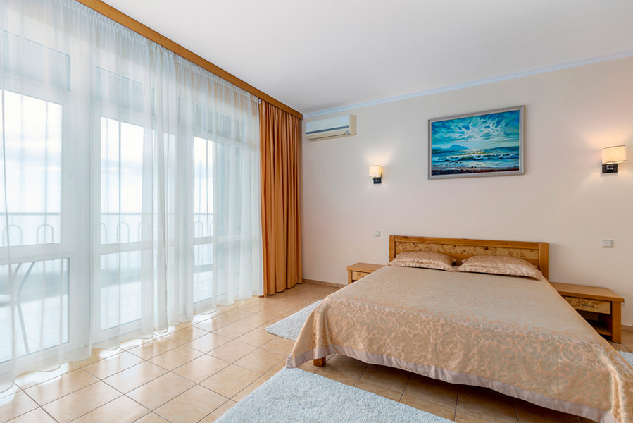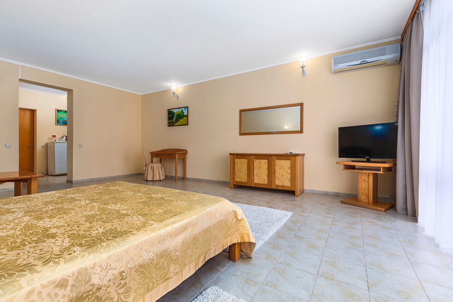 Номер с балконом и выходом море. Бытовые принадлежности в номере - это качественные телевизор, холодильник, чайник. Мебель в комнате номера очень удобная и способствует приятному ночлегу. Номер оснащен кондиционером.