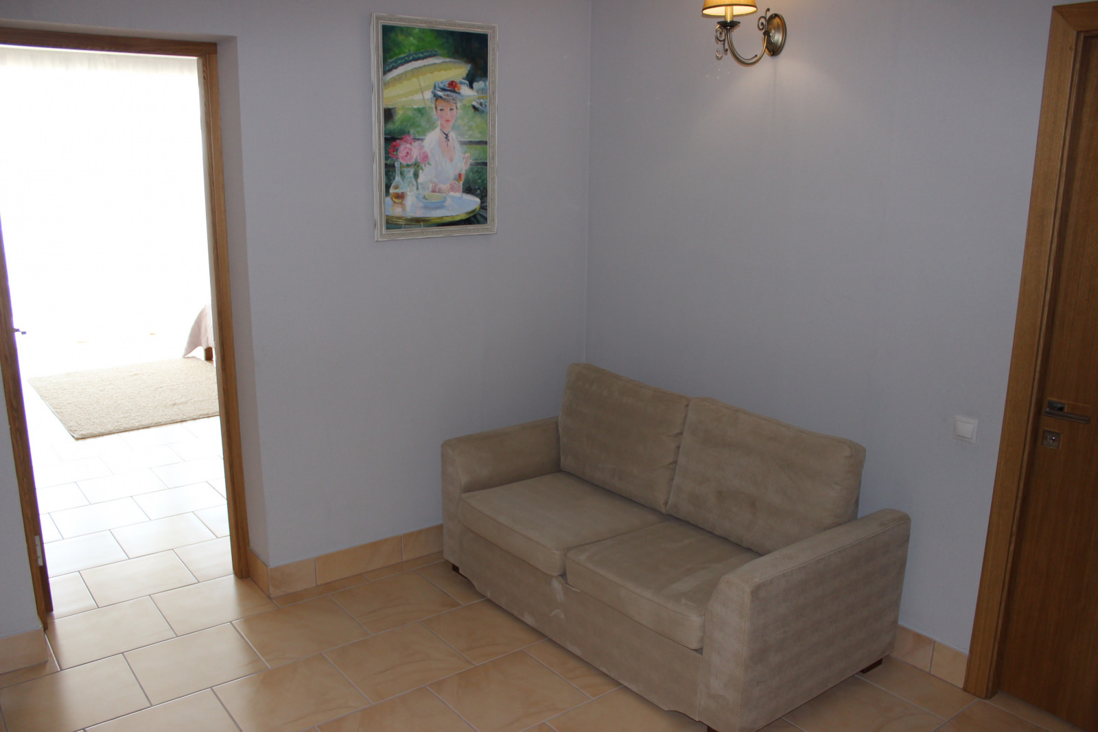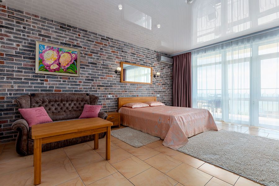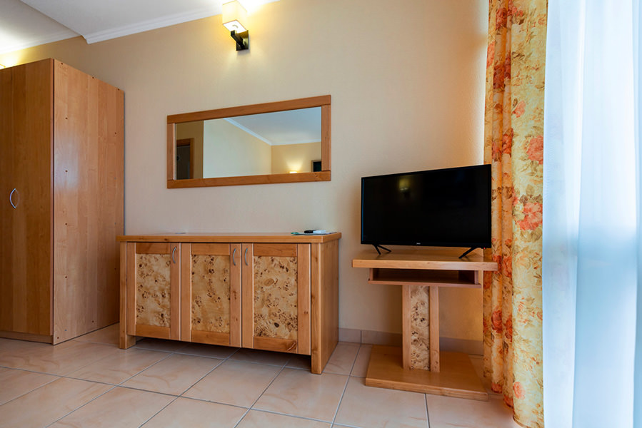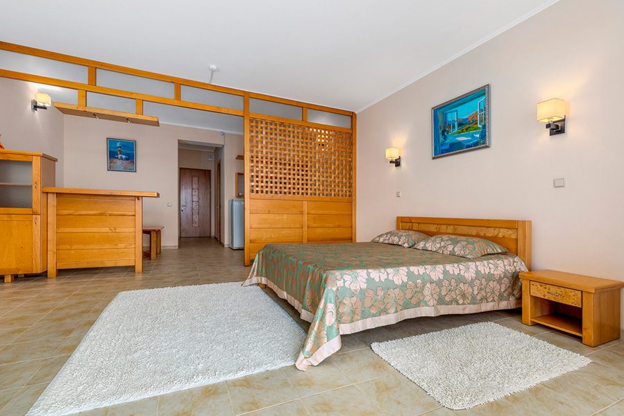 Номер включает в себя одну просторную комнату с двумя или одной большой кроватью. В качестве дополнительного места стоит раскладной диван. Комната становится еще более светлой и красивой, благодаря светящемуся на солнце морю, которое растянулось прямо перед окнами номера.