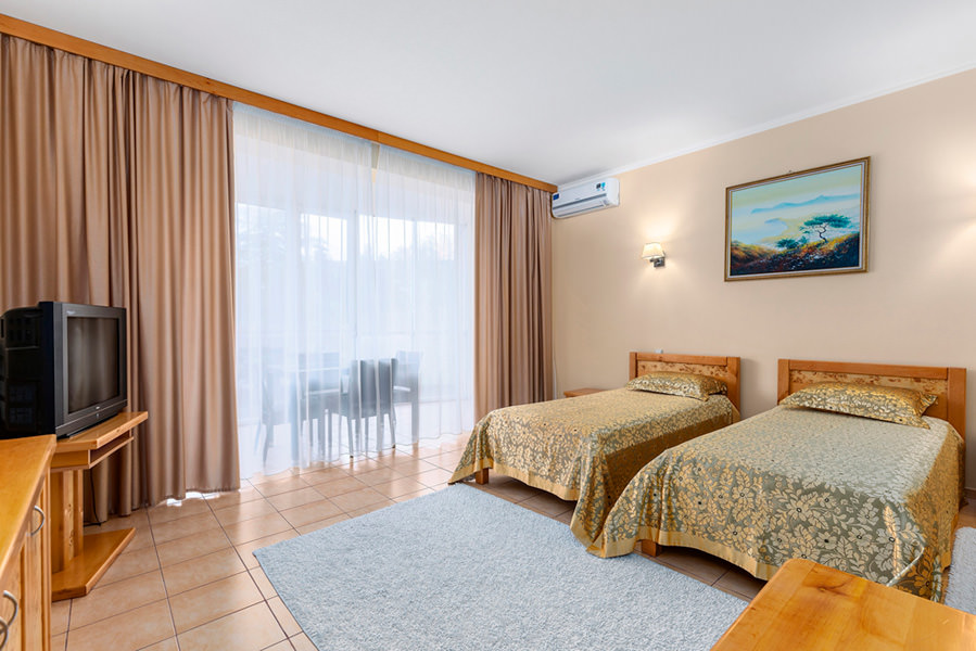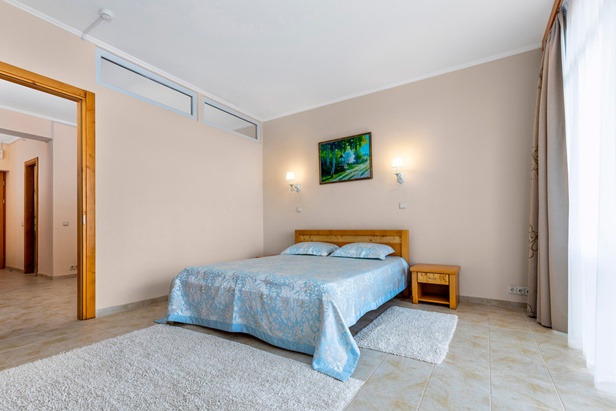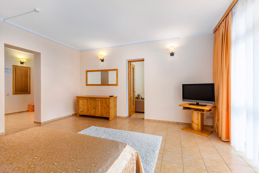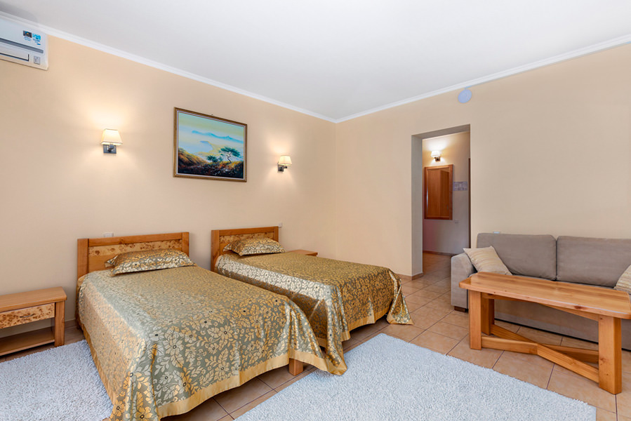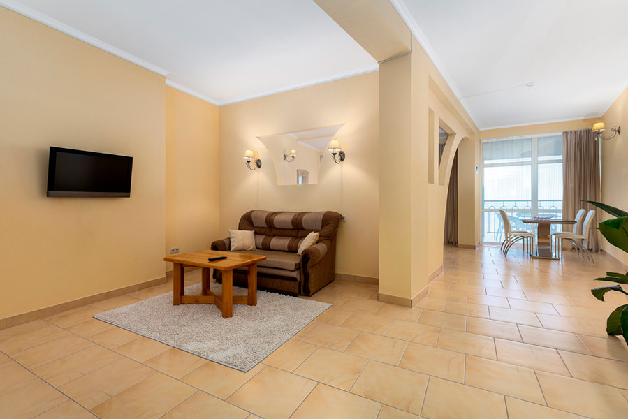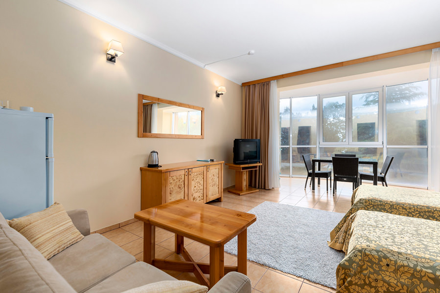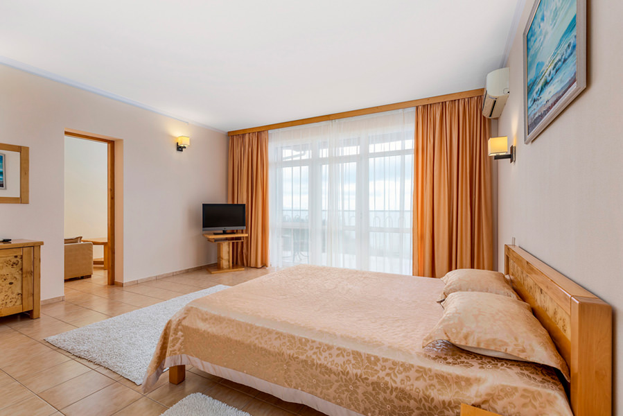 Двухкомнатный номер для двух человек, с возможностью размещения трех дополнительных мест. Номера с видом на море, преимущественно с балконом. Жилая площадь двухкомнатного номера 34 м2.