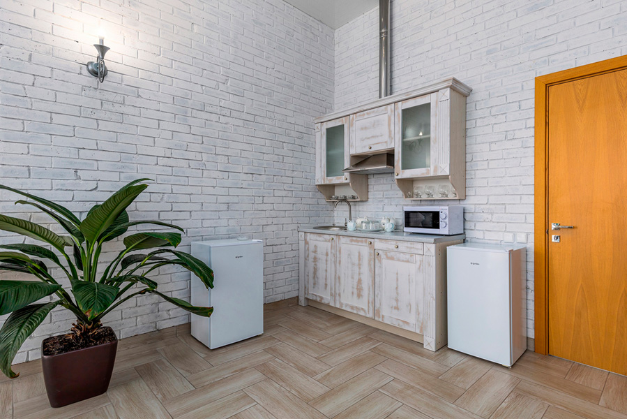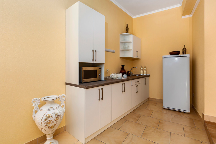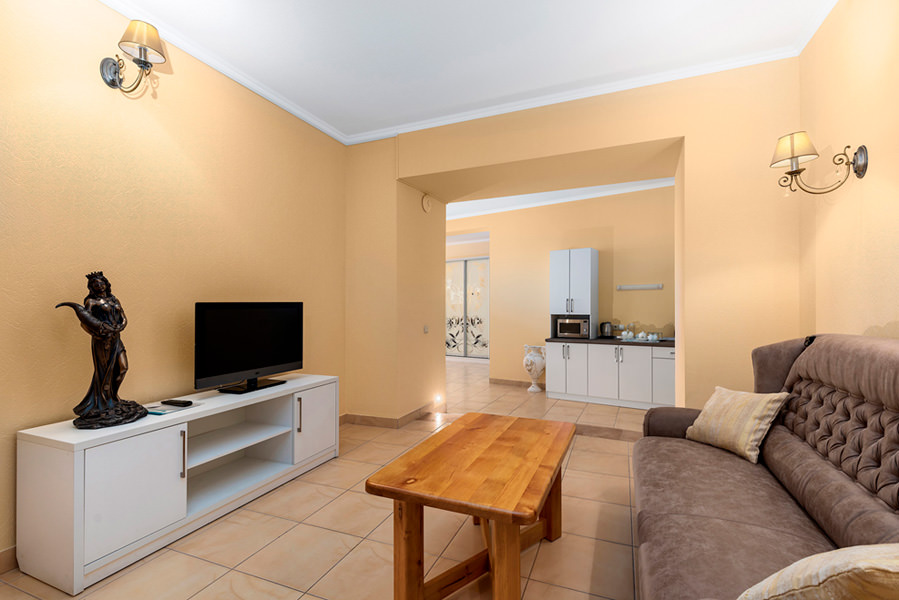 В номере два плазменных телевизора, два санузла, два дивана и собственная кухня. Он походит как для двух человек, так и для большей компании.