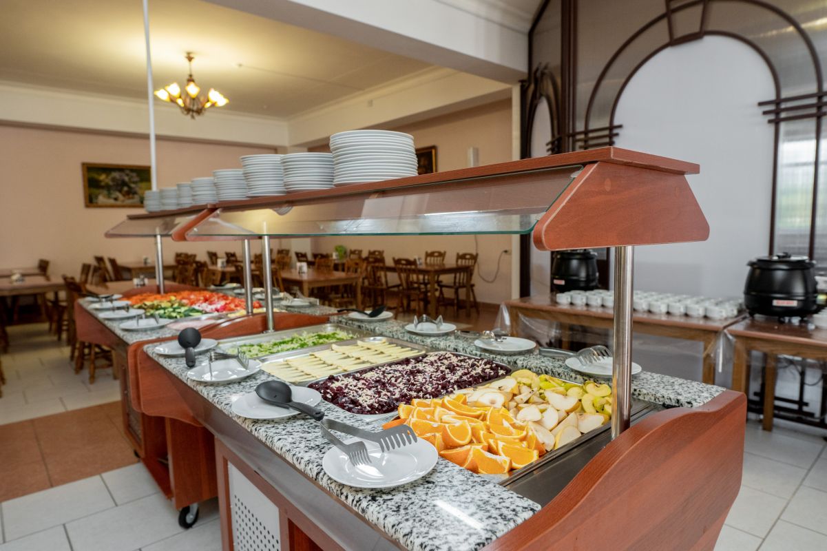 В санатории «Славутич» питание организовано по системе «шведский стол», что позволит каждому гостю выбрать блюда по вкусу, включая диетические варианты. Обеденный зал просторный, с большими панорамными окнами, а также есть летняя терраса, где можно насладиться трапезой на открытом воздухе и живописными видами. Места на террасе оборудованы раскладными зонтами, которые создадут комфорт и защитят от солнца или дождя.
