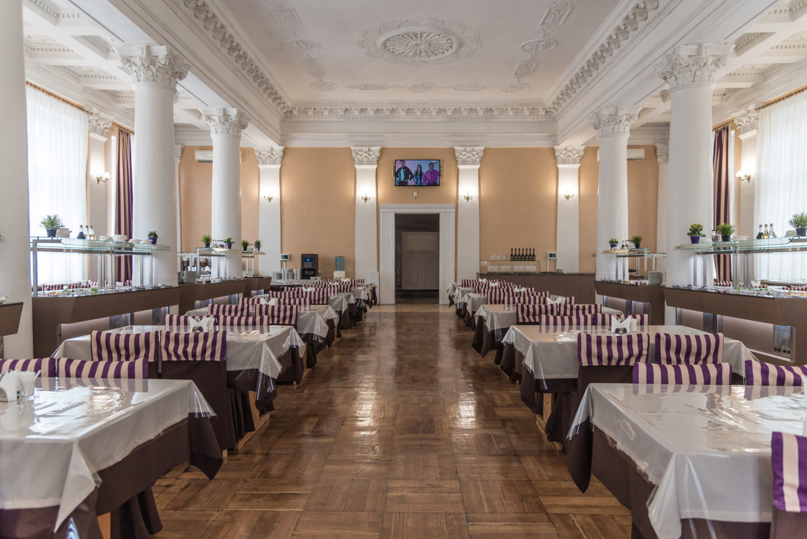 Неподалёку от корпуса №5 и водолечебницы расположена наша обеденная зона с комфортабельными залами. Дойти до них одинаково удобно из любой точки санатория, поэтому вам совсем необязательно бежать на завтрак со всех ног. Отправляясь пообедать или поужинать в обеденном зале, вы можете неспешно наслаждаться нашей парковой зоной, чтобы как следует «нагулять» аппетит. вы можете приобрести путёвки, в которые входит только завтрак, либо полноценное 3-х разовое питание.