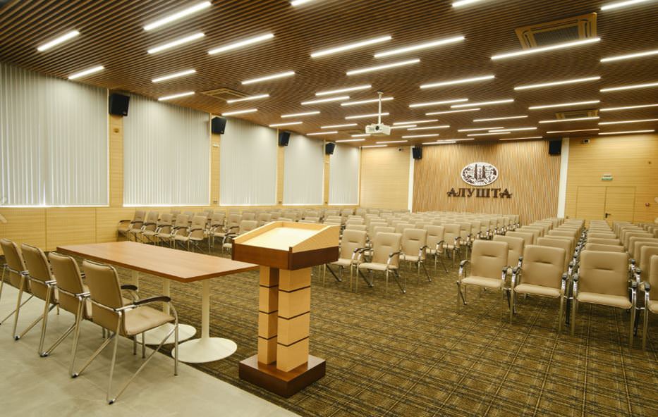 Конференц- холл «Алушта» рассчитан для проведения лекций, конференций, тренингов, семинаров, презентаций, шоу-румов или творческих вечеров, которые будут сопровождаться организационно-технической поддержкой конференц-менеджера.
