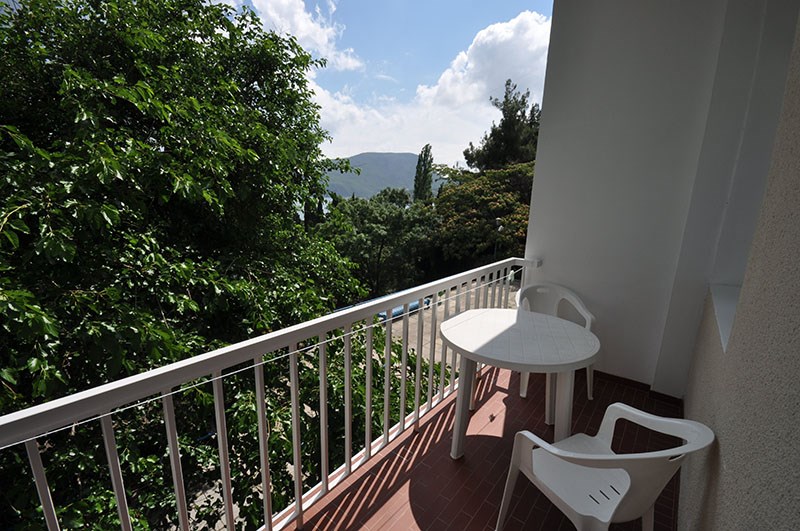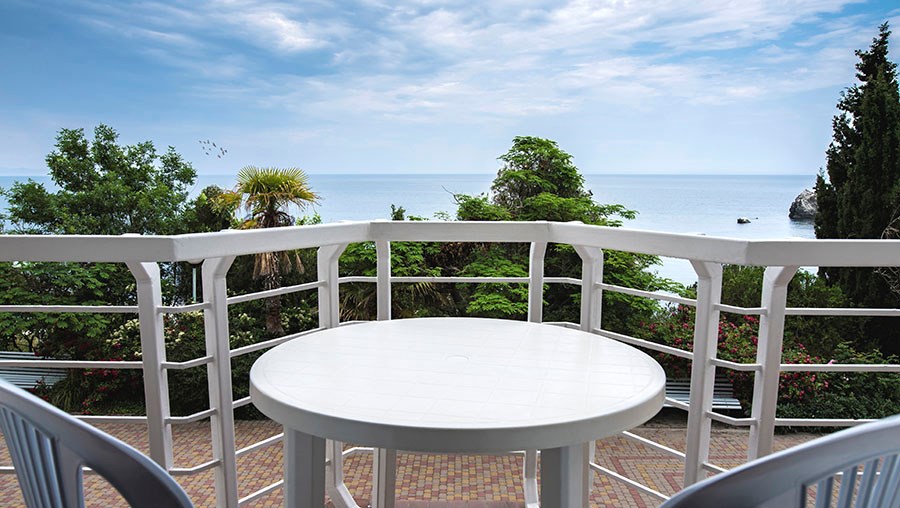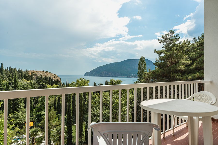 Стандартный номер со всеми удобствами, санузлом, душем, балконом, оборудованным уличной мебелью. Из окон - вид на парк, море и Медведь Гору Аю-Даг.
