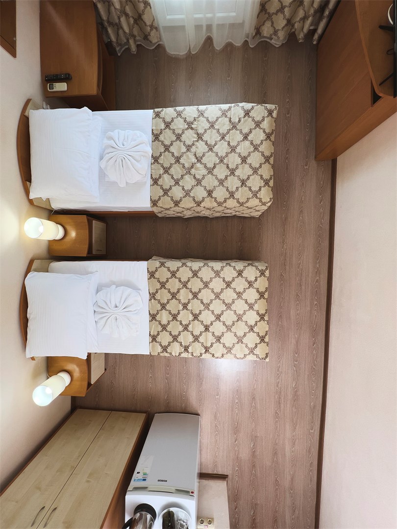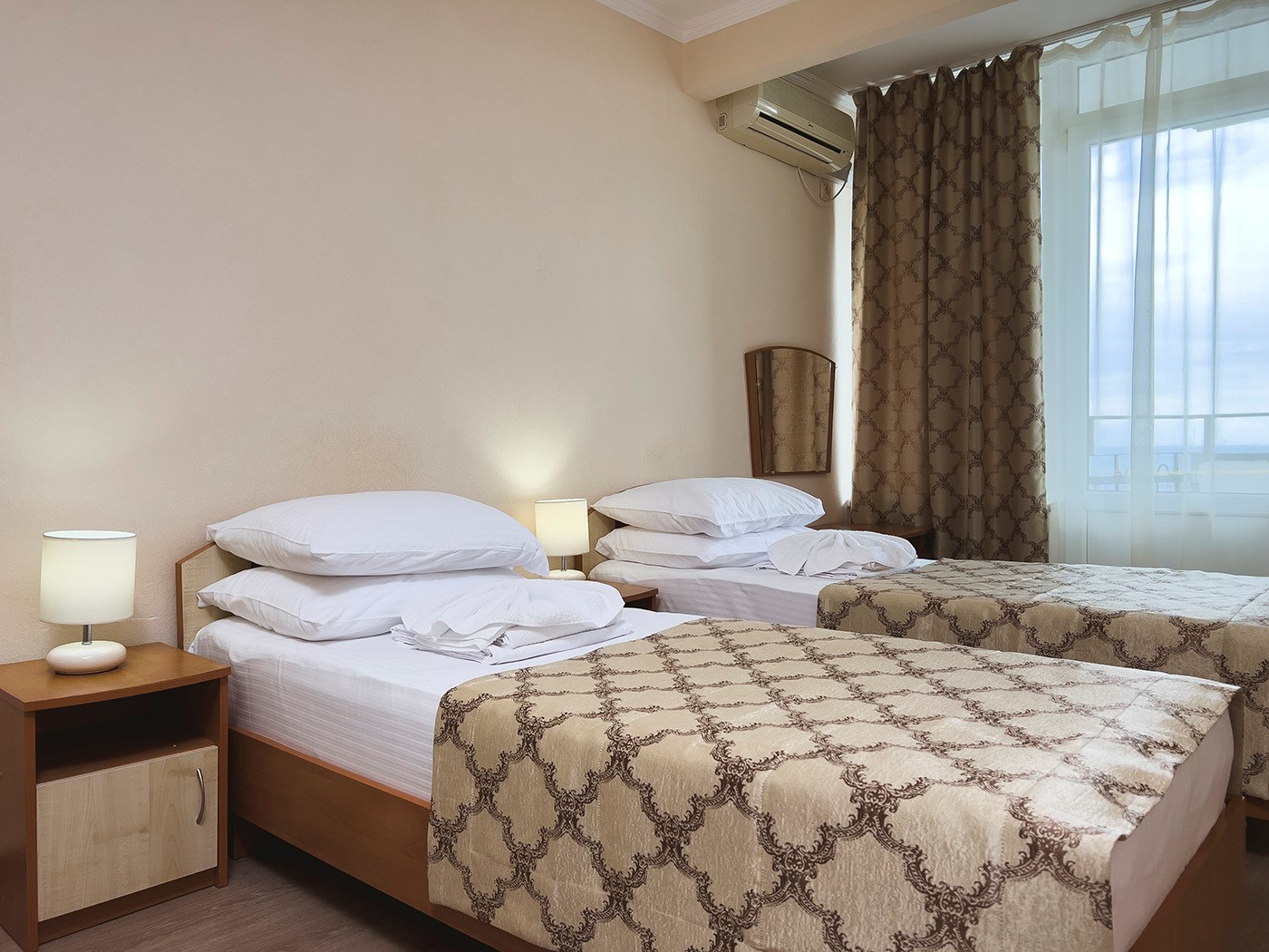 Двухместный номер с видом на море оборудован всем необходимым для отдыха - кондиционер, телевизор, холодильник.