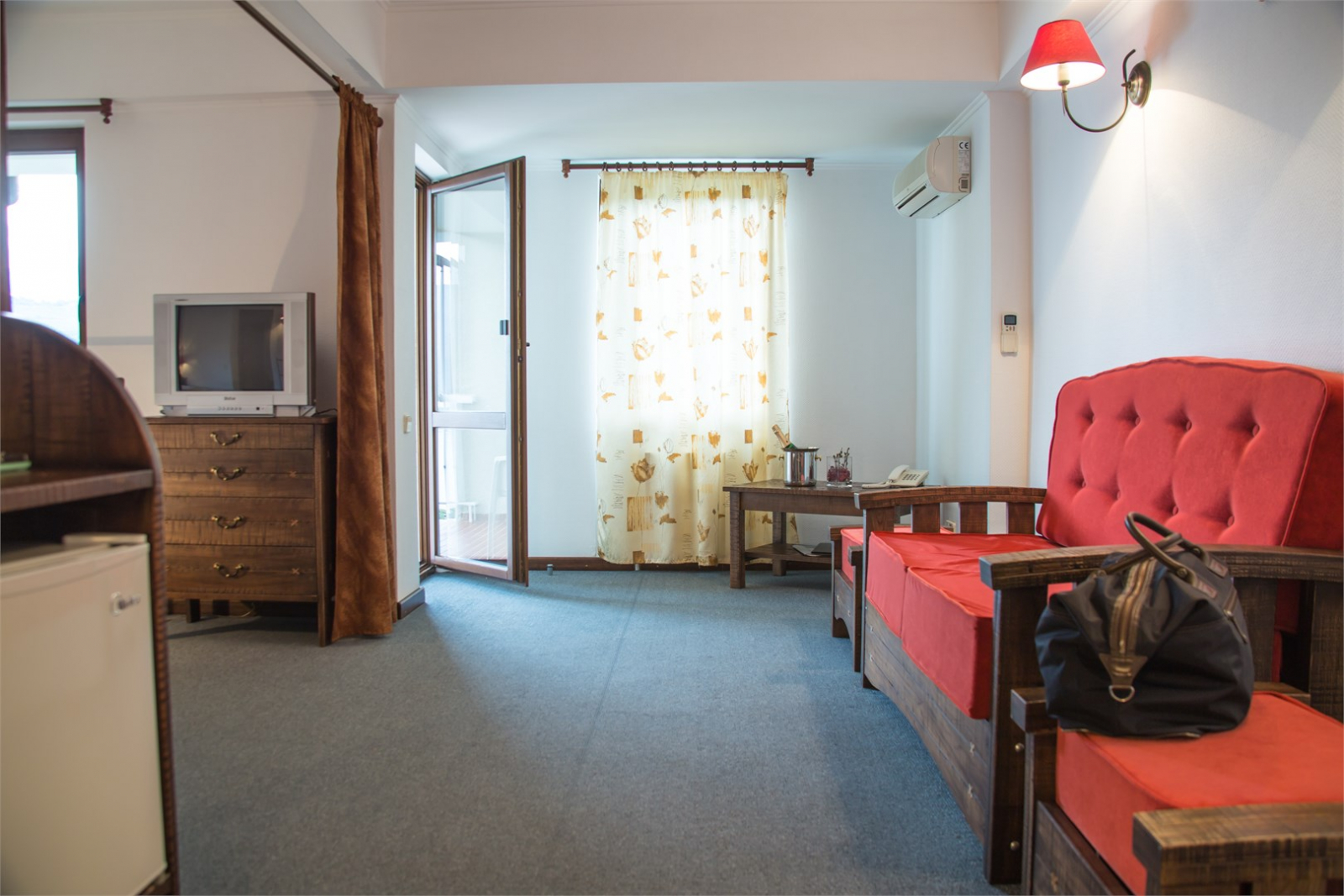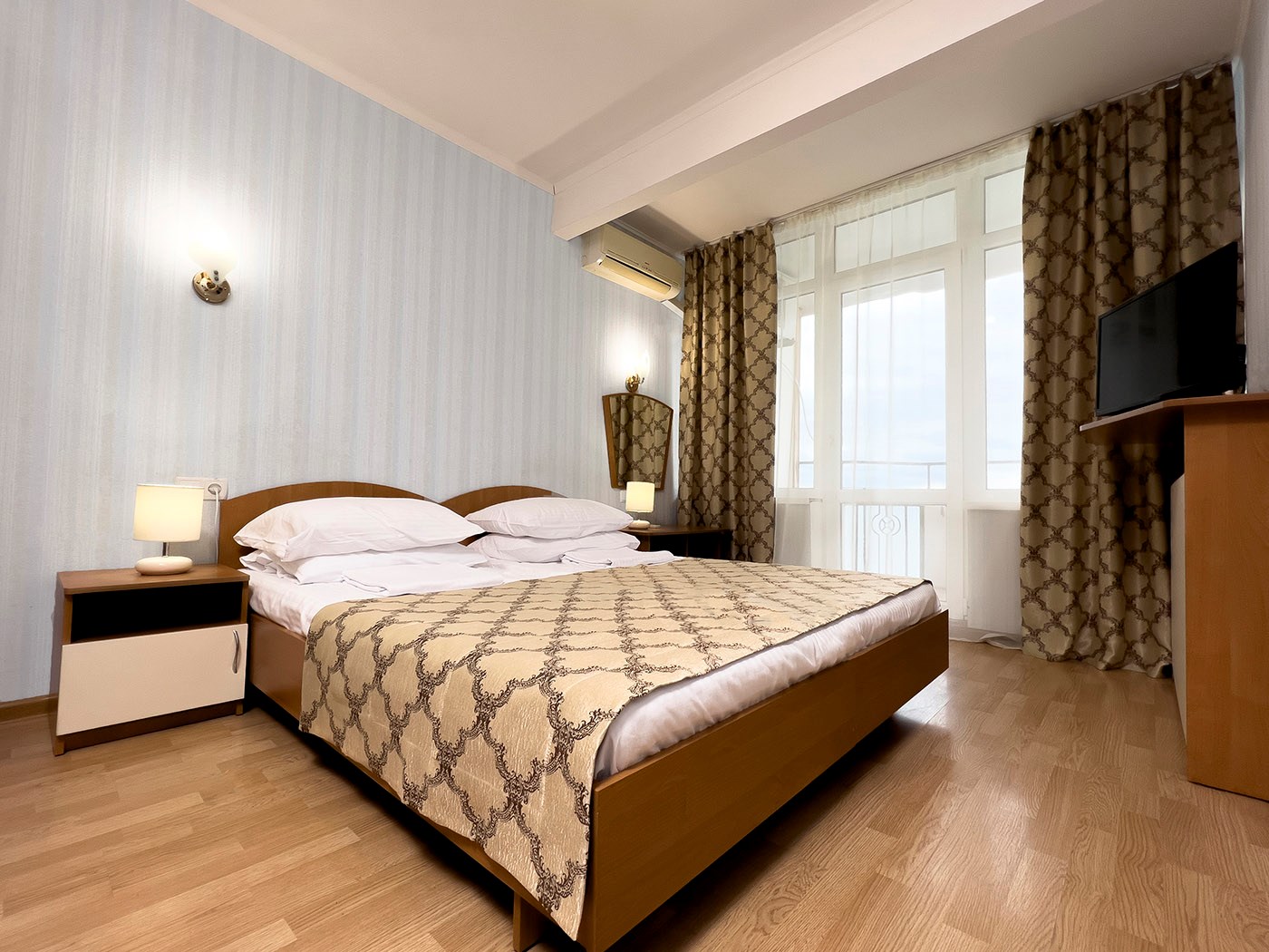 Номер с одной большой общей зоной. Современные и просторные. Из номеров верхних этажей – незабываемый вид на море, из нижних - на тенистый красивейший парк.