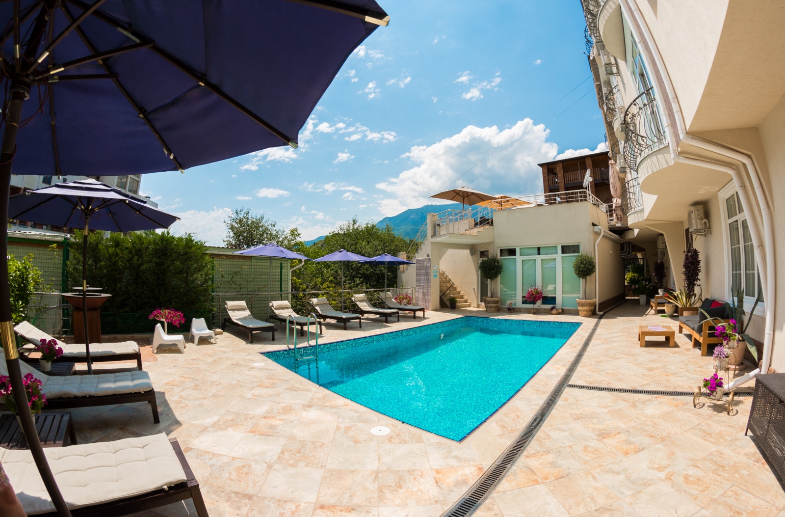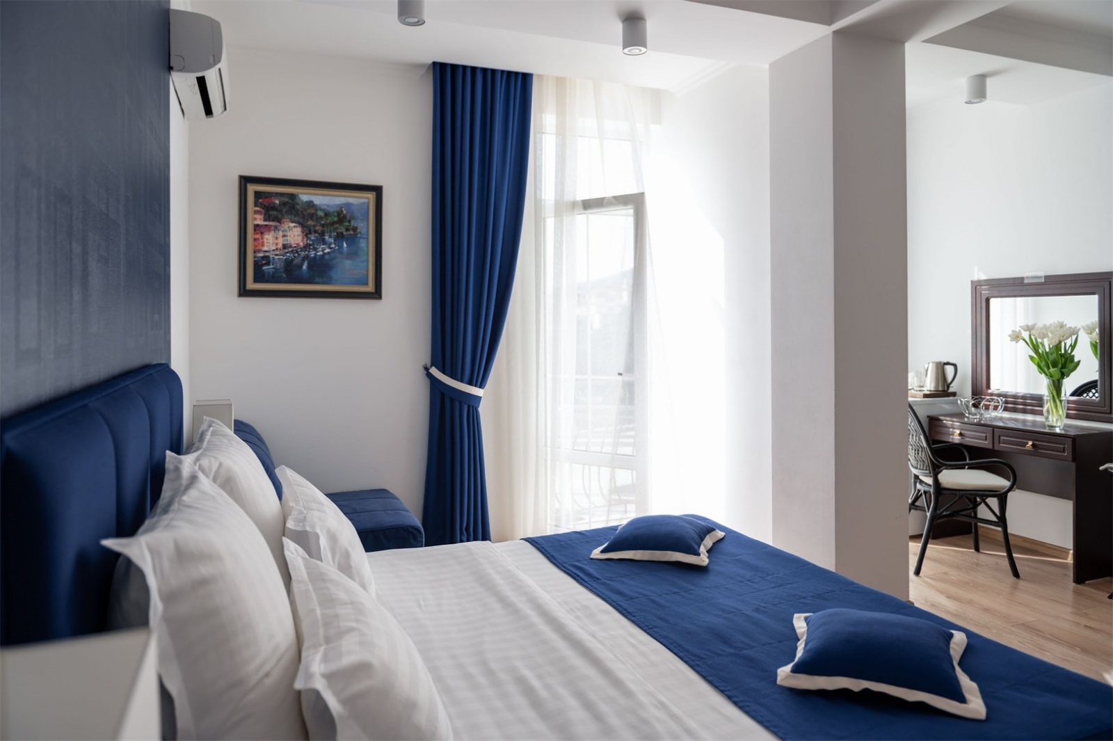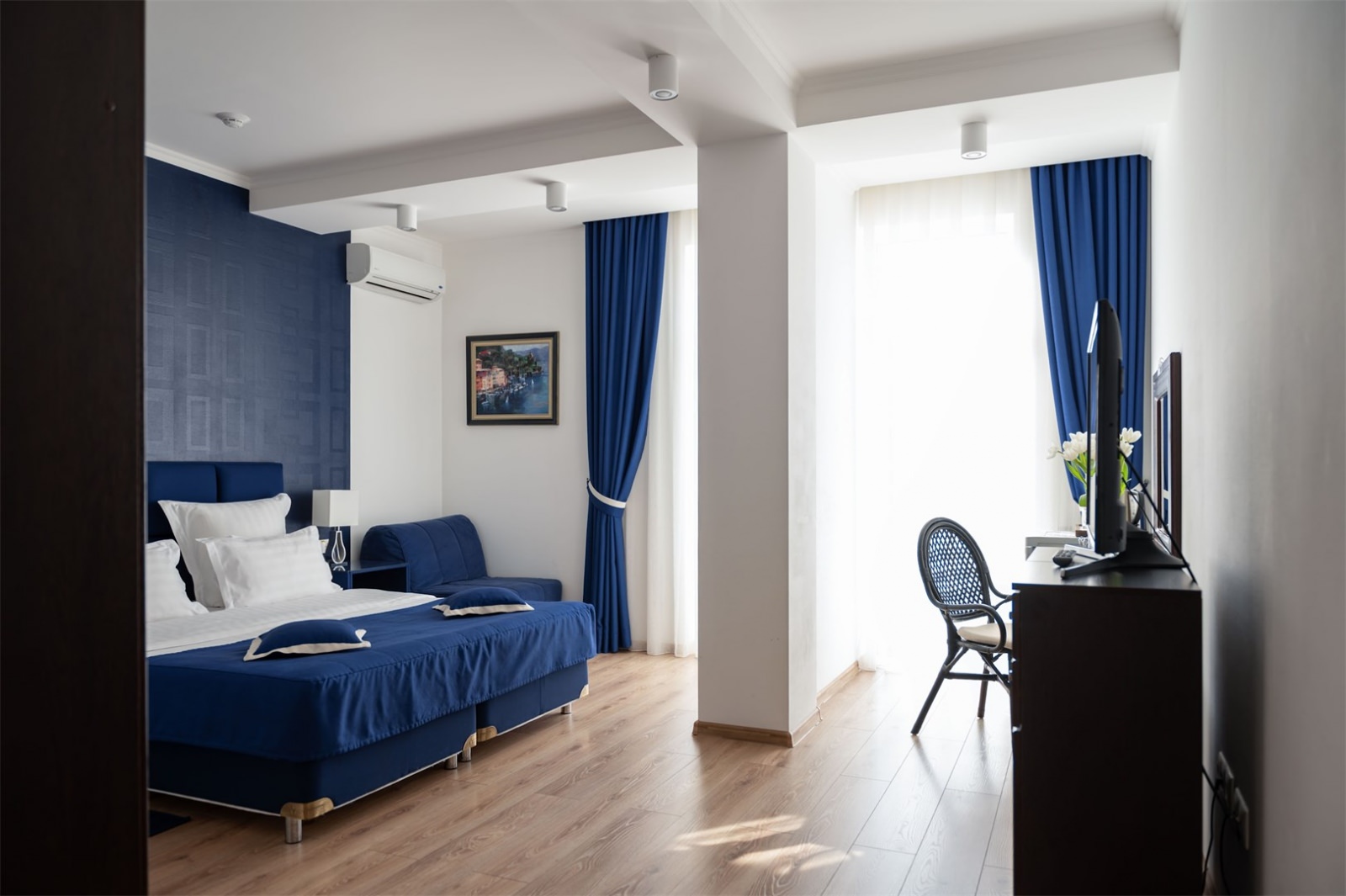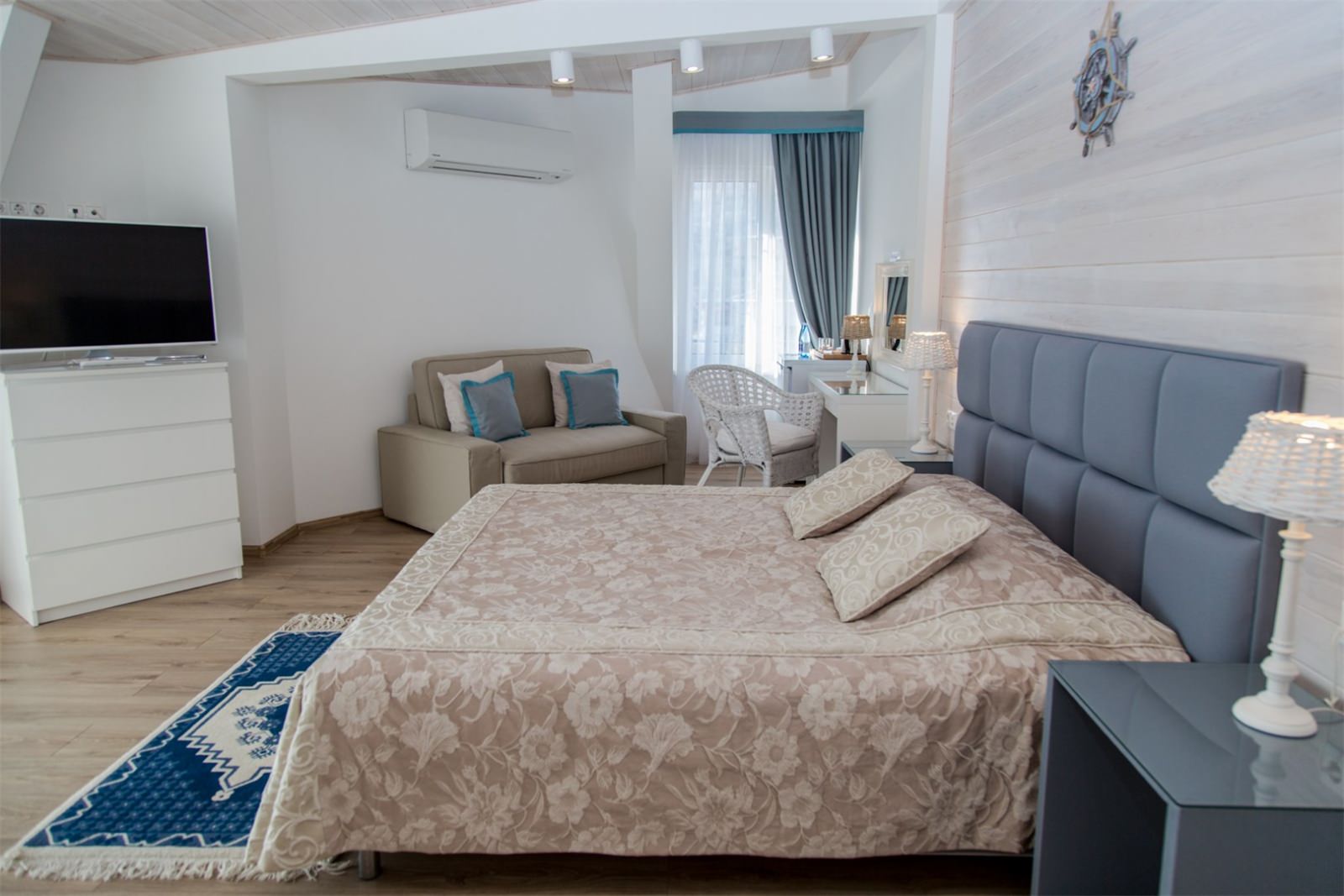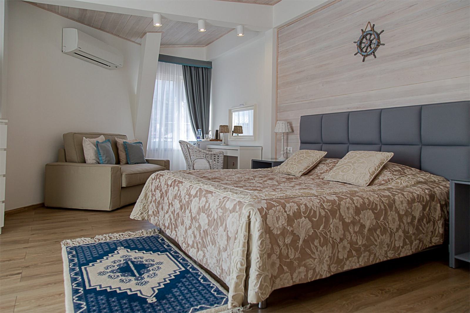 Чудесный отель скажу я вам) Небольшой, очень чистый и ароматный! Брали 2х комнатный номер. Мебель вся новая, очень атмосферно, такой прованс с французским балконом. В каждой комнате телевизор (что редкость), предусмотрен отпариватель (что удобно и безопасно). Ванна это особыий шик. Внизу ресторан с отличной кухней, мы попали на выступление пианиста. Завтраки тоже были отличные, но приходите пораньше). Внутри двора есть бассеин, лежаки и чистые полотенца предусмотрены. Можно заказать еду и напитки. До моря по улочкам пешком идти минут 15, вокруг красота! Но можно и на трансфере минут 5. Нам очень понравилось, вернемся снова.