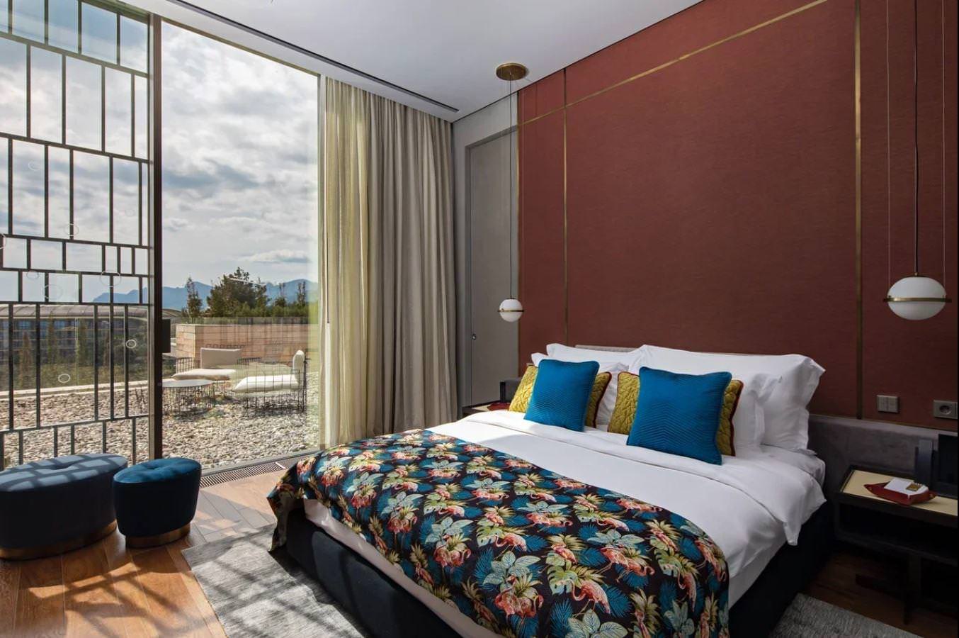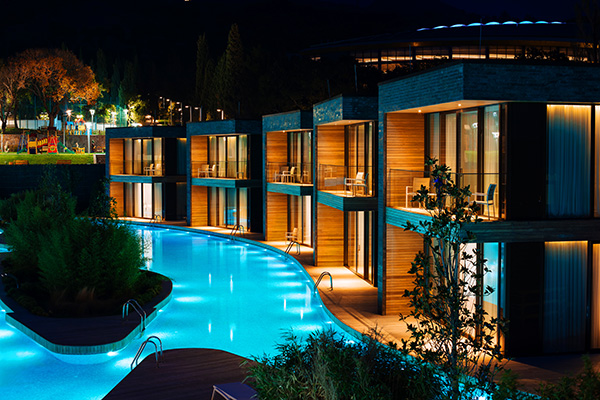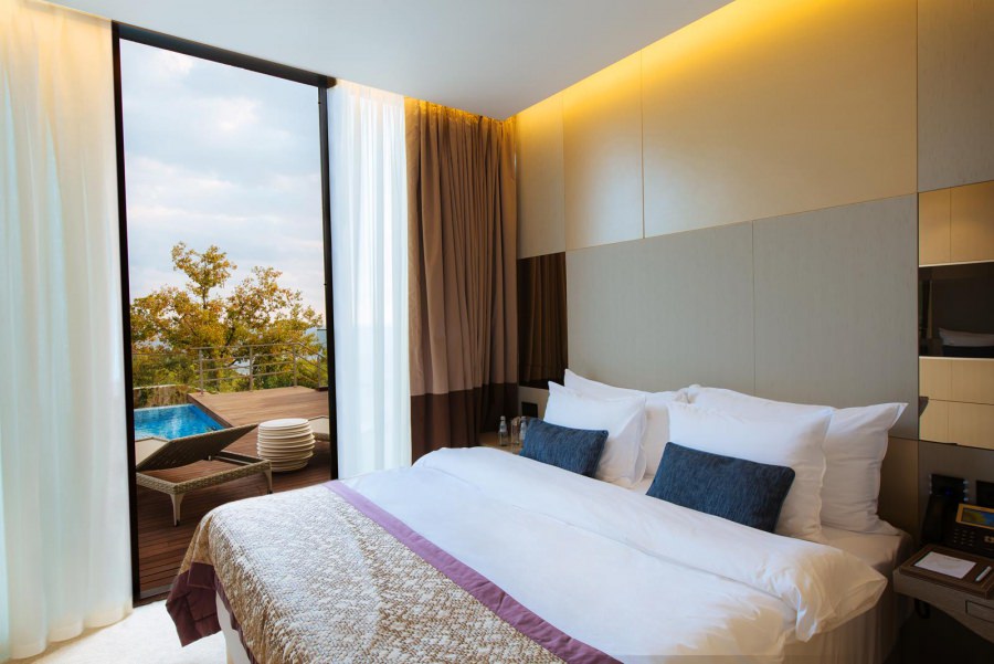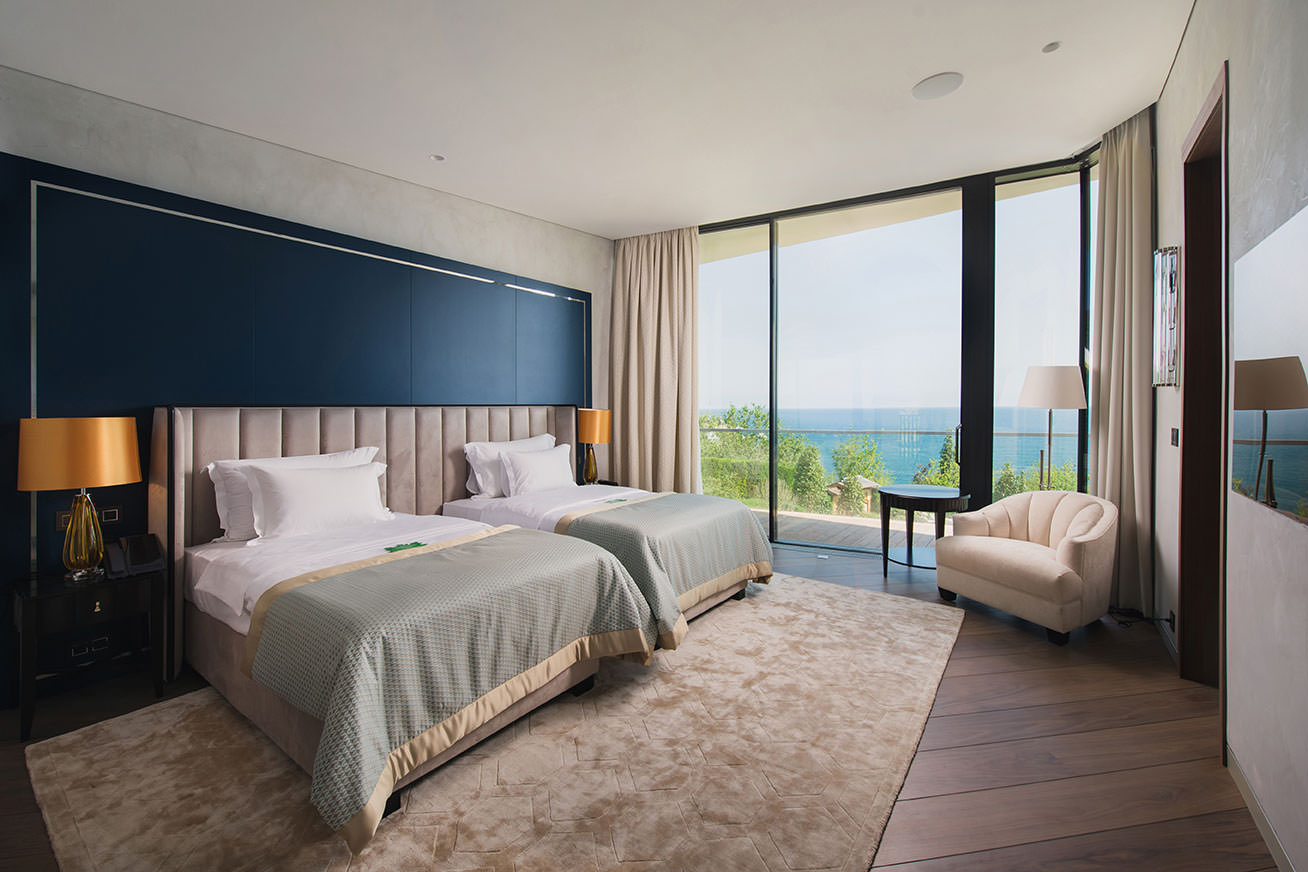 В состав комплекса входит пятизвездочный отель, включающий в себя превосходные стандартные и люксовые номера, а также семейные и президентские виллы. Дизайну и элементам интерьера каждого номера и виллы присущи нотки стиля и роскоши, что вместе с отличным оснащением придется по душе настоящим ценителям комфорта.