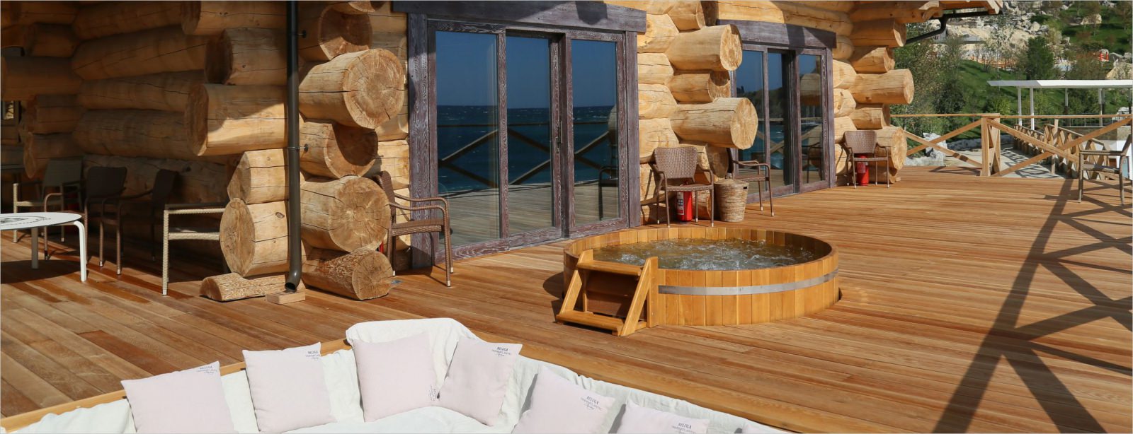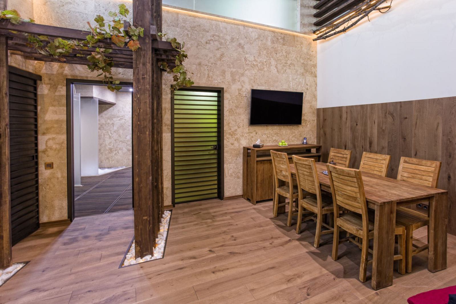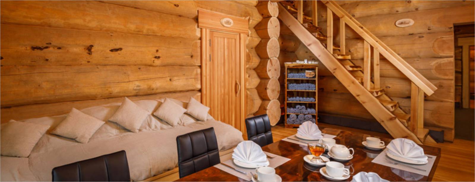 Для гостей подготовлены чайные наборы, удобные мягкие халаты и персональные купели. Установлено техническое обеспечение — система «Умный дом».