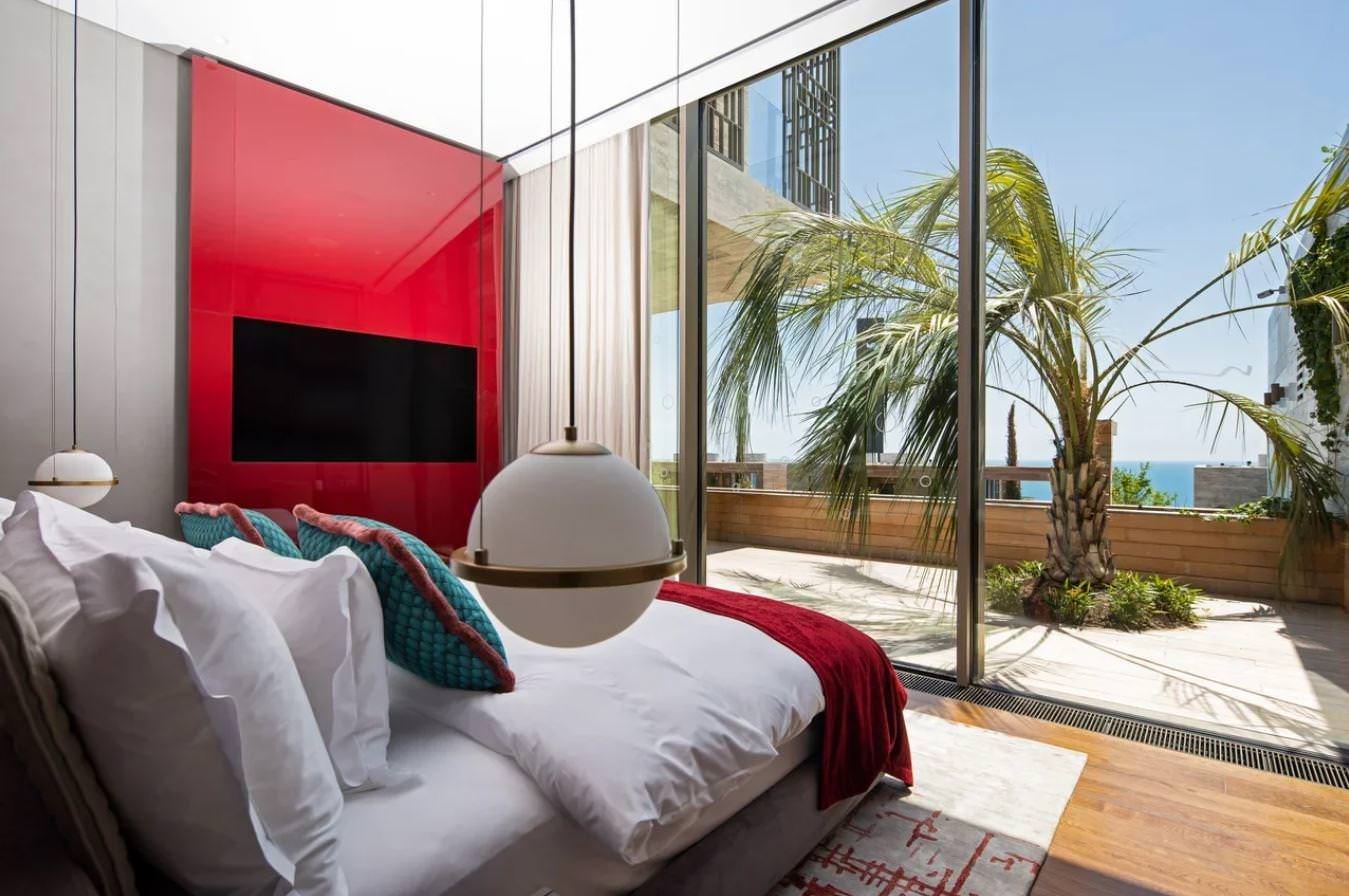 Первый уровень включил в себя просторную спальню, гостиную с кухней и выход на внутренний двор, из которого можно быстро попасть в VIP-бассейн с шезлонгами. Второй уровень – это 2 спальни и балкон. Ванная комната и санузлы имеют оснащение отличной сантехникой.