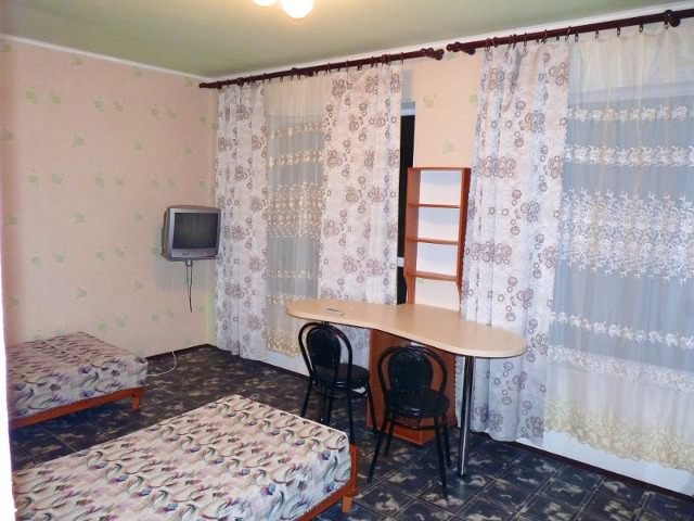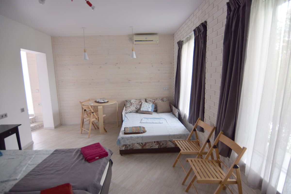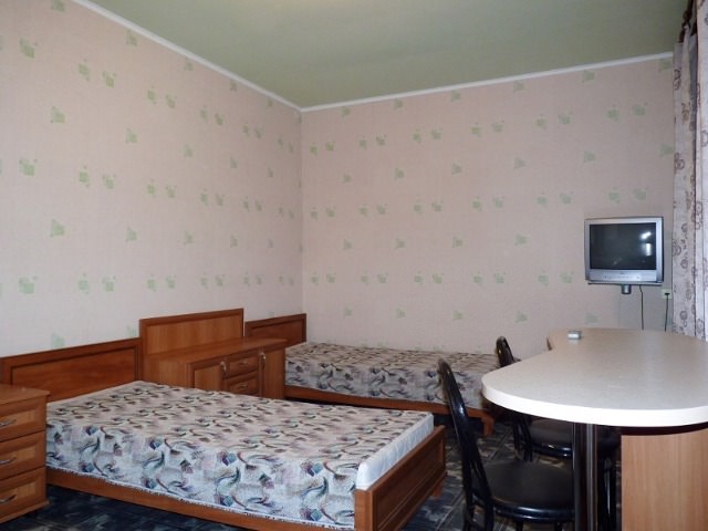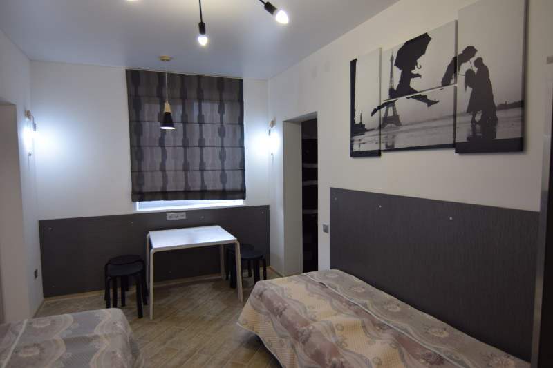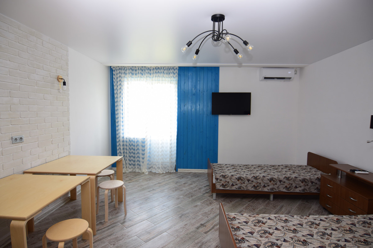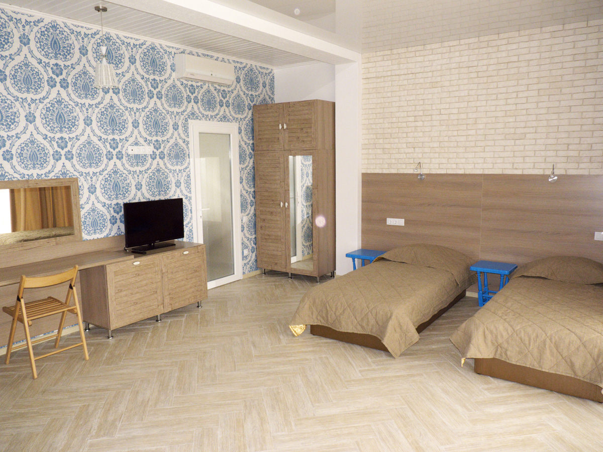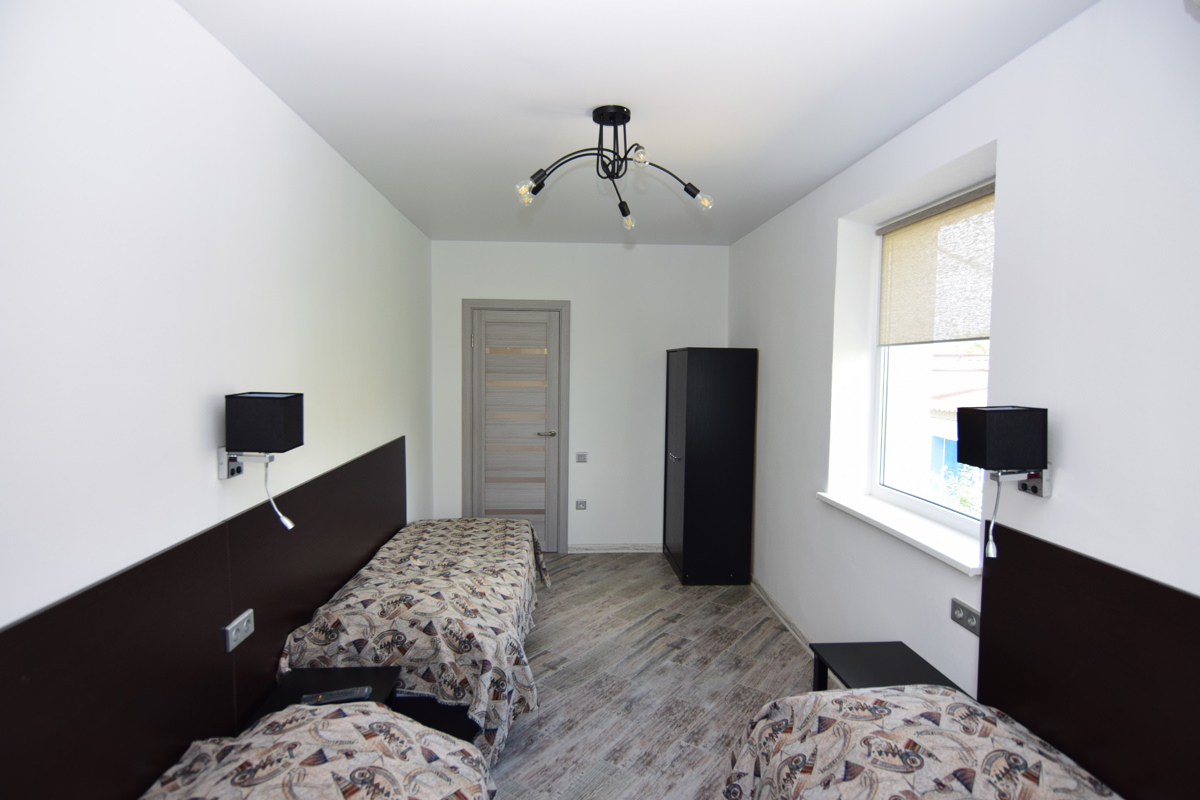Площадь номера - 40 кв.м. 2 осн. места. 2 доп. места. Балкон. Мебель: вешалка, зеркало, кровати односпальные, прикроватные тумбочки, стол, стулья, шкаф. Мини-кухня. Оборудование: микроволновая печь, набор посуды, плита электрическая, сплит-система, телевизор, холодильник, чайный набор посуды, электрочайник. Санузел: с душевой кабиной, фен. Сервис: смена полотенец, смена постельного белья, уборка номера.