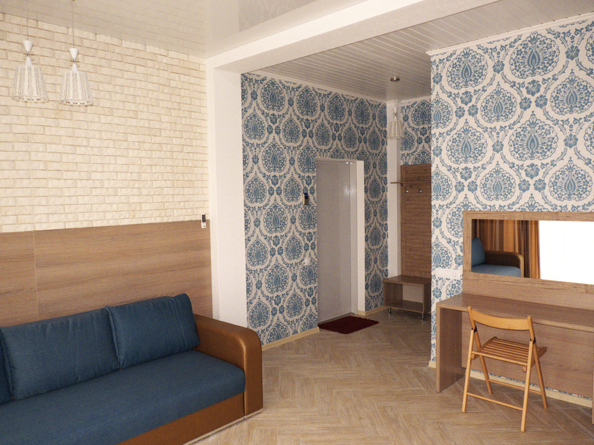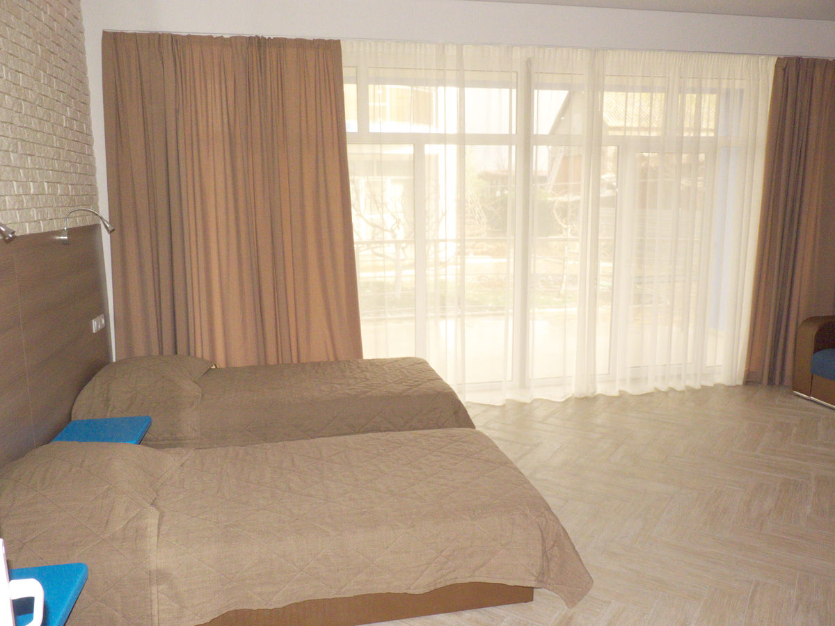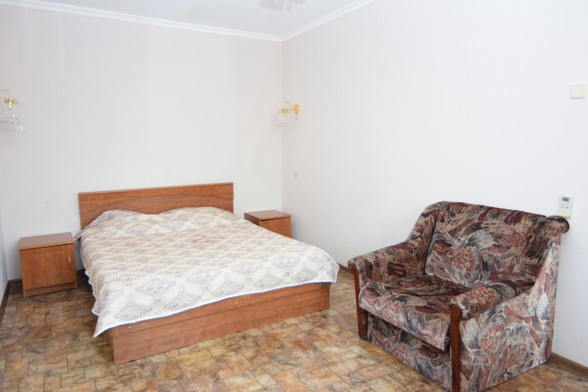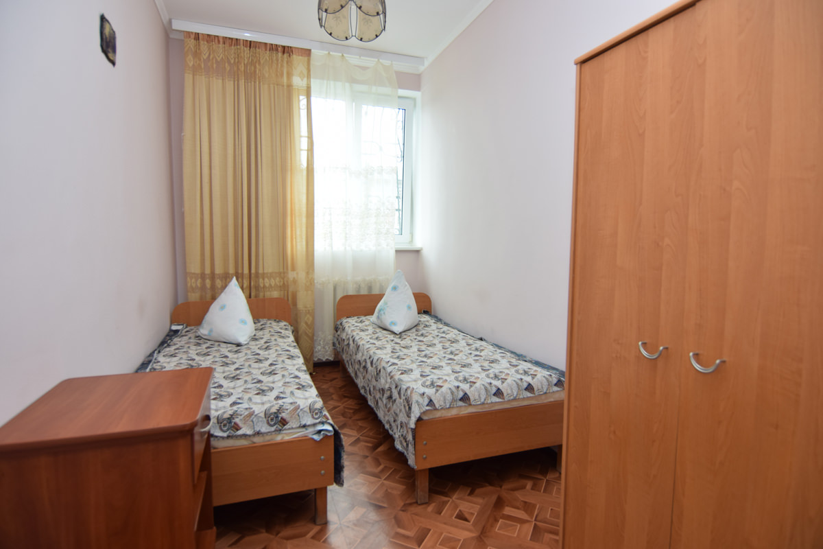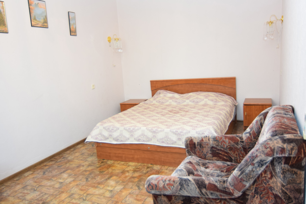 Площадь номера - 40 кв.м. 2 осн. места. 2 доп. места. Балкон. Мебель: вешалка, зеркало, кровати односпальные, прикроватные тумбочки, стол, стулья, шкаф. Мини-кухня. Оборудование: микроволновая печь, набор посуды, плита электрическая, сплит-система, телевизор, холодильник, чайный набор посуды, электрочайник. Санузел: с душевой кабиной, фен. Сервис: смена полотенец, смена постельного белья, уборка номера.