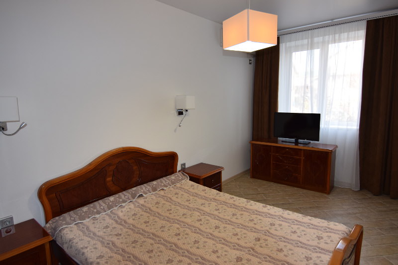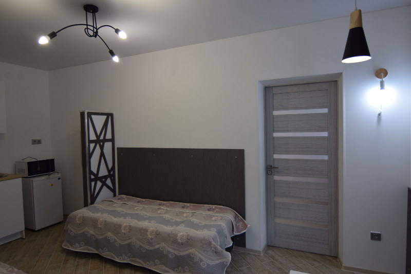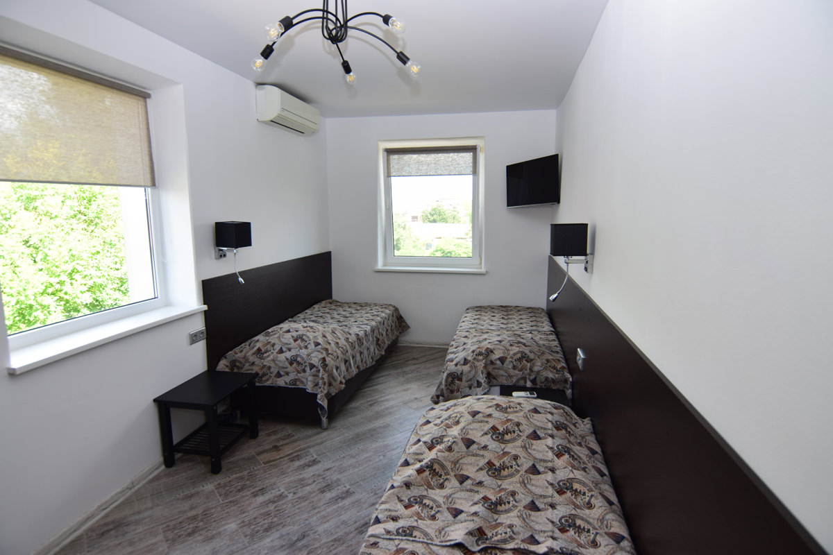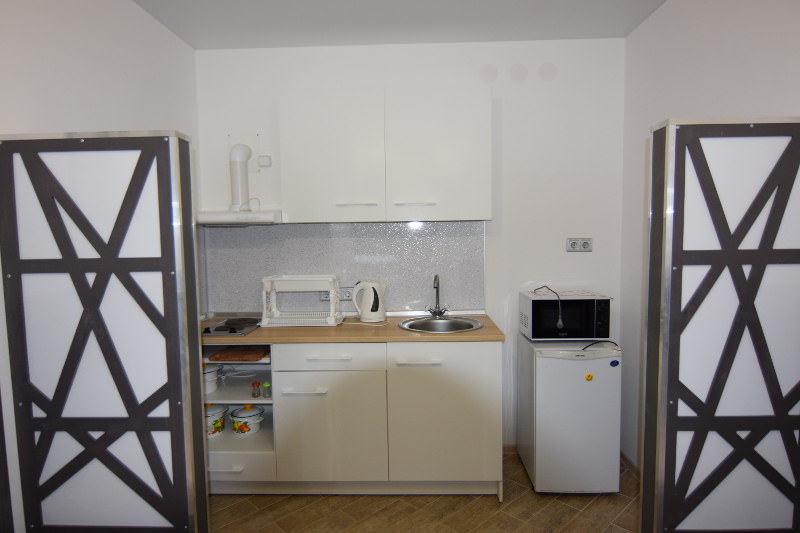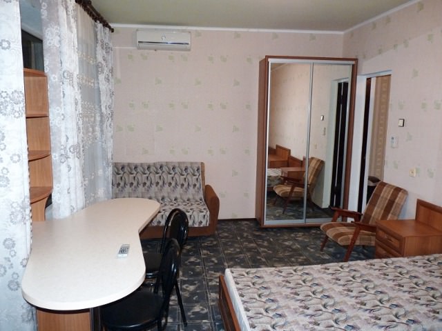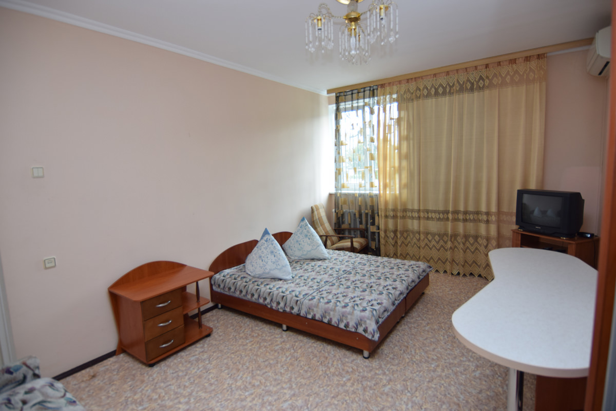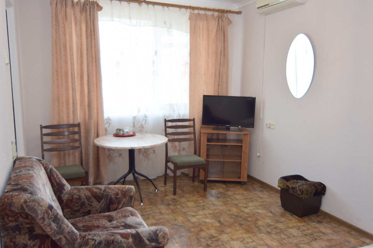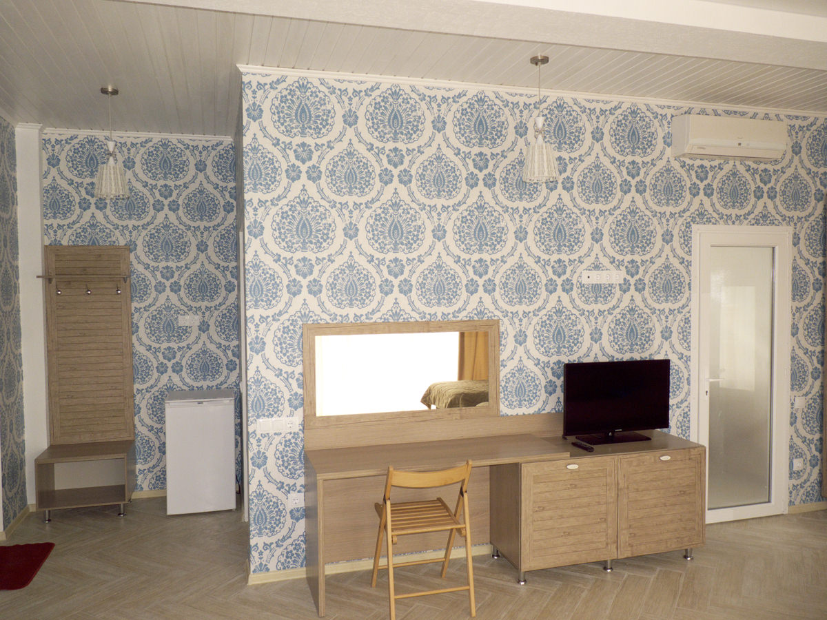 Площадь номера - 40 кв.м. 2 осн. места. 2 доп. места. Балкон. Мебель: вешалка, зеркало, кровати односпальные, прикроватные тумбочки, стол, стулья, шкаф. Мини-кухня. Оборудование: микроволновая печь, набор посуды, плита электрическая, сплит-система, телевизор, холодильник, чайный набор посуды, электрочайник. Санузел: с душевой кабиной, фен. Сервис: смена полотенец, смена постельного белья, уборка номера.