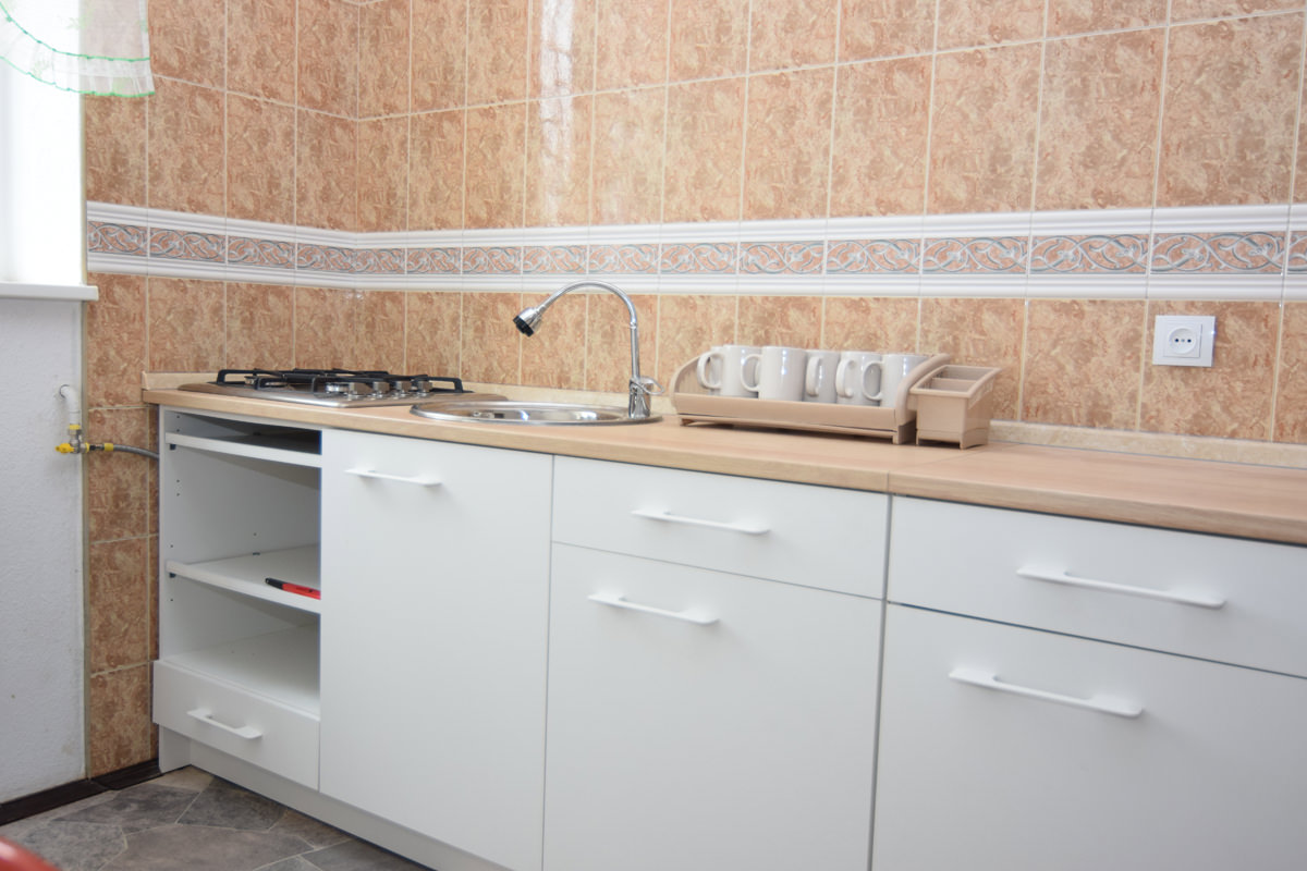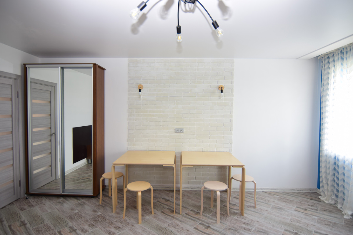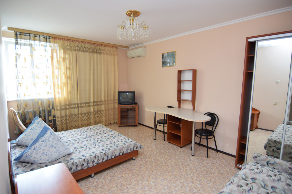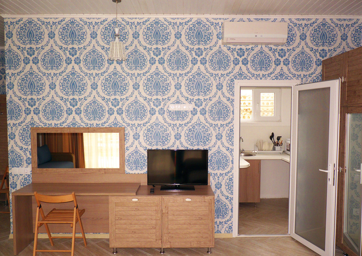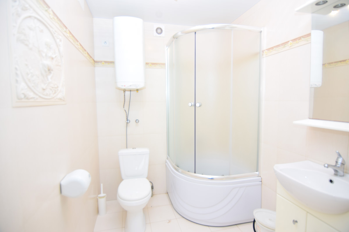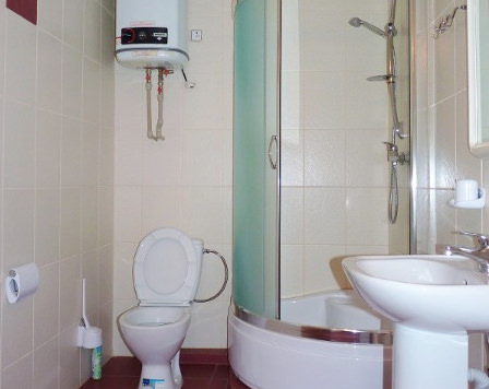 Площадь номера - 40 кв.м. 2 осн. места. 2 доп. места. Балкон. Мебель: вешалка, зеркало, кровати односпальные, прикроватные тумбочки, стол, стулья, шкаф. Мини-кухня. Оборудование: микроволновая печь, набор посуды, плита электрическая, сплит-система, телевизор, холодильник, чайный набор посуды, электрочайник. Санузел: с душевой кабиной, фен. Сервис: смена полотенец, смена постельного белья, уборка номера.