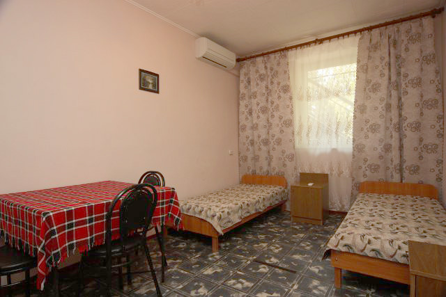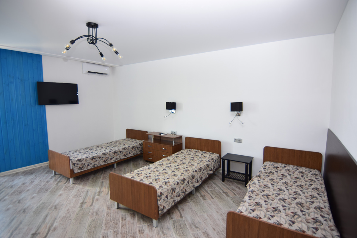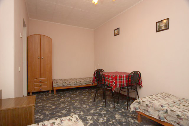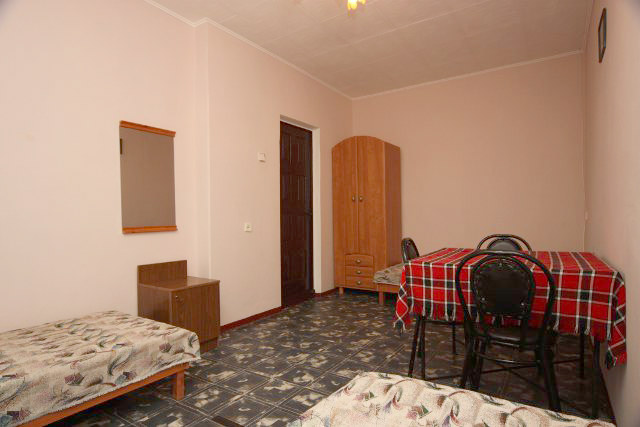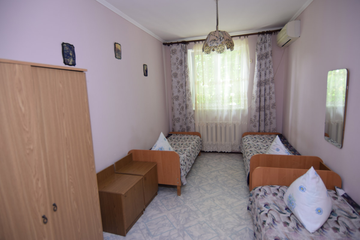 Площадь номера - 75 кв.м. 6 осн. мест. 2 доп. места. Мебель: вешалка, зеркало, кровати односпальные, прикроватные тумбочки, стол, стулья, шкаф. Оборудование: сплит-система, телевизор, холодильник, чайный набор посуды, электрочайник. Санузел. Сервис: смена полотенец, смена постельного белья, уборка номера.