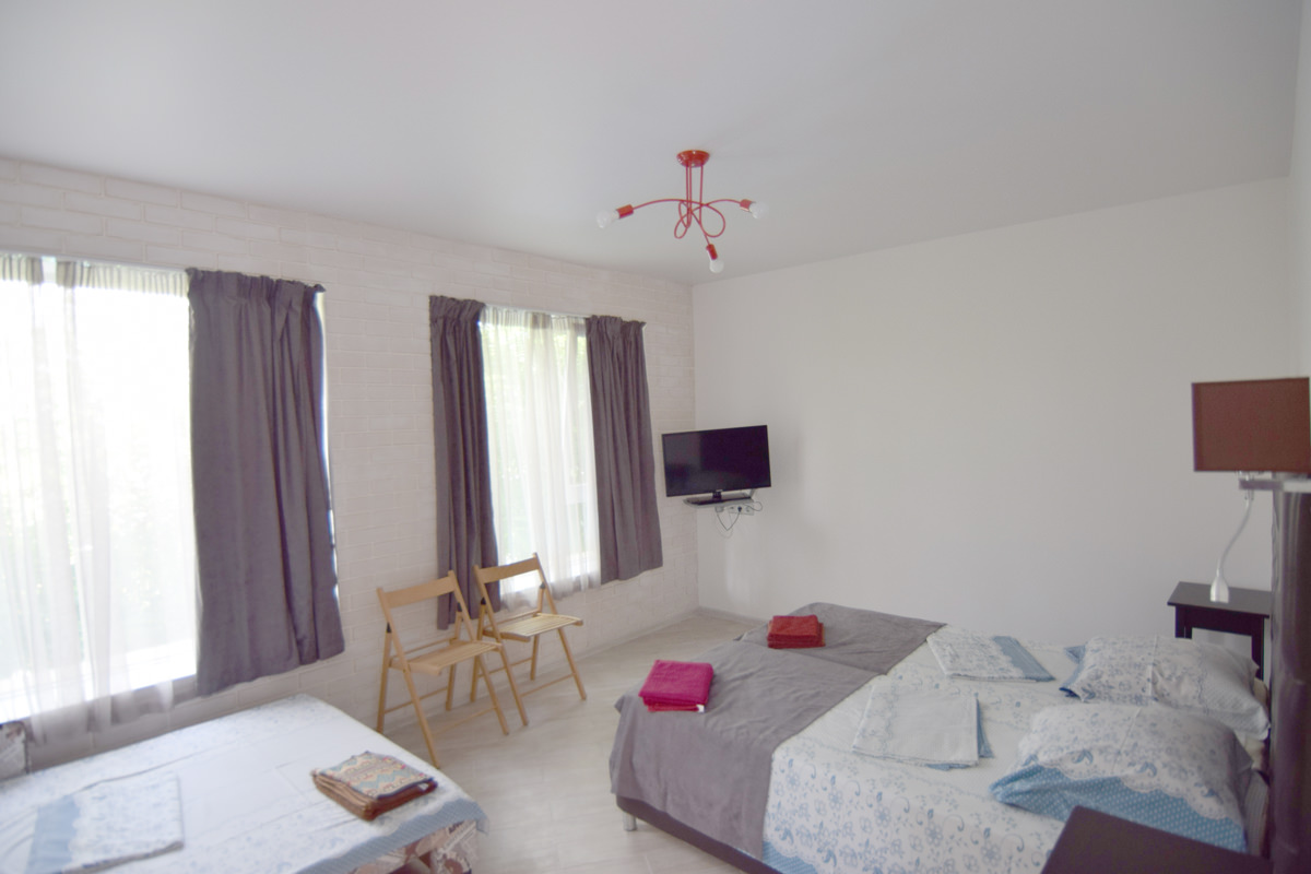 Площадь номера - 72 кв.м. 6 осн. мест. 2 доп. места. Мебель: вешалка, диван, зеркало, кровати односпальные, прикроватные тумбочки, стол, стулья, шкаф. Мини-кухня. Оборудование: микроволновая печь, набор посуды, плита электрическая, сплит-система, телевизор, холодильник, электрочайник. Санузел: с душевой кабиной, фен. Сервис: смена полотенец, смена постельного белья, уборка номера.