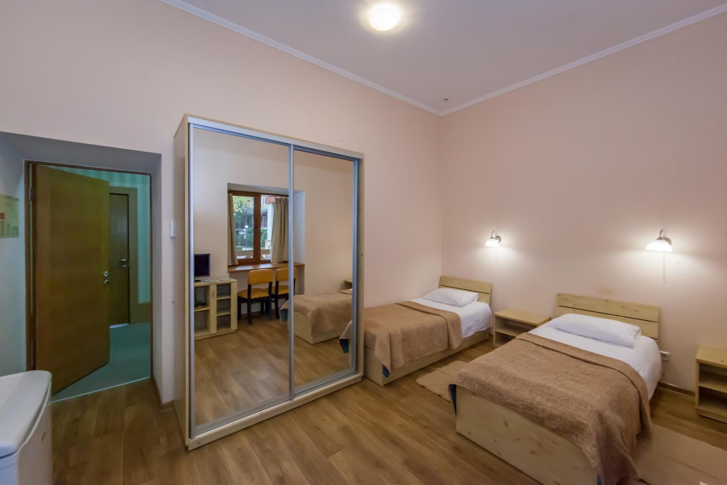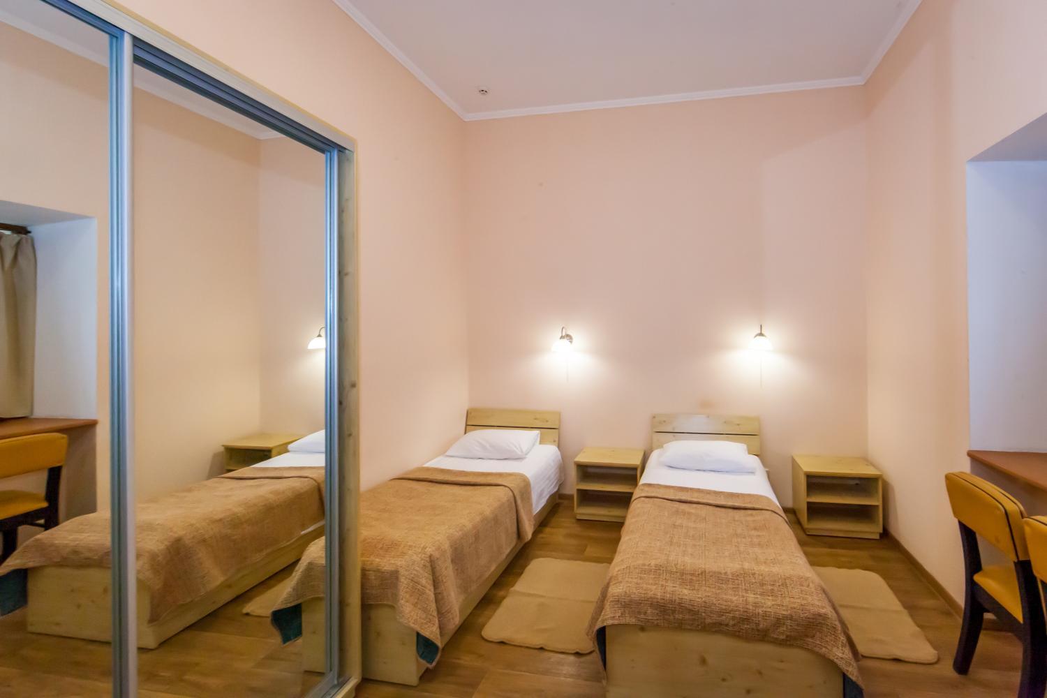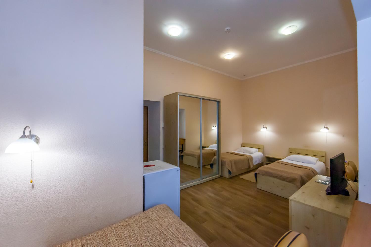 Площадь номера - 18 кв.м. 3 осн. места. Мебель: вешалка, зеркало, кровати односпальные, прикроватные тумбочки, стулья, тумба, шкаф. Оборудование: сплит-система, телевизор, холодильник, чайный набор посуды, электрочайник. Санузел: с душевой кабиной, туалетные принадлежности, фен. Сервис: Wi-Fi бесплатно, смена полотенец, смена постельного белья, уборка номера.