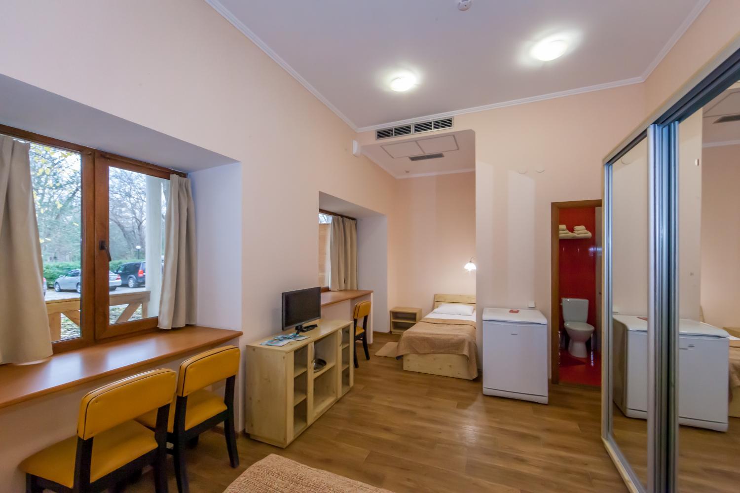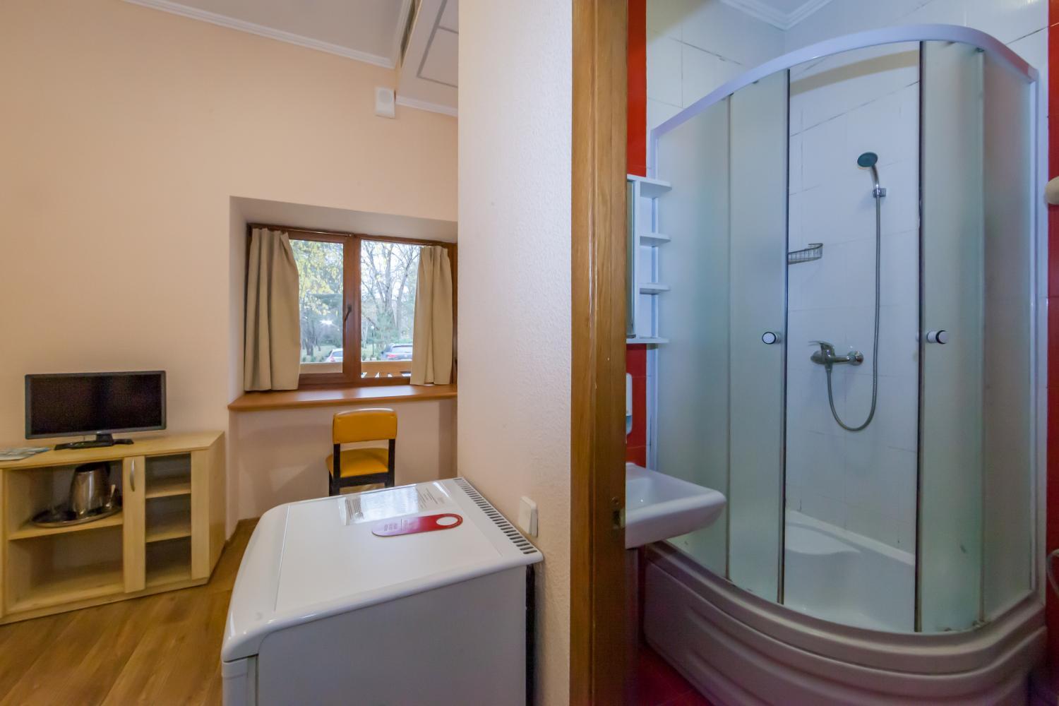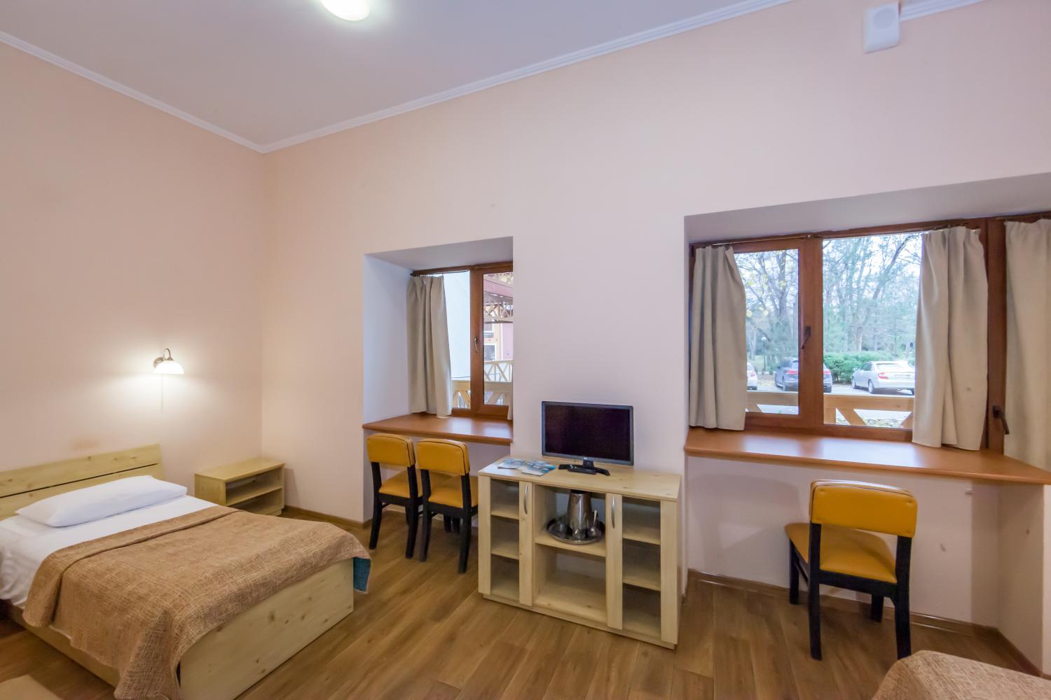 Площадь номера - 18 кв.м. 3 осн. места. Мебель: вешалка, зеркало, кровати односпальные, прикроватные тумбочки, стулья, тумба, шкаф. Оборудование: сплит-система, телевизор, холодильник, чайный набор посуды, электрочайник. Санузел: с душевой кабиной, туалетные принадлежности, фен. Сервис: Wi-Fi бесплатно, смена полотенец, смена постельного белья, уборка номера.