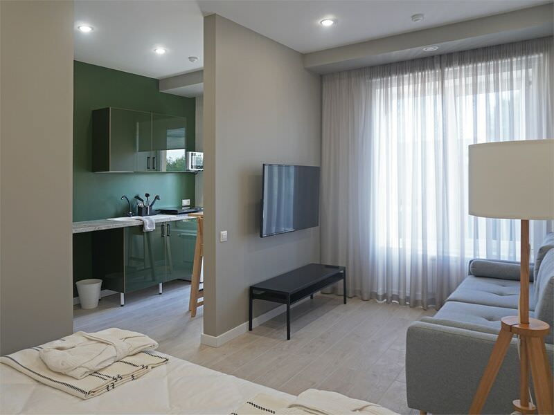 Площадь номера - 27 кв.м.; В номере: Кондиционер, Телевизор, Телефон, Кабельное/спутниковое/цифровое телевидение, Тапочки, Кухня, Халат, Фен, Набор косметики (туалетные принадлежности), Душ/душевая кабинка, Раздельные кровати, Туалет в номере, Тумбочка, Шкаф, Чайник, Набор посуды, Микроволновая печь; Макс. кол-во гостей - 2