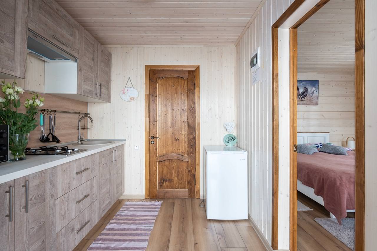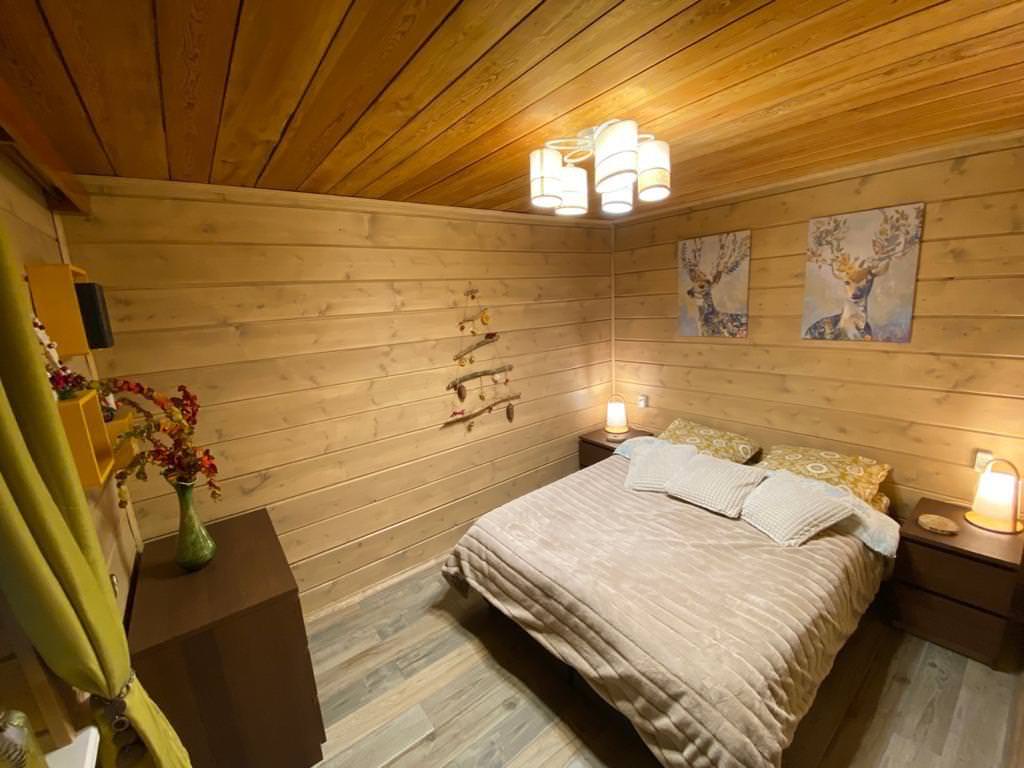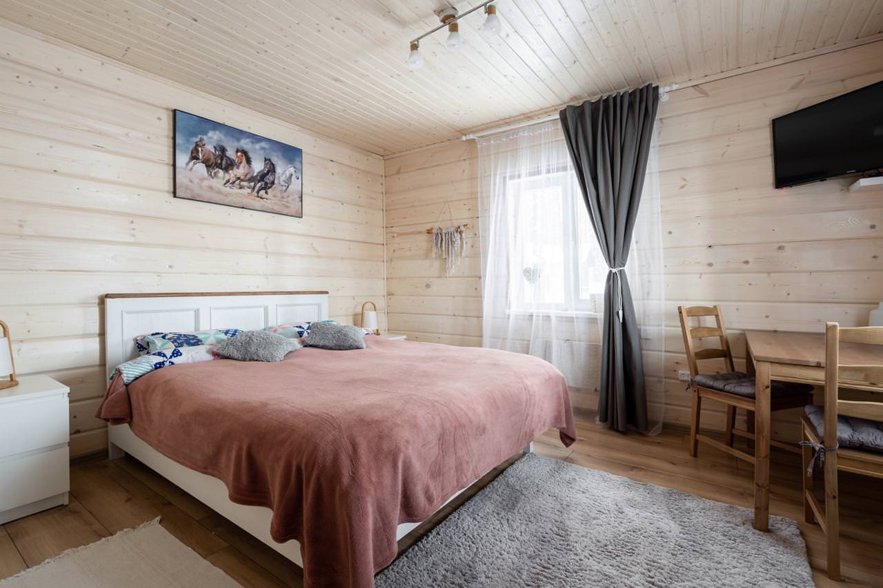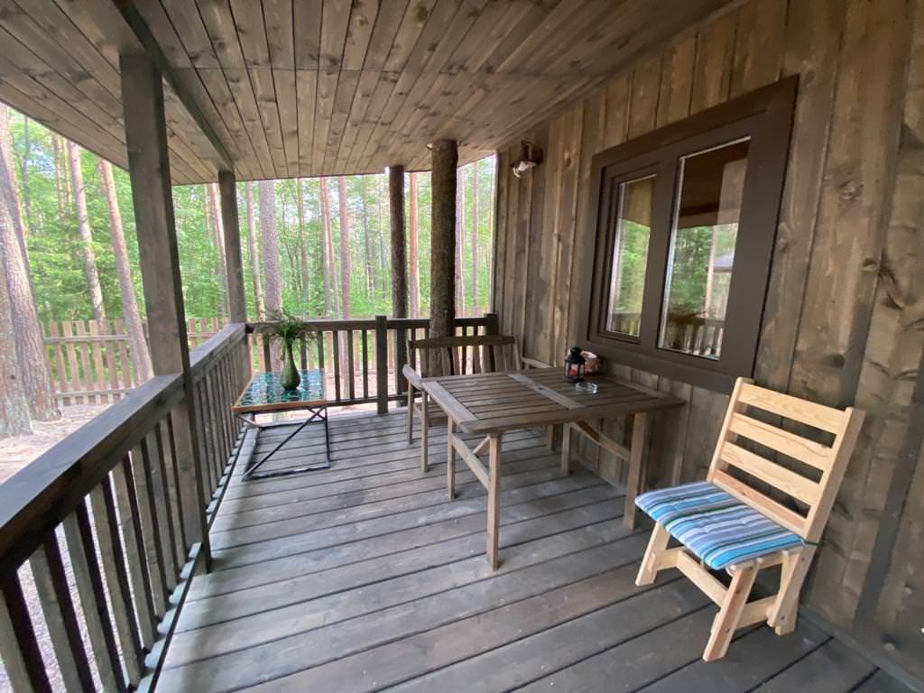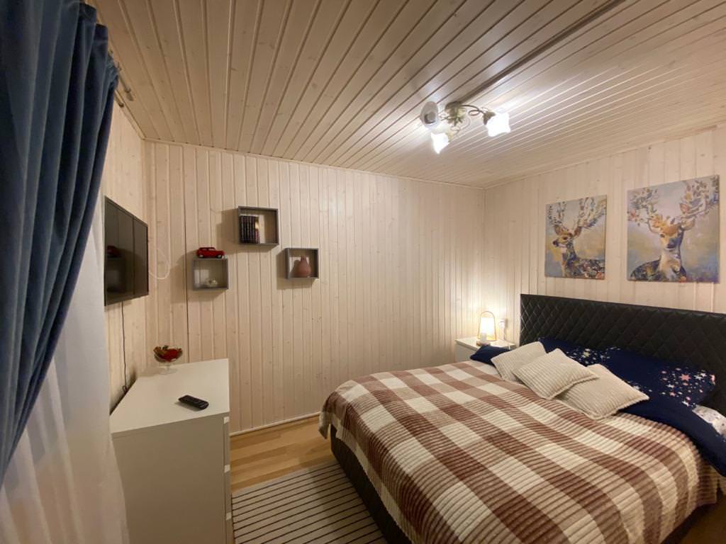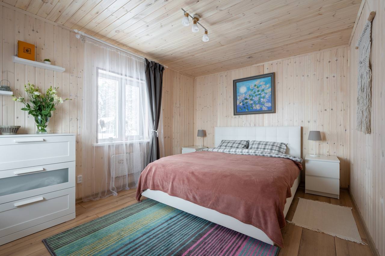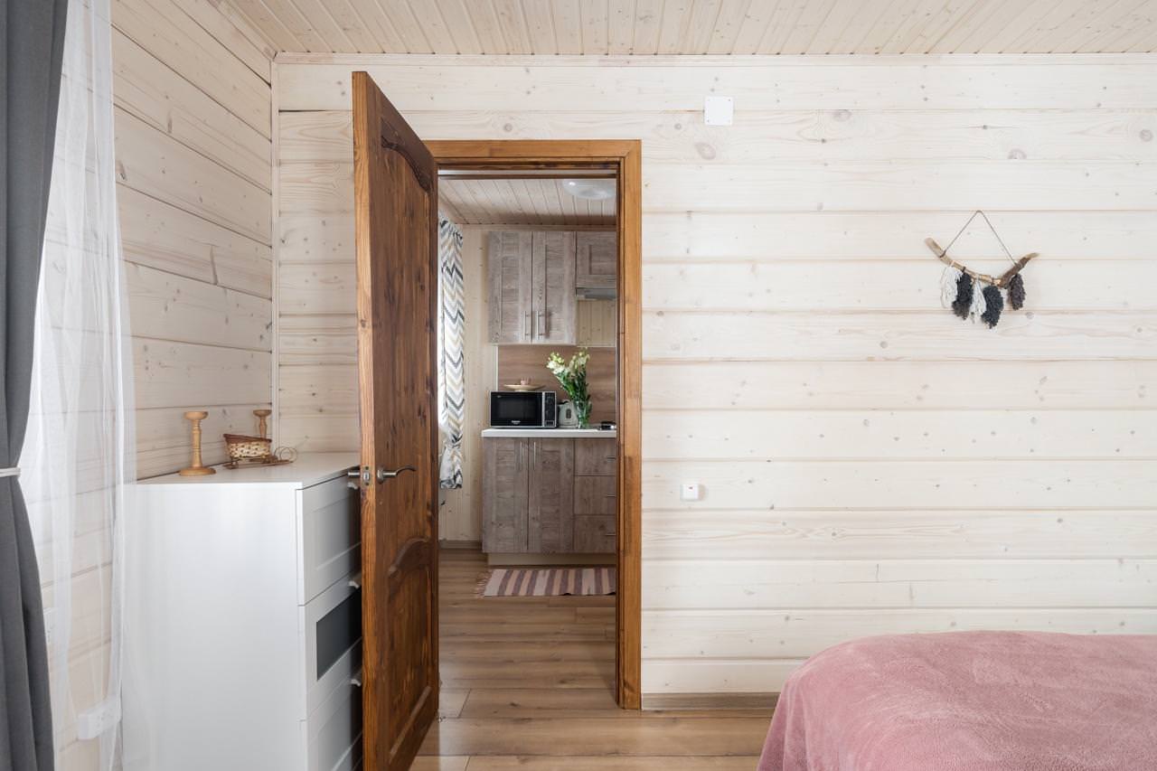 Уютный деревянный дом готов вместить гостей до 5 человек включительно. В доме расположены 2 спальни с односпальными кроватями, по запросу гостей возможно двуспальное размещение, встроенная кухня, ванная комната с горячей водой и большой террасой. Дом был построен в марте 2020 года, в нем предусмотрено теплые полы и электро-обогреватели. Для гостей данного дома также доступна беседка под открытым небом рядом с домом. Постельное белье включено в стоимость проживания. На берегу гости могут бесплатно воспользоваться зоной мангала и барбекю.