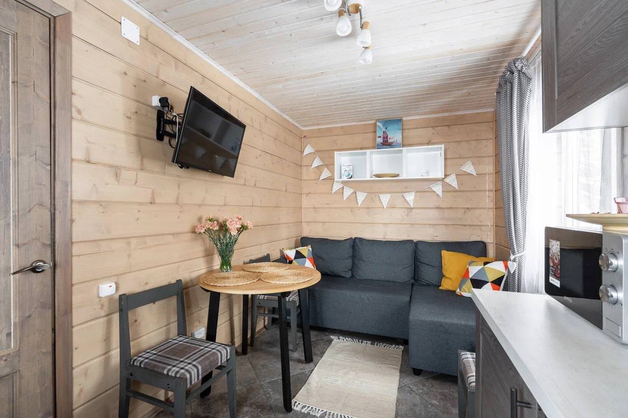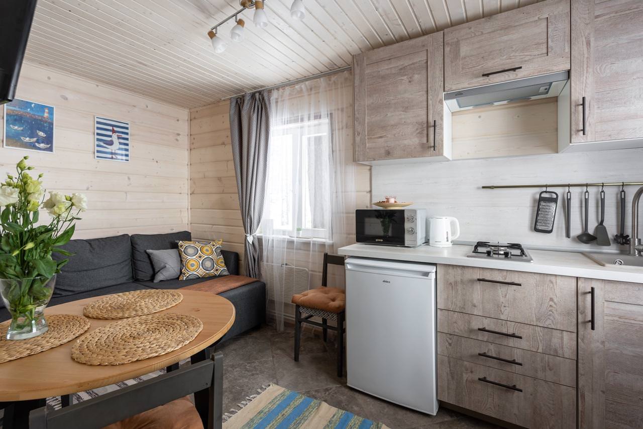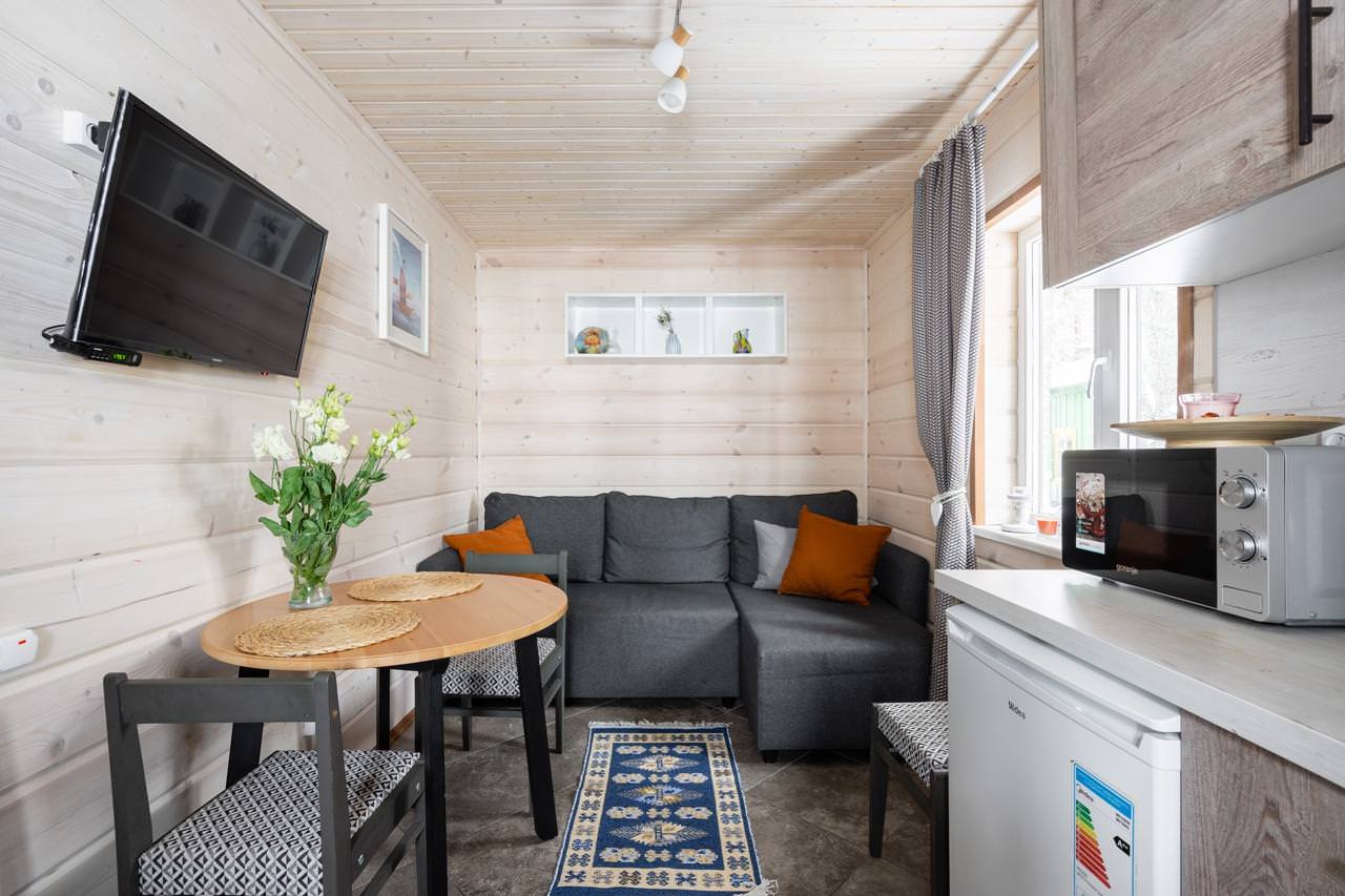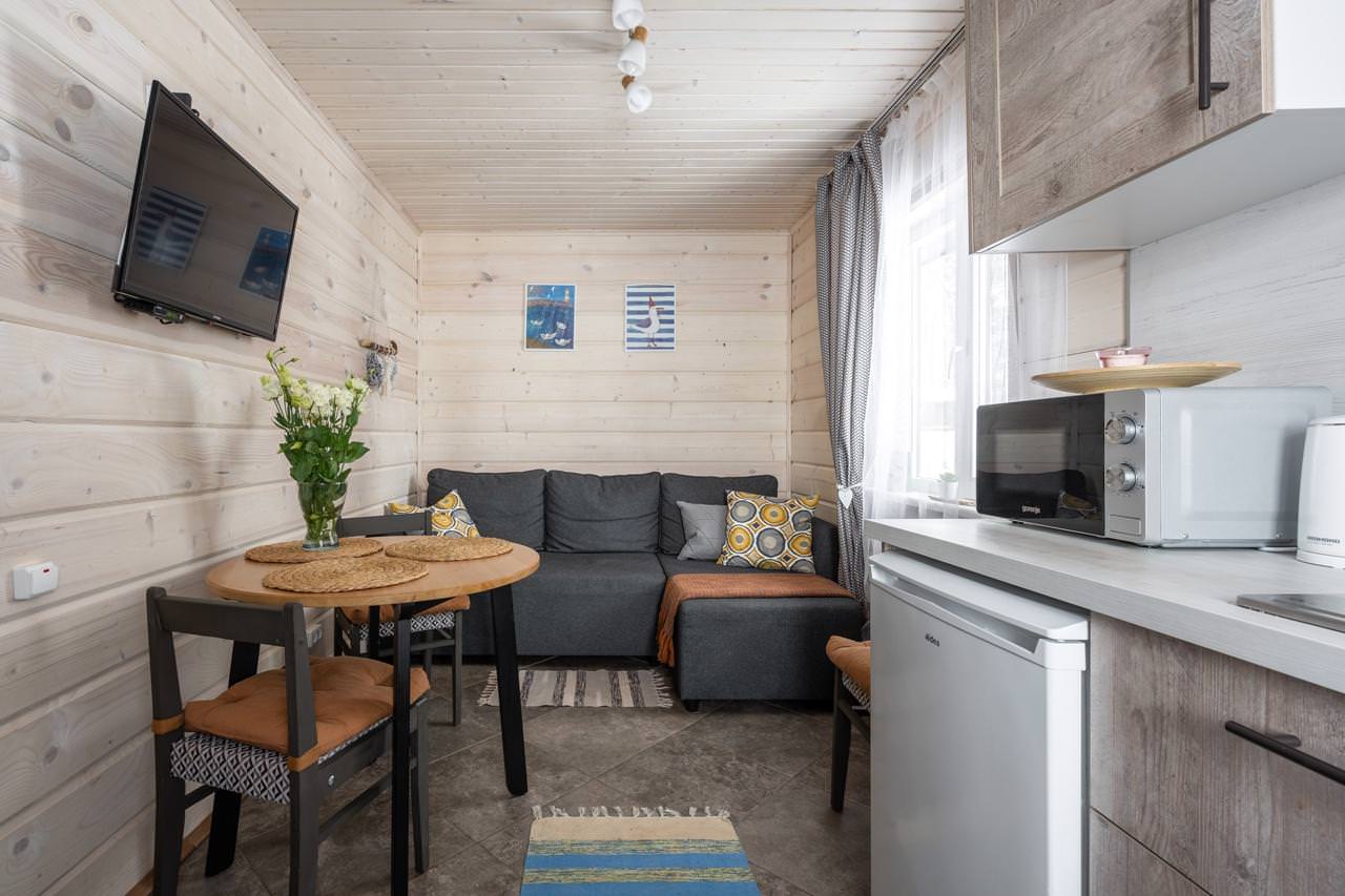 Дом у моря типа «Комфорт» из экологически чистых материалов идеально подойдет для аренды семьёй или небольшой компанией, желающей провести время на свежем воздухе в домашней атмосфере. К услугам гостей уютная спальня с двумя односпальными кроватями, которые при желании можно объединить. Гостиная домика совмещена с кухней, представляя собой студию, где также есть дополнительное спальное место (двуспальный диван), полностью оборудованная кухня с холодильником, микроволновой печью, электрическим чайником и посудой. В домике собственный санузел с душевой кабиной и стиральной машиной. Дом у моря отапливается с помощью электрообогревателей и теплых полов. Рядом с домиком находится зона барбекю (мангал), а на уличной террасе можно насладиться закатами и шумом моря.