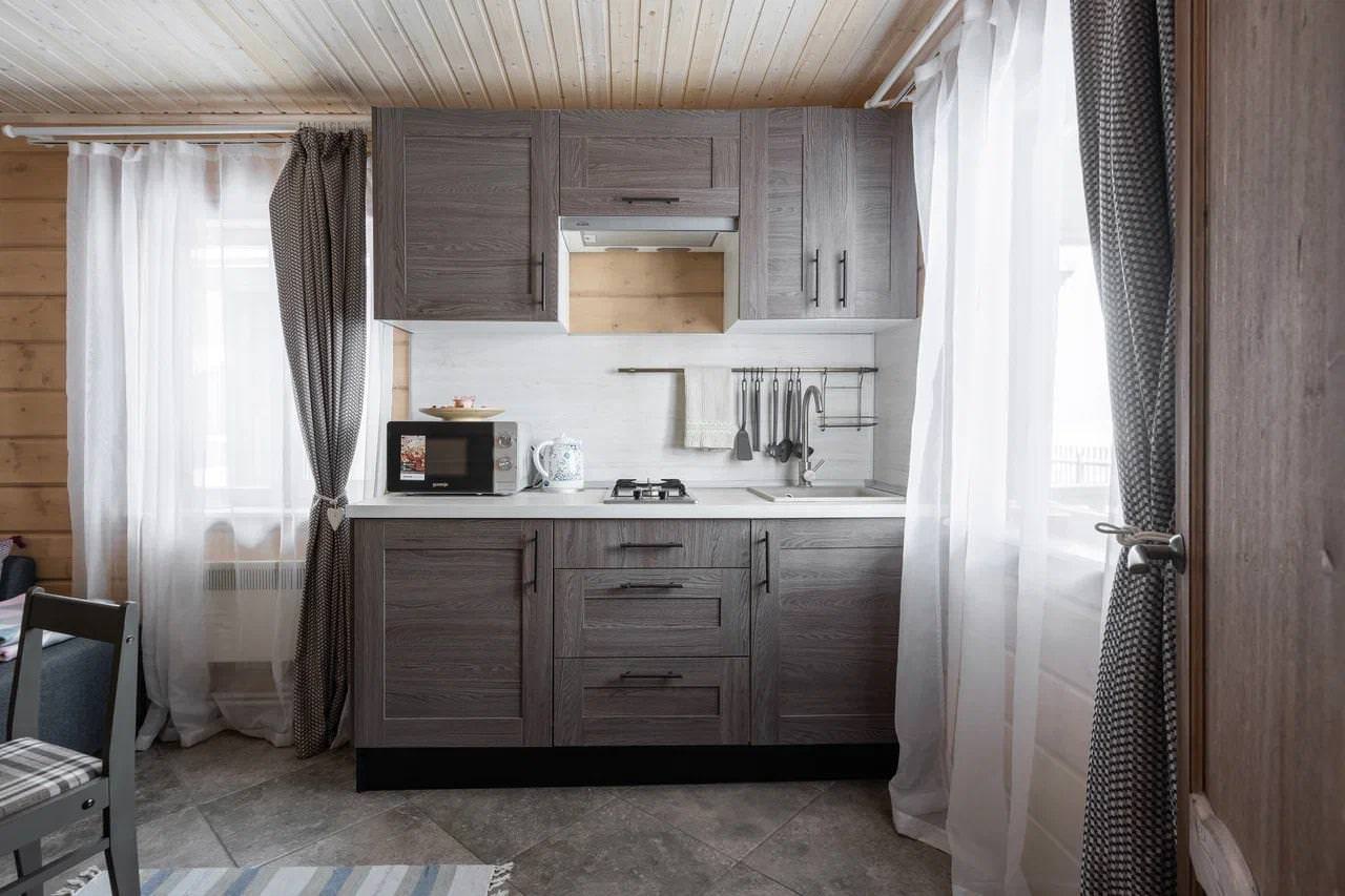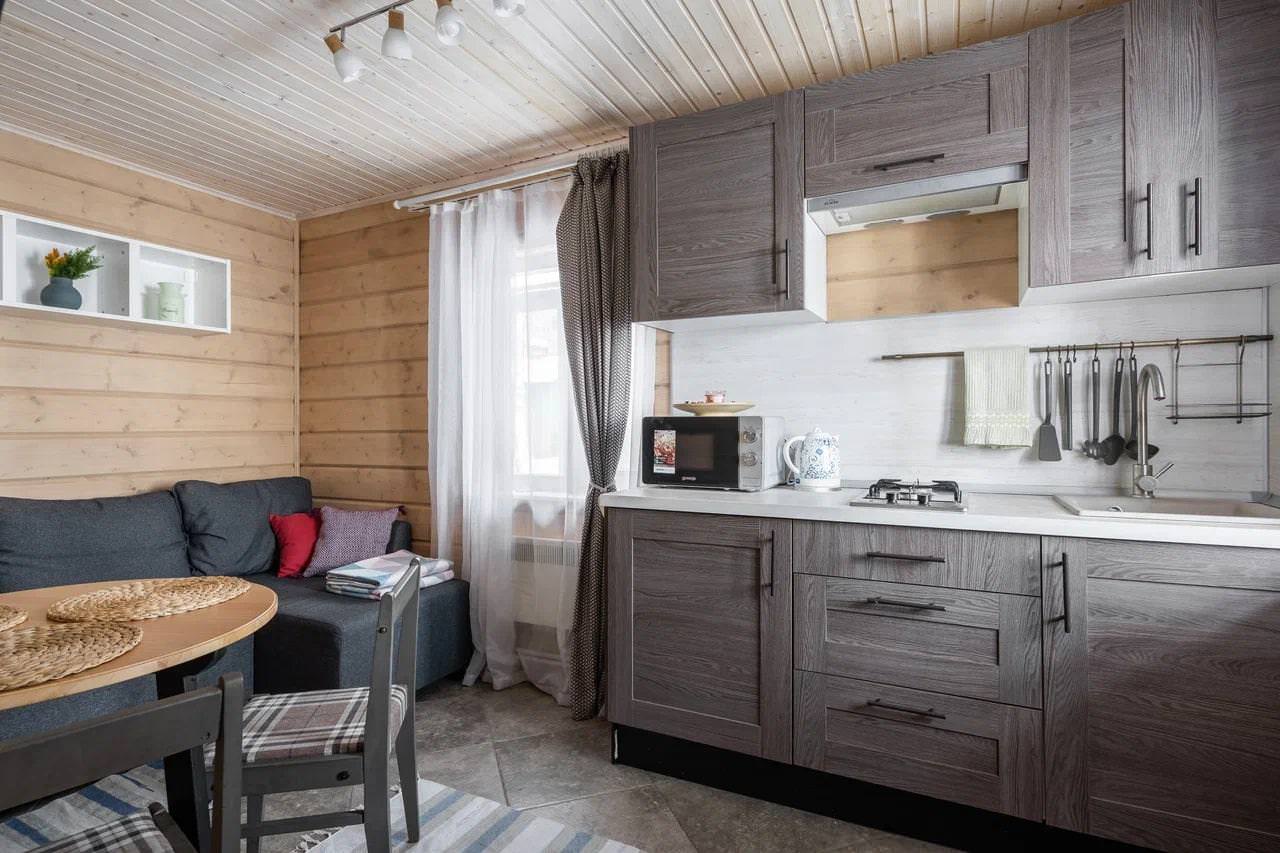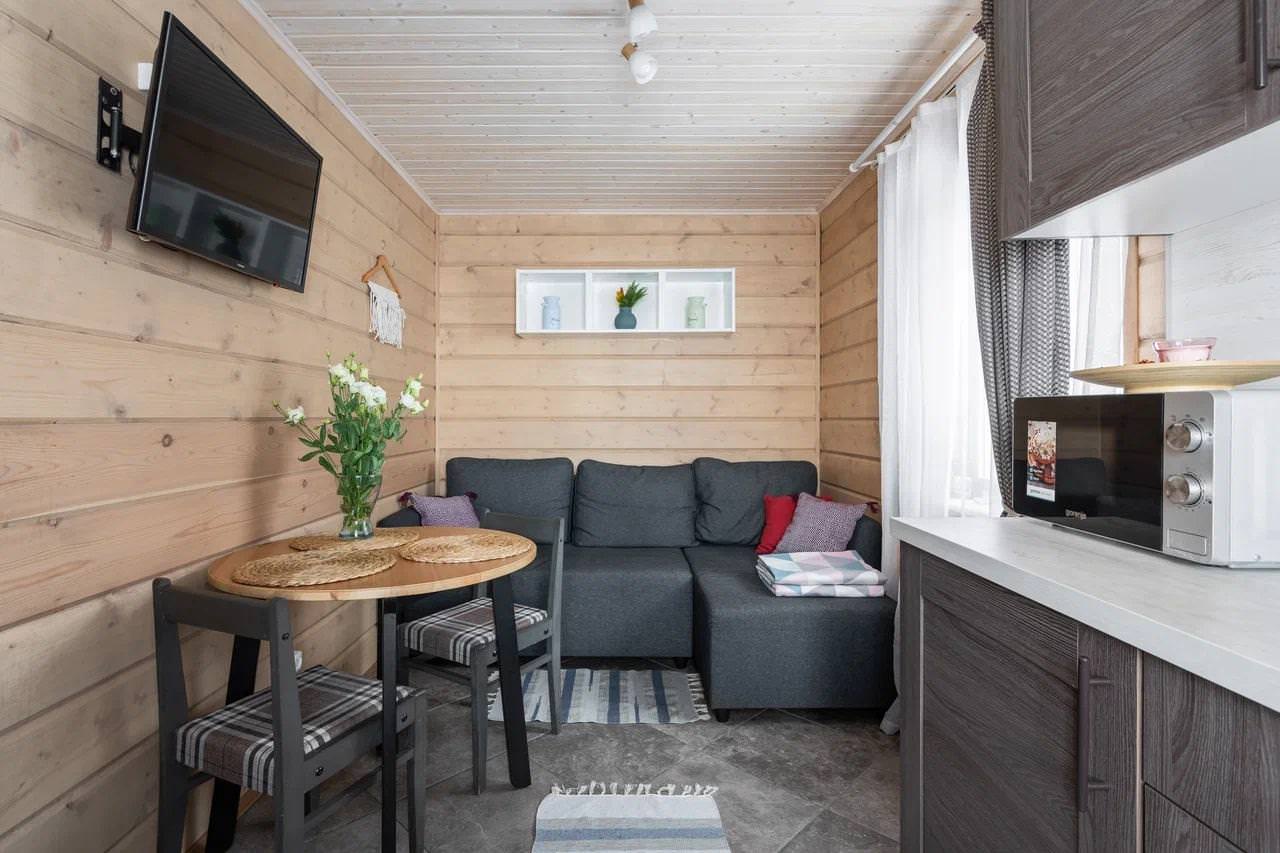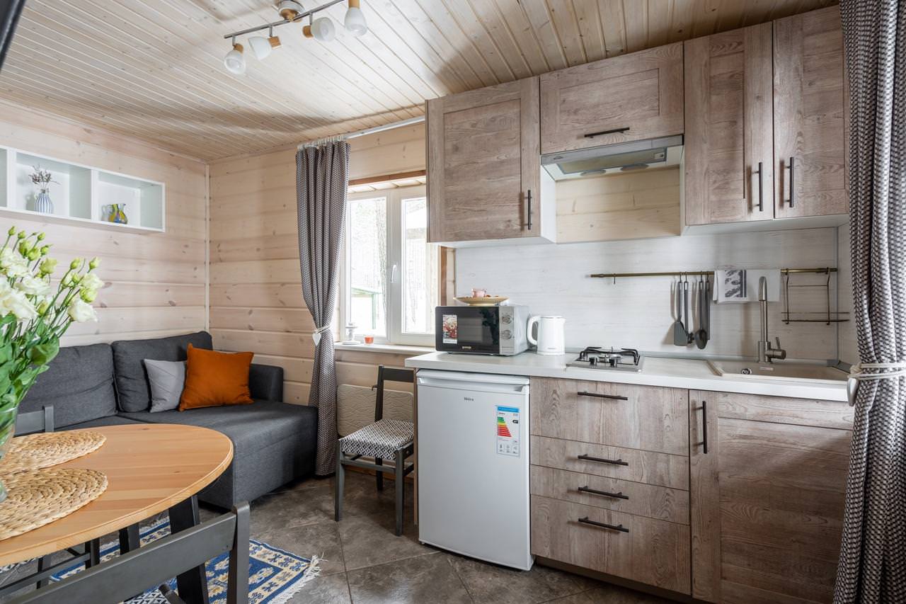 Дом у моря типа «Комфорт» из экологически чистых материалов идеально подойдет для аренды семьёй или небольшой компанией, желающей провести время на свежем воздухе в домашней атмосфере. К услугам гостей уютная спальня с двумя односпальными кроватями, которые при желании можно объединить. Гостиная домика совмещена с кухней, представляя собой студию, где также есть дополнительное спальное место (двуспальный диван), полностью оборудованная кухня с холодильником, микроволновой печью, электрическим чайником и посудой. В домике собственный санузел с душевой кабиной и стиральной машиной. Дом у моря отапливается с помощью электрообогревателей и теплых полов. Рядом с домиком находится зона барбекю (мангал), а на уличной террасе можно насладиться закатами и шумом моря.