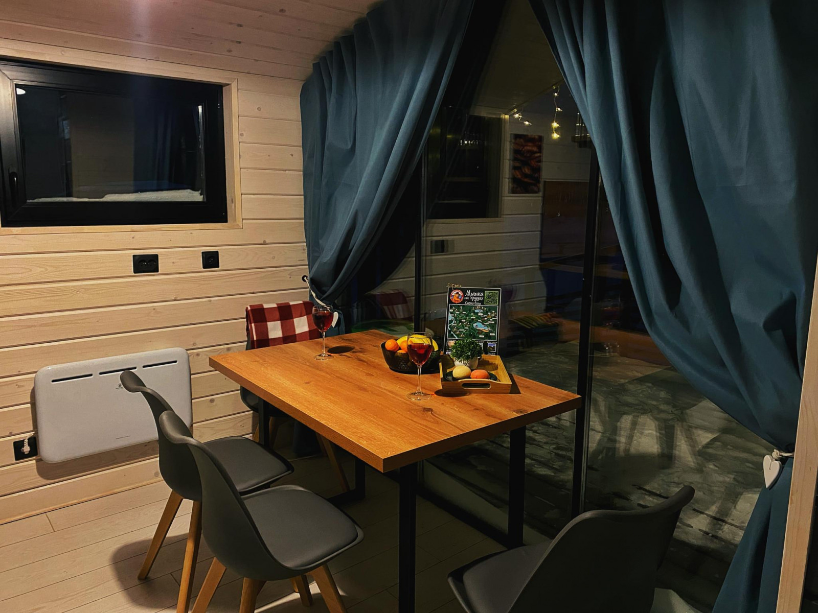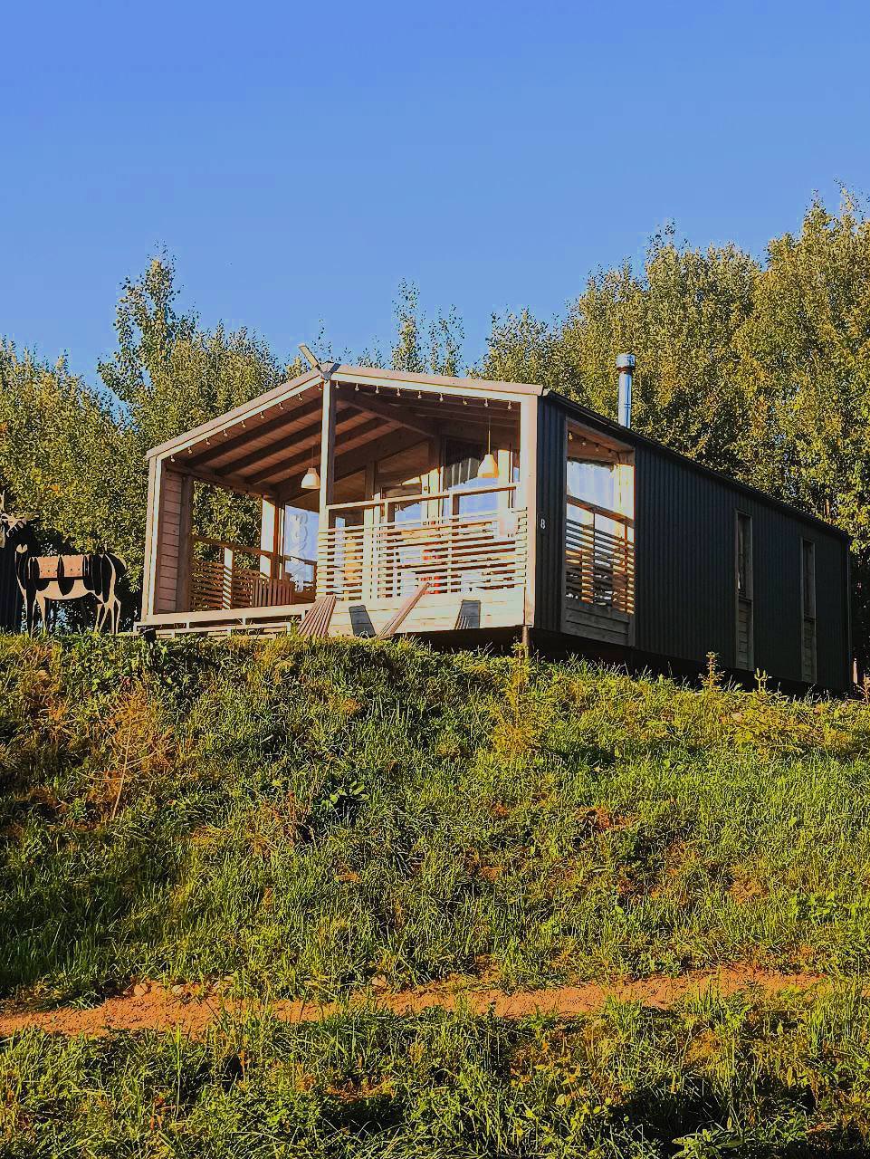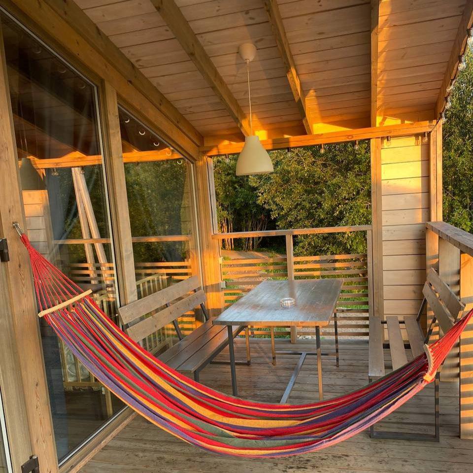 Дом имеет 2 изолированные спальни с панорамными окнами площадью по 9 кв.м. В каждой спальне двуспальная кровать, стеллаж под одежду, прикроватная лампа и шторы блэкаут. Просторная кухня -гостиная 21 кв.м с панорамным видом на террасу и удобным кухонным модулем включающий в себя: варочную панель, микроволновую печь, чайник, холодильник на 93л, раковину и посуду для приема и приготовления пищи на 6 гостей. В гостиной зоне расположен раскладной диван, обеденный стол и стулья, камин, плазменный телевизор и игровая приставка Денди. Небольшой санузел в котором уместилось все необходимое: Ванная/ душевая кабина, унитаз, раковина на тумбе с зеркалом, фен, гигиенические принадлежности и средства, по 2 полотенца на каждого гостя. Все комнаты оснащены москитными сетками. Терраса с панорамным видам в кронах молодых осин. Терраса площадью 15 кв.м оборудована деревянным столом и скамейками со спинкой, гамаком, розетками и освещением по периметру и зонам. У каждого коттеджа расположена освещенная мангальная зона с уличной мебелью, пространство зонировано ландшафтом и растениями.