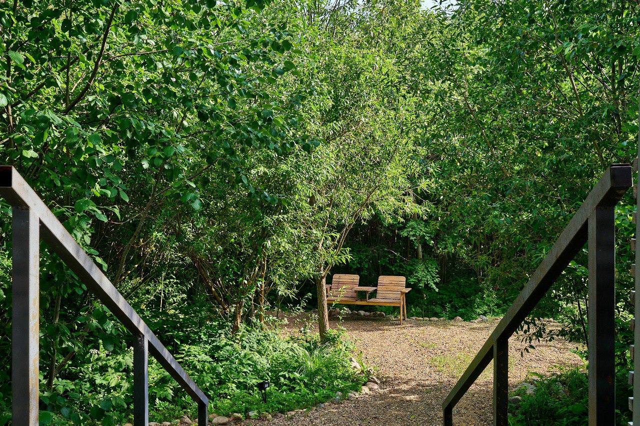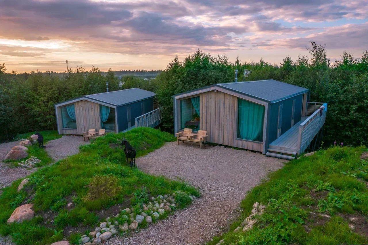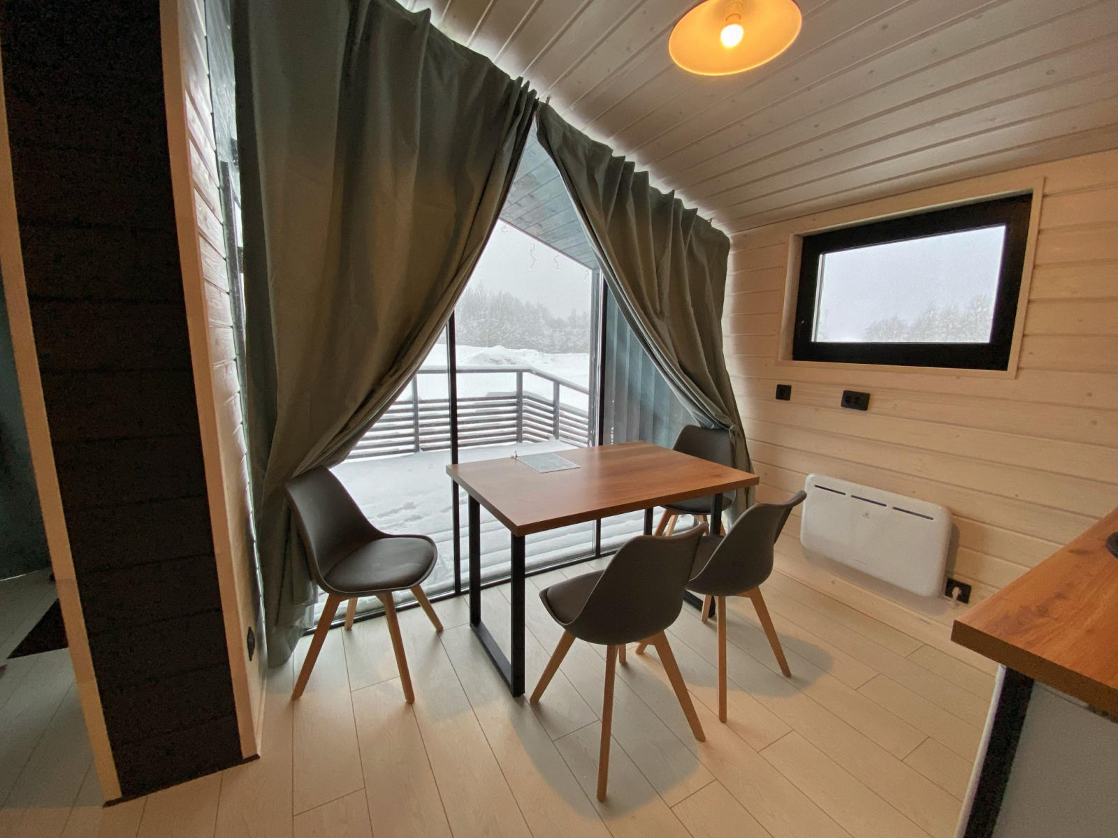 Дом имеет 2 изолированные спальни с панорамными окнами площадью по 9 кв.м. В каждой спальне двуспальная кровать, стеллаж под одежду, прикроватная лампа и шторы блэкаут. Просторная кухня -гостиная 21 кв.м с панорамным видом на террасу и удобным кухонным модулем включающий в себя: варочную панель, микроволновую печь, чайник, холодильник на 93л, раковину и посуду для приема и приготовления пищи на 6 гостей. В гостиной зоне расположен раскладной диван, обеденный стол и стулья, камин, плазменный телевизор и игровая приставка Денди. Небольшой санузел в котором уместилось все необходимое: Ванная/ душевая кабина, унитаз, раковина на тумбе с зеркалом, фен, гигиенические принадлежности и средства, по 2 полотенца на каждого гостя. Все комнаты оснащены москитными сетками. Терраса с панорамным видам в кронах молодых осин. Терраса площадью 15 кв.м оборудована деревянным столом и скамейками со спинкой, гамаком, розетками и освещением по периметру и зонам. У каждого коттеджа расположена освещенная мангальная зона с уличной мебелью, пространство зонировано ландшафтом и растениями.