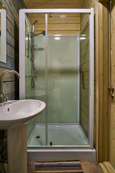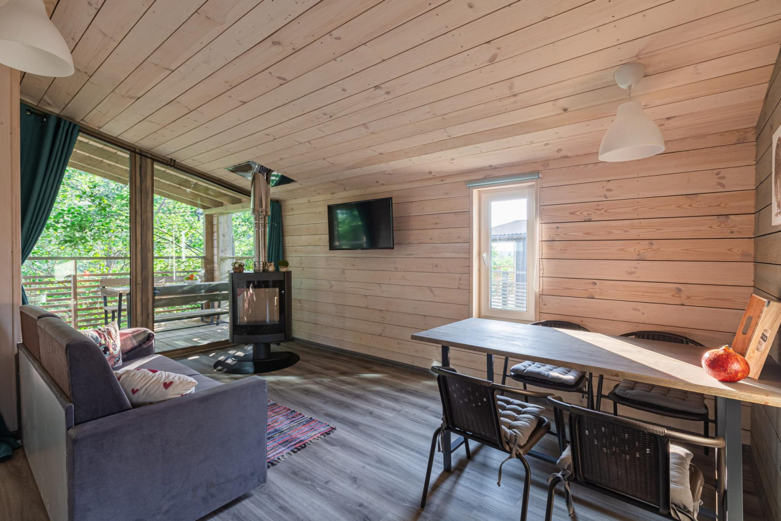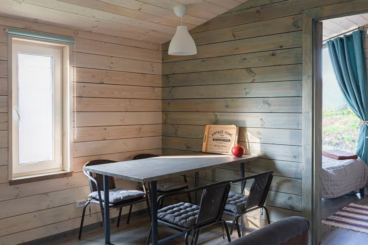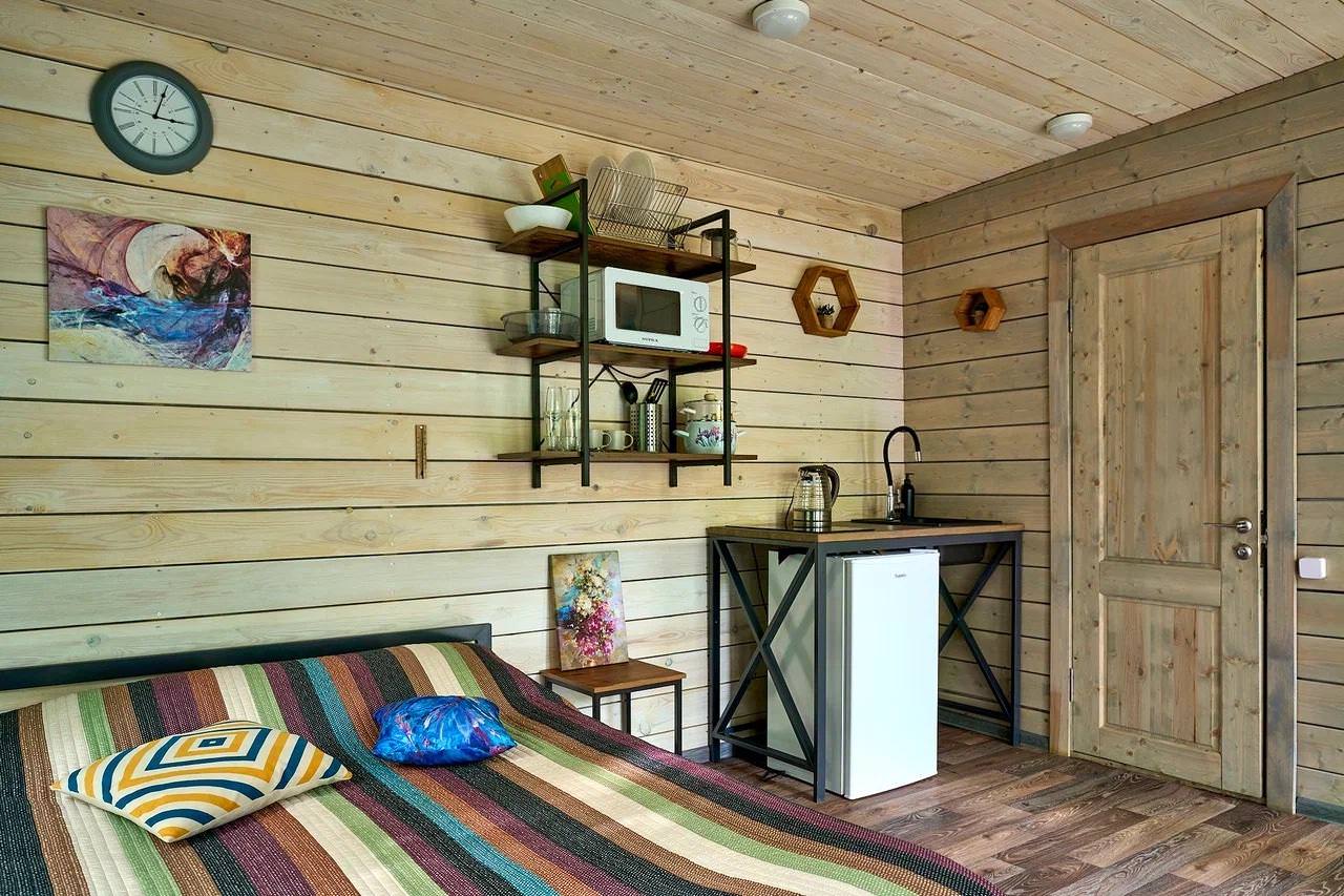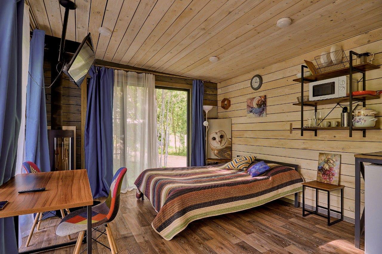 Коттедж имеет 1 изолированную спальную комнату с панорамным остеклением. В спальне двуспальная кровать, стеллаж для одежды, ночная лампа, шторы блэкаут. Просторная кухня-гостиная с панорамным видом на террасу и удобным кухонным модулем, включающем в себя: варочную панель, микроволновую печь, чайник, холодильник, раковину и посуду для приема и приготовления пищи на 4 гостей. В гостиной зоне расположен раскладной диван, обеденный стол и стулья, камин, плазменный телевизор. Коттедж отапливается настенными конвекторами установленными в каждой зоне дома. Все комнаты оснащены москитными сетками. Небольшой санузел, в котором уместилось все необходимое: ванная/душевая кабина, унитаз, раковина на тумбе с зеркалом, теплый пол, фен, гигиенические принадлежности (крем-мыло для рук в дозаторе, гель-шампунь в дозаторе, туалетная бумага, тапочки, полотенца). Каждому гостю предоставляется 2 полотенца. Терраса площадью 12м2 оборудована деревянным столом и скамейками со спинкой, гамаком, розетками и освещением по периметру и зонам. С террасы открывается панорамный вид на берег пруда. У каждого коттеджа расположена освещенная мангальная зона с уличной мебелью.