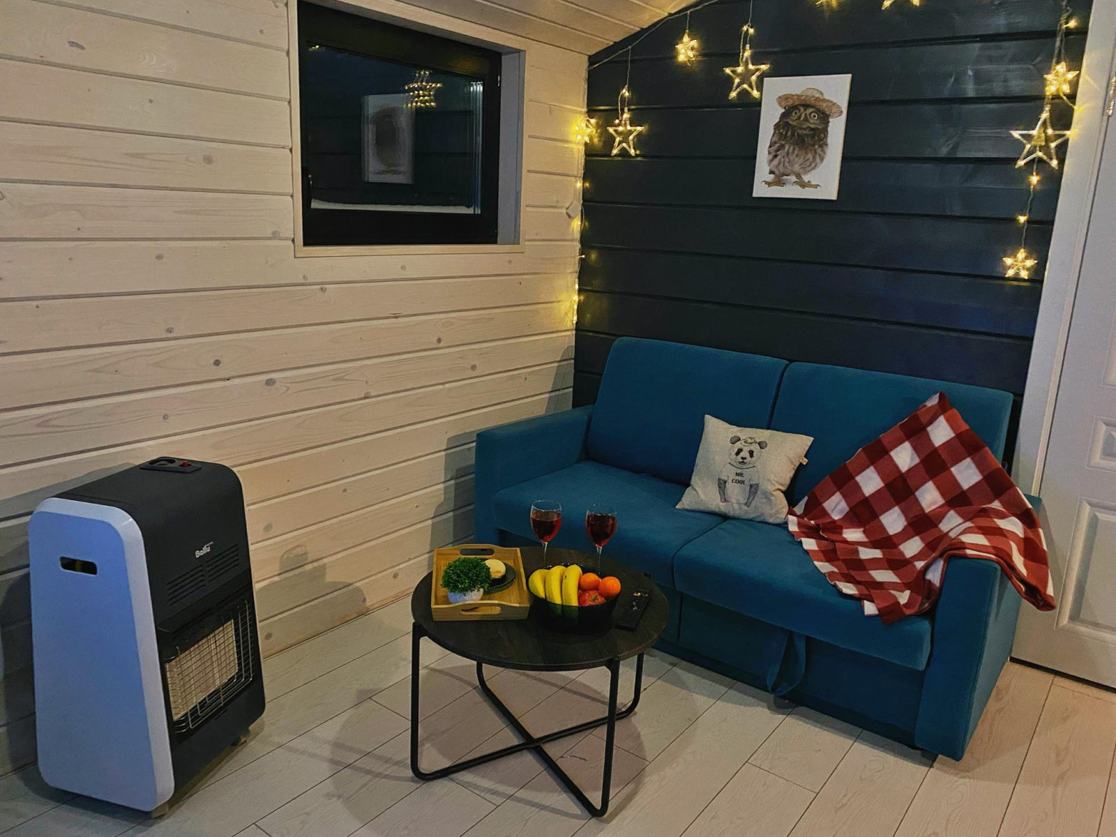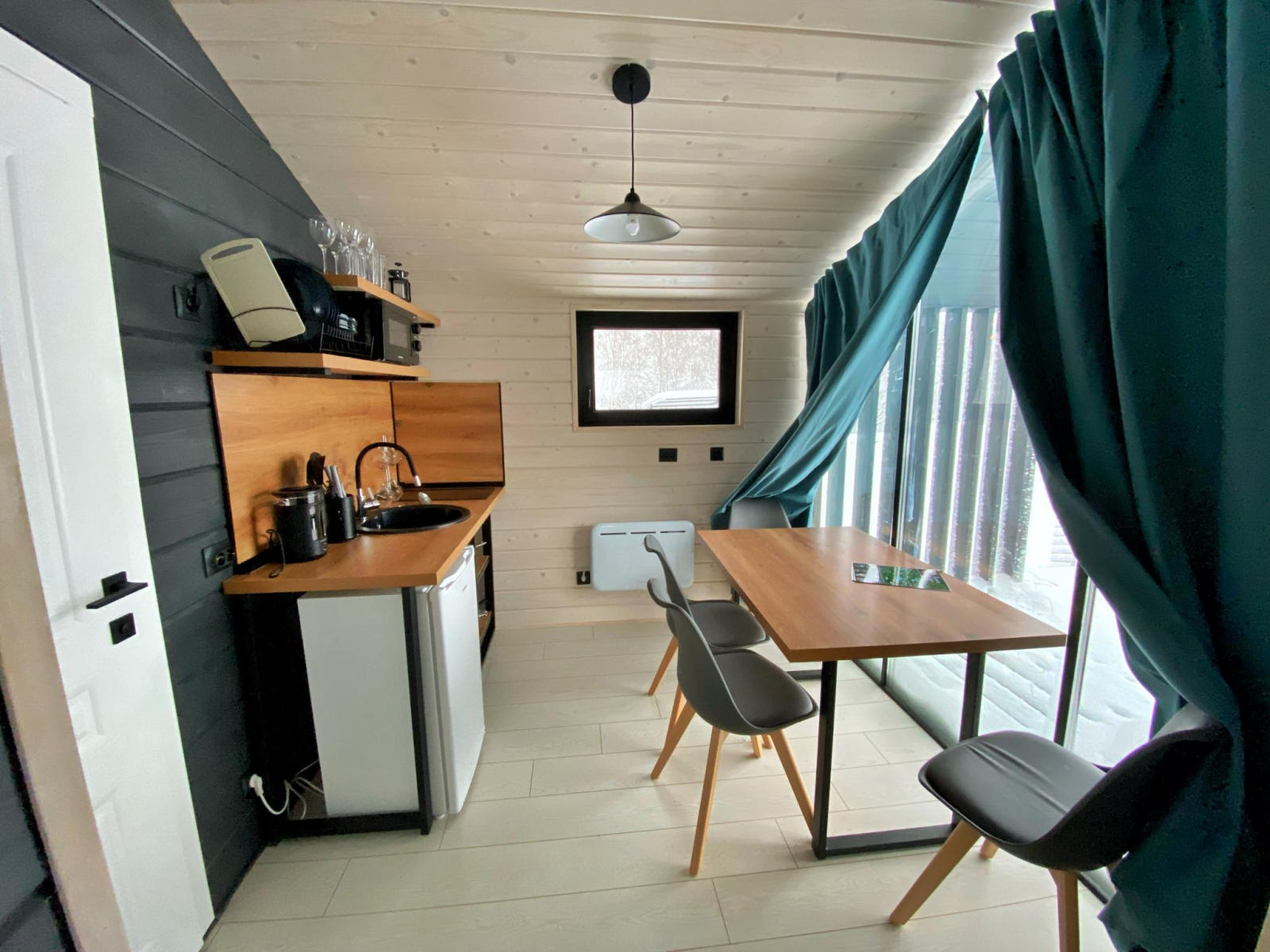 Просторная студия 20 кв.м с панорамным видом на террасу и удобным кухонным модулем включающий в себя: варочную панель, микроволновую печь, чайник, холодильник на 93л, раковину и посуду для приема и приготовления пищи на 2 гостя. В гостиной зоне расположен обеденный стол и стулья, камин, плазменный телевизор. Двуспальная кровать и шторы блэкаут помогут отдохнуть и набраться сил. Небольшой санузел в котором уместилось все необходимое: Ванная/ душевая кабина, унитаз, раковина на пьедестале с зеркалом, фен, гигиенические принадлежности и средства, 2 полотенца на каждого гостя. Коттедж отапливается настенными конвекторами установленными в каждой зоне дома. Установлены москитные сетки. Терраса с панорамным видом на лес и зону барбекю, площадью 10 кв.м оборудована деревянным столом и скамейками со спинкой, розетками и освещением по периметру и зонам. У каждого коттеджа расположена освещенная мангальная зона и уличной мебелью, пространство зонировано ландшафтом и растениями.