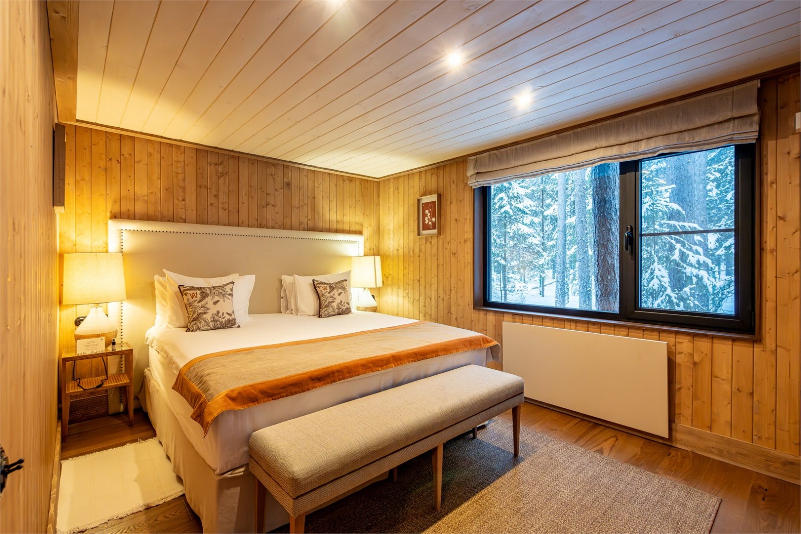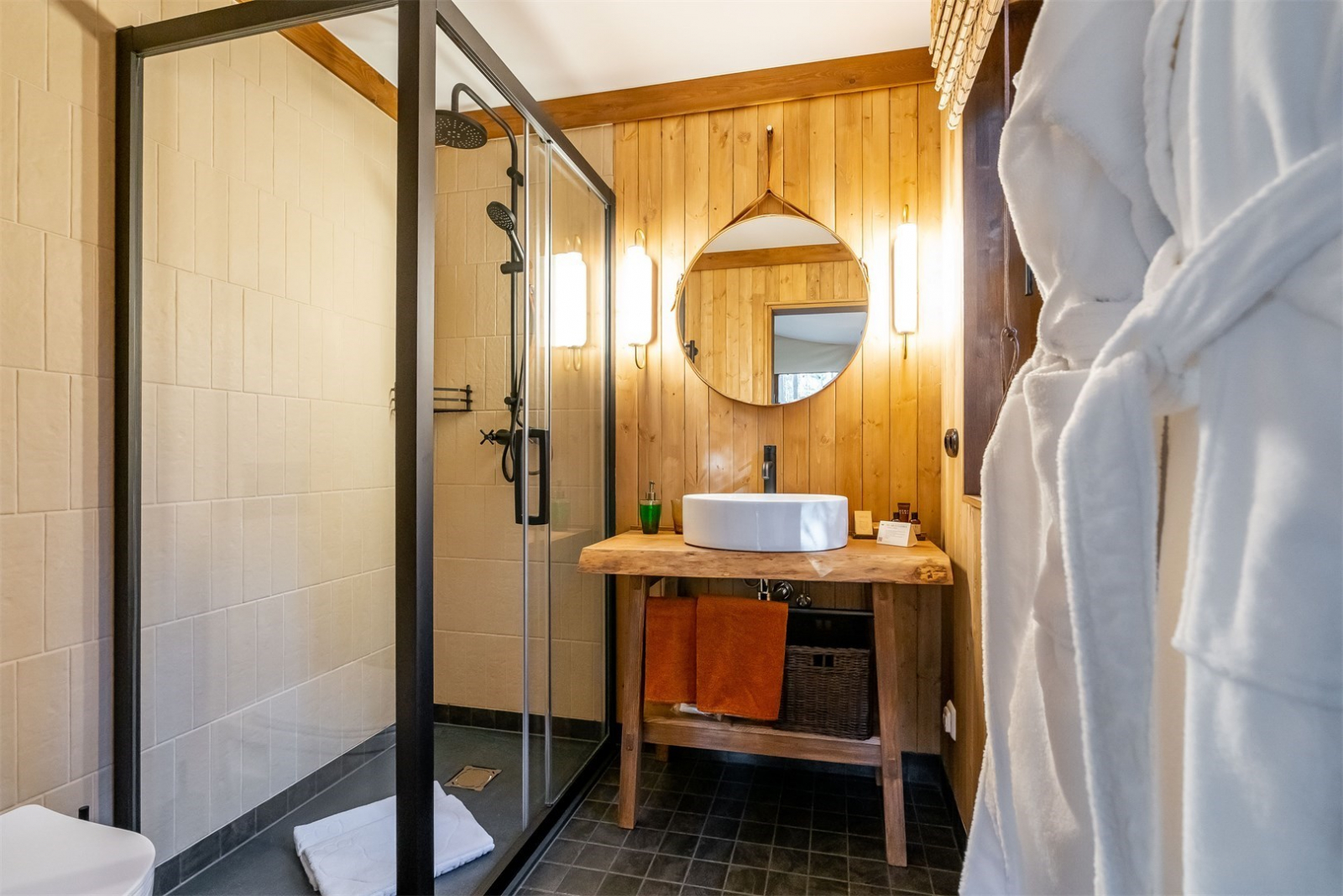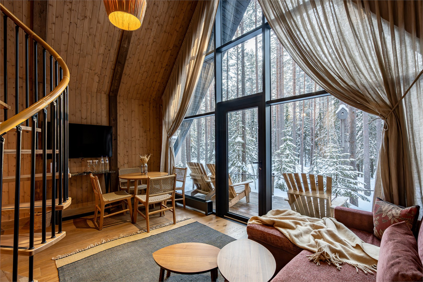 Большой деревянный лодж в лесу с панорамными окнами и 2 спальнями: с двуспальной кроватью или 2 отдельными (по запросу) на 1 этаже и двуспальной кроватью со вторым светом на 2 этаже. Гостиная оборудована проектором для просмотра коллекции фильмов, раскладным диваном, есть кухня и комфортная ванная комната. Просторная терраса с грилем и уличной мебелью для отдыха под открытым небом, а также собственная костровая зона с навесом для теплых посиделок у костра. Интерьер выполнен в стиле сафари: экологичные материалы, природные фактуры, натуральные цвета и яркие акценты. Размещение: 4 основных спальных места + доп.диван для ребёнка до 14 лет в гостиной. В стоимость проживания включено: завтрак, постельные принадлежности премиум класса, экокосметика, комплиментарная вода, кофе и набор чая. За дополнительную плату можно заказать room-service, гриль-сеты (мясо/рыба/птица) или инструменты для приготовления блюд в собственной зоне BBQ, мешок дров и угли, а также кино-сет. Время заезда — с 15:00 Время выезда — до 12:00