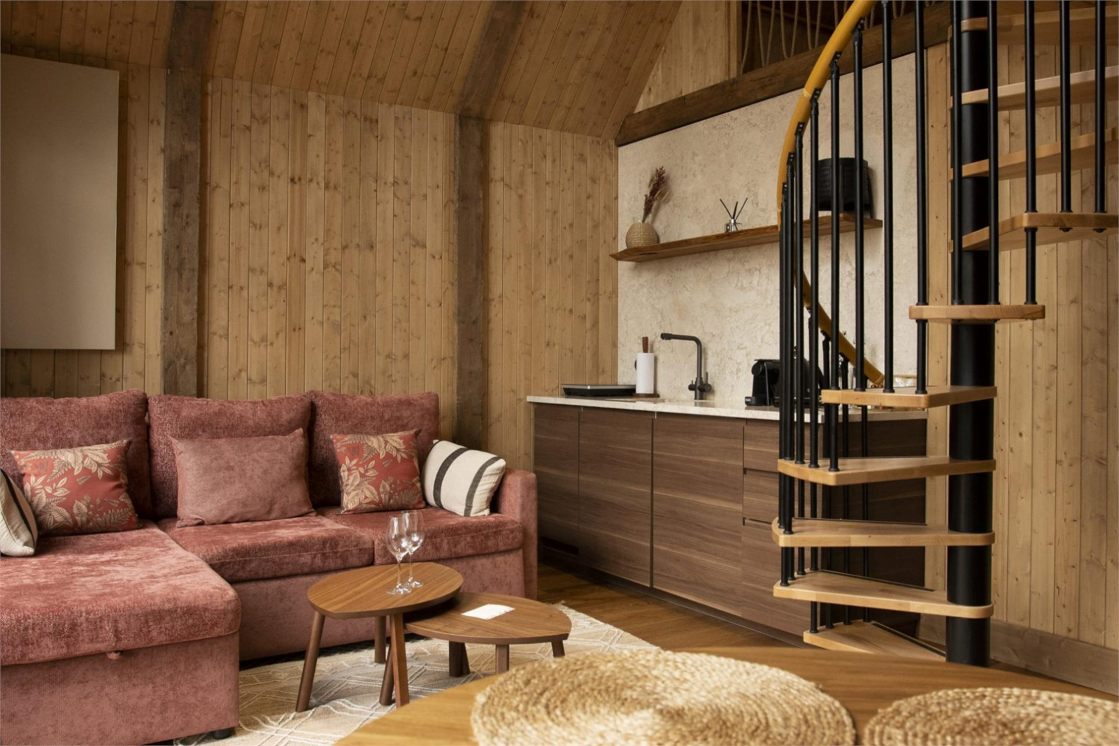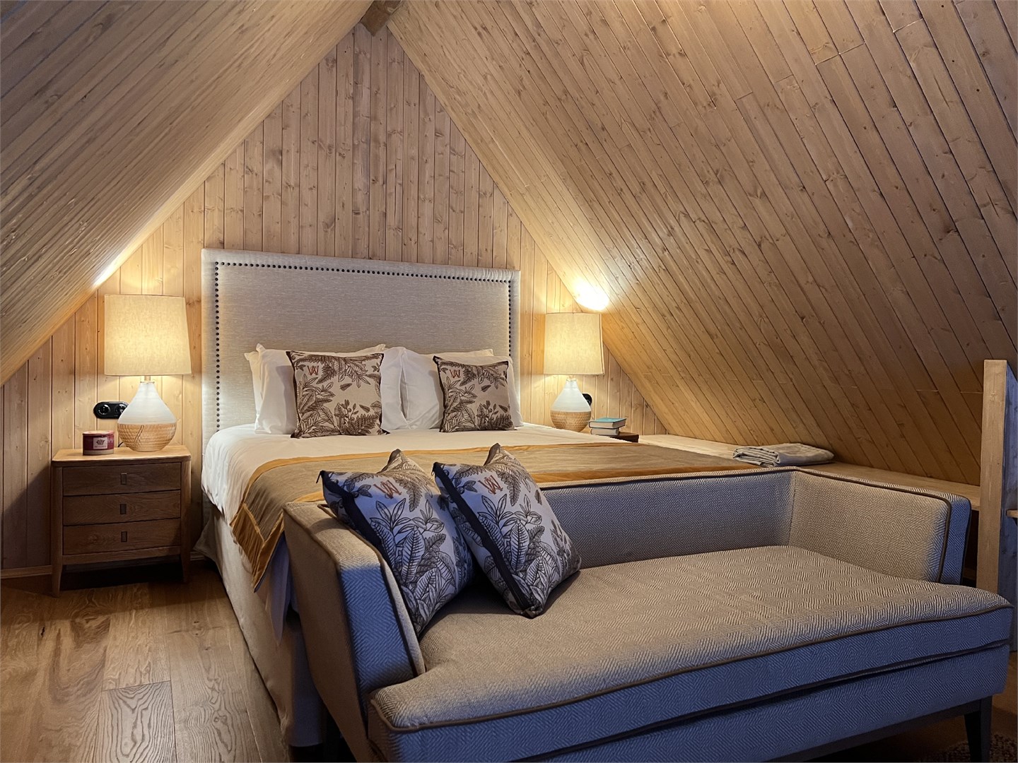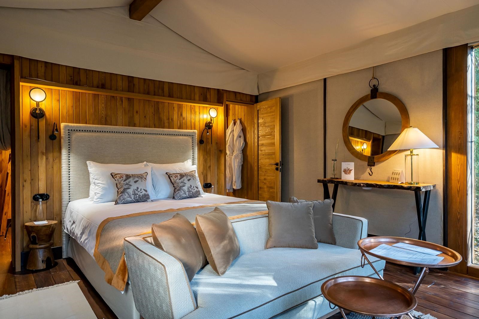 Большой деревянный лодж в лесу с панорамными окнами и 2 спальнями: с двуспальной кроватью или 2 отдельными (по запросу) на 1 этаже и двуспальной кроватью со вторым светом на 2 этаже. Гостиная оборудована проектором для просмотра коллекции фильмов, раскладным диваном, есть кухня и комфортная ванная комната. Просторная терраса с грилем и уличной мебелью для отдыха под открытым небом, а также собственная костровая зона с навесом для теплых посиделок у костра. Интерьер выполнен в стиле сафари: экологичные материалы, природные фактуры, натуральные цвета и яркие акценты. Размещение: 4 основных спальных места + доп.диван для ребёнка до 14 лет в гостиной. В стоимость проживания включено: завтрак, постельные принадлежности премиум класса, экокосметика, комплиментарная вода, кофе и набор чая. За дополнительную плату можно заказать room-service, гриль-сеты (мясо/рыба/птица) или инструменты для приготовления блюд в собственной зоне BBQ, мешок дров и угли, а также кино-сет. Время заезда — с 15:00 Время выезда — до 12:00