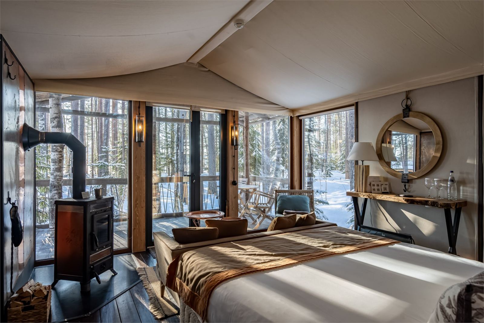 Деревянный лодж с печкой в хвойном лесу. Большая двуспальная кровать и комфортная ванная комната, отдельная гардеробная. Из панорамных окон открывается вид на озеро. Увеличенная терраса с уличной мебелью для завтраков под теплыми лучами солнца и отдыха под открытым небом. Интерьер выполнен в стиле сафари: экологичные материалы, природные фактуры, натуральные цвета и яркие акценты. Размещение: 1-2 гостя. В стоимость проживания включено: завтрак, постельные принадлежности премиум класса, экокосметика, вода, кофе и набор чая, проектор для просмотра фильмов на большом экране — лесной кинотеатр у вас в лодже, дрова для растопки печки. За дополнительную плату можно заказать room-service и кино-сет для просмотра фильмов. Время заезда — с 15:00 Время выезда — до 12:00